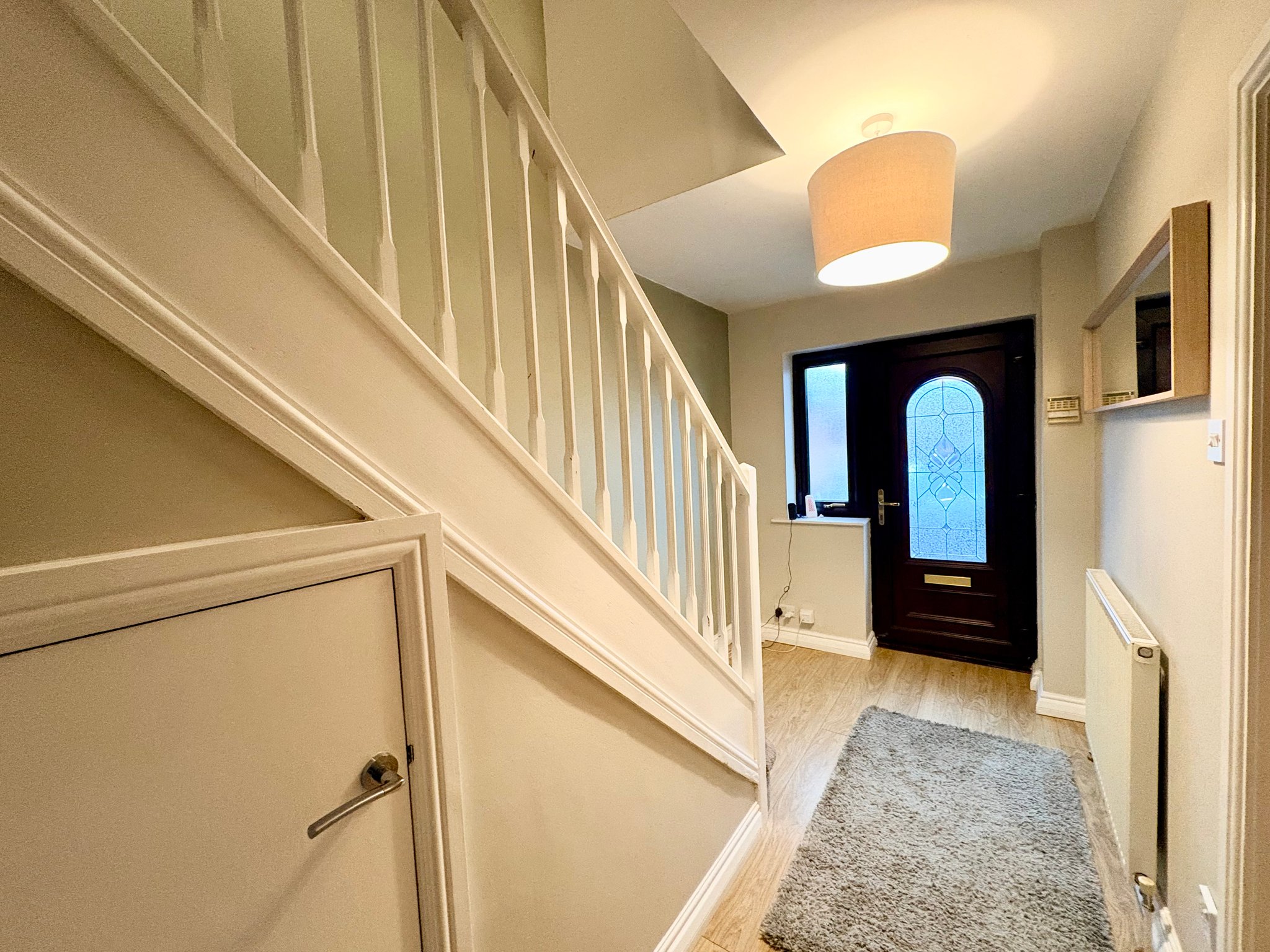 To the front of the property is a spacious entrance hall with wood-effect laminate flooring. There is a useful storage cupboard providing space for coats and shoes, along with a radiator and single pendant light fitting. The hallway gives access to the lounge, kitchen/breakfast room and stairs rising to the first-floor accommodation.