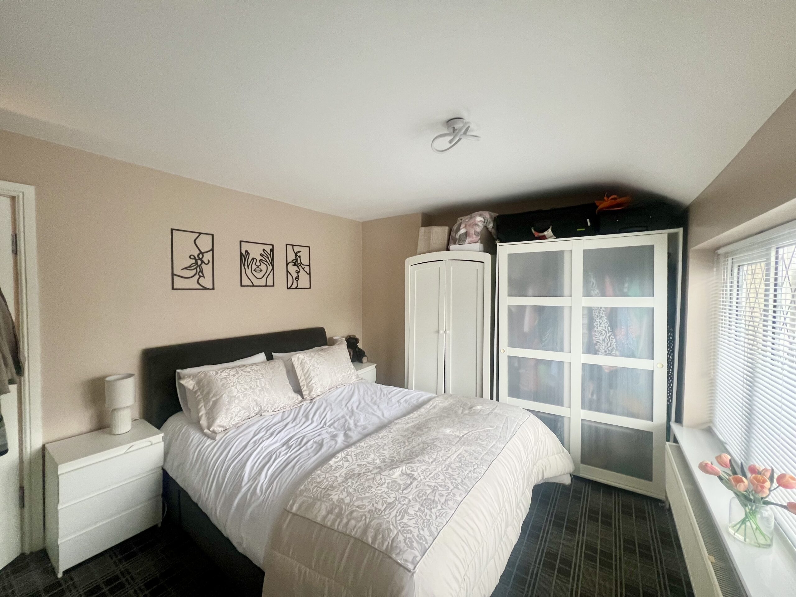 Principal bedroom positioned at the front of the property, enjoying an abundance of natural light from two