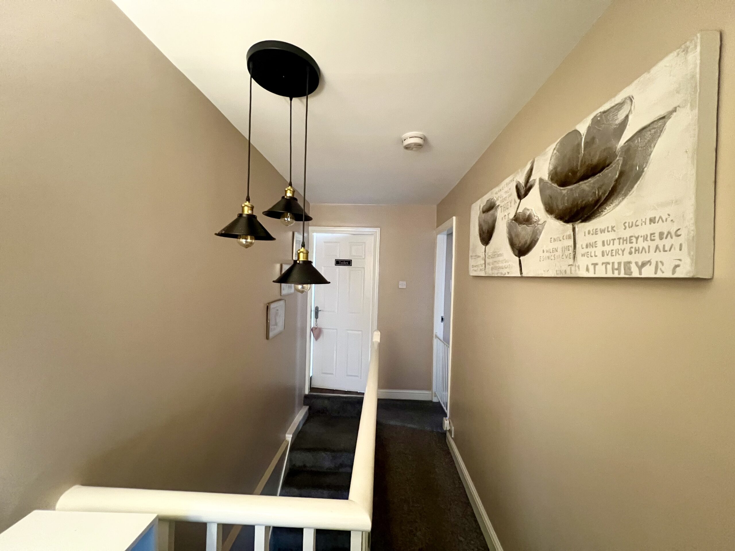 Beautiful landing enhanced by a stylish pendant light fitting and soft carpet underfoot, creating a warm and