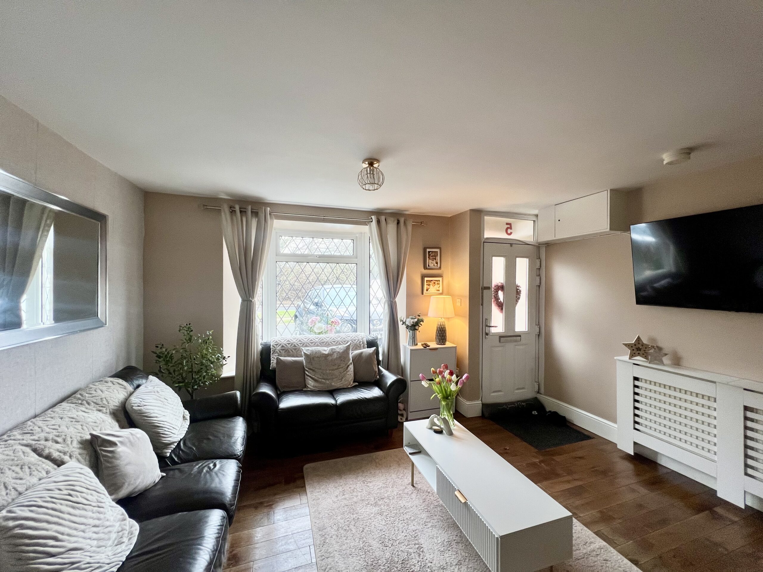 enhances the room’s inviting atmosphere. Featuring two radiators, a useful built-in storage cupboard and a