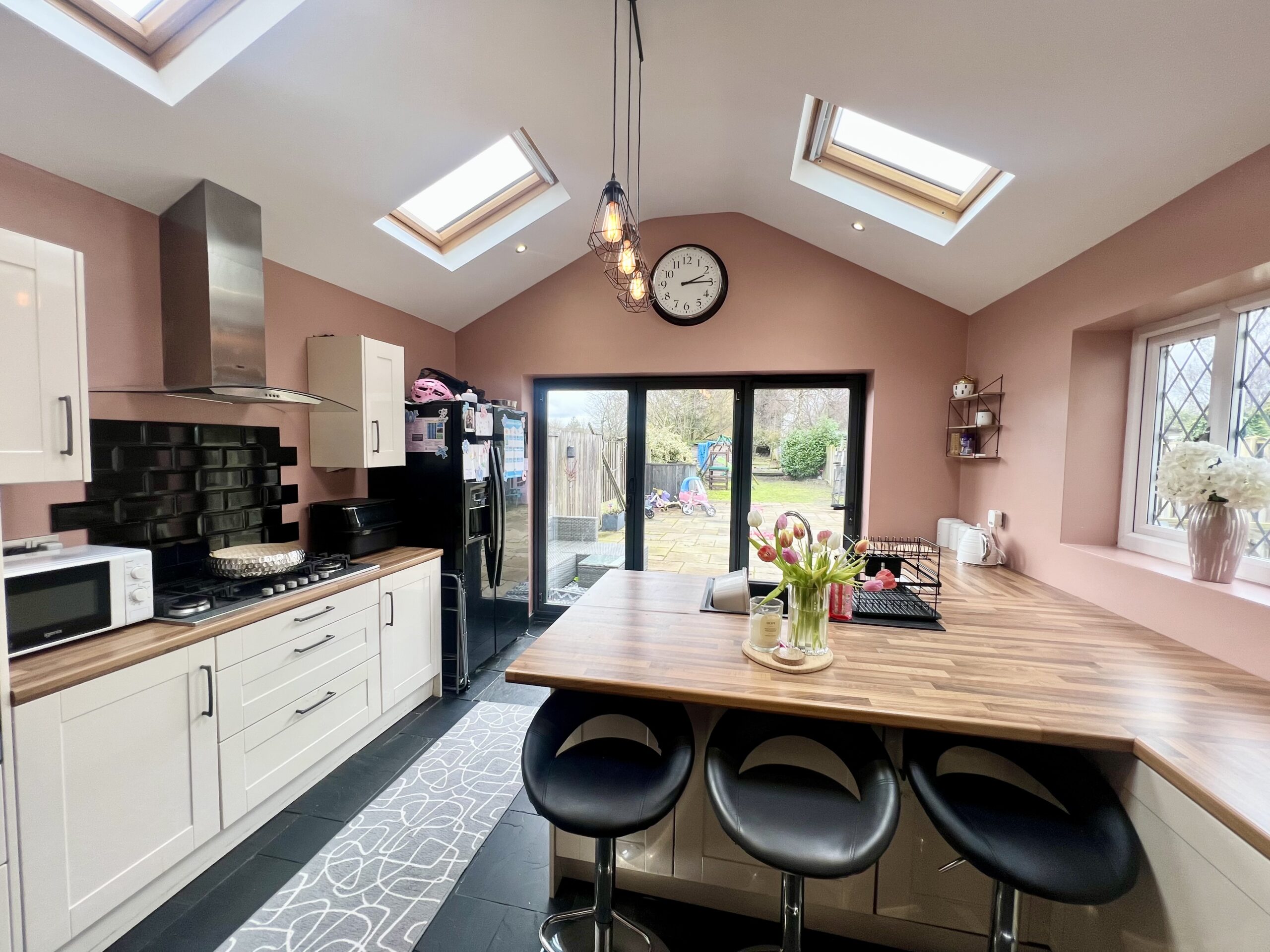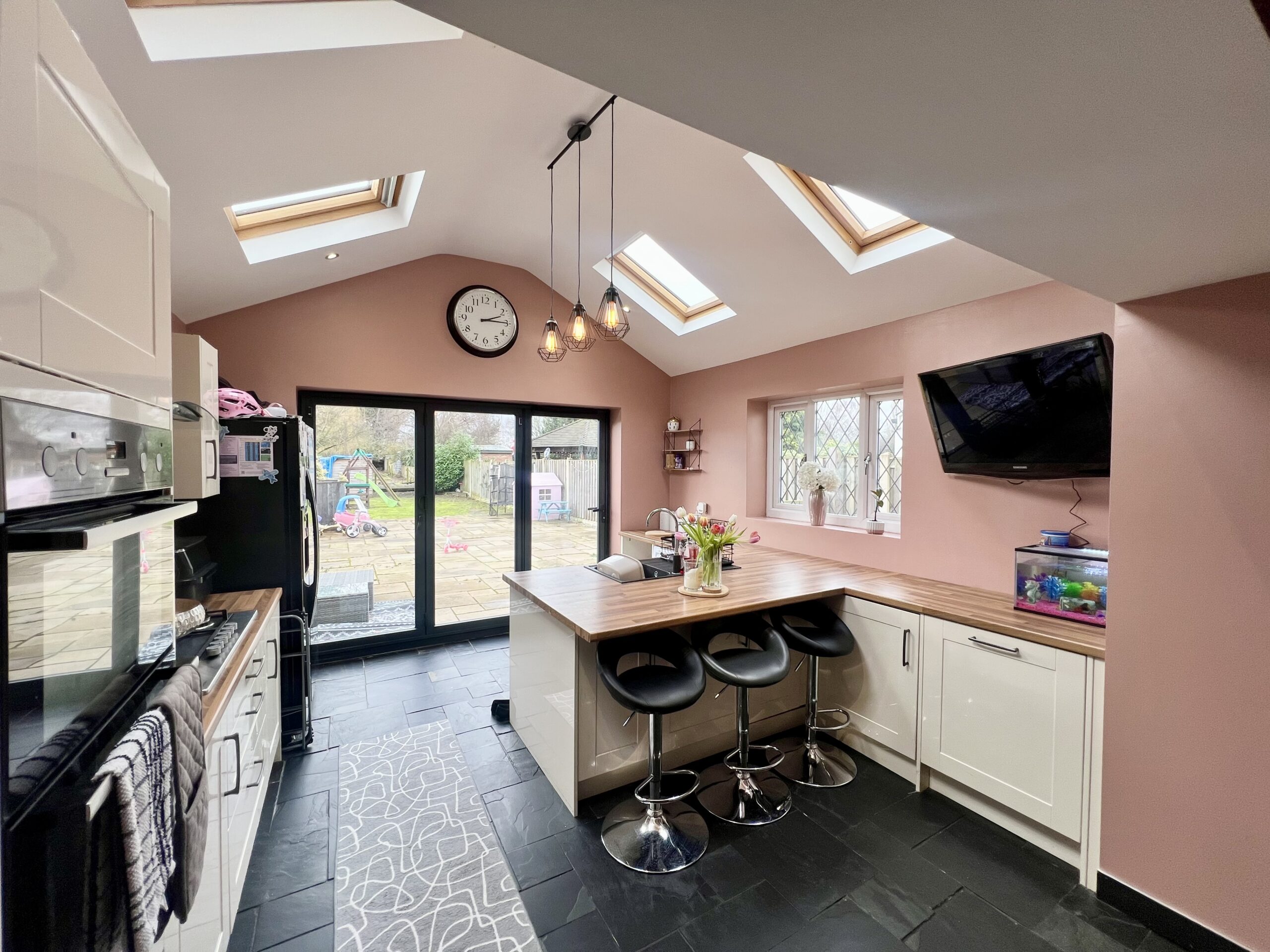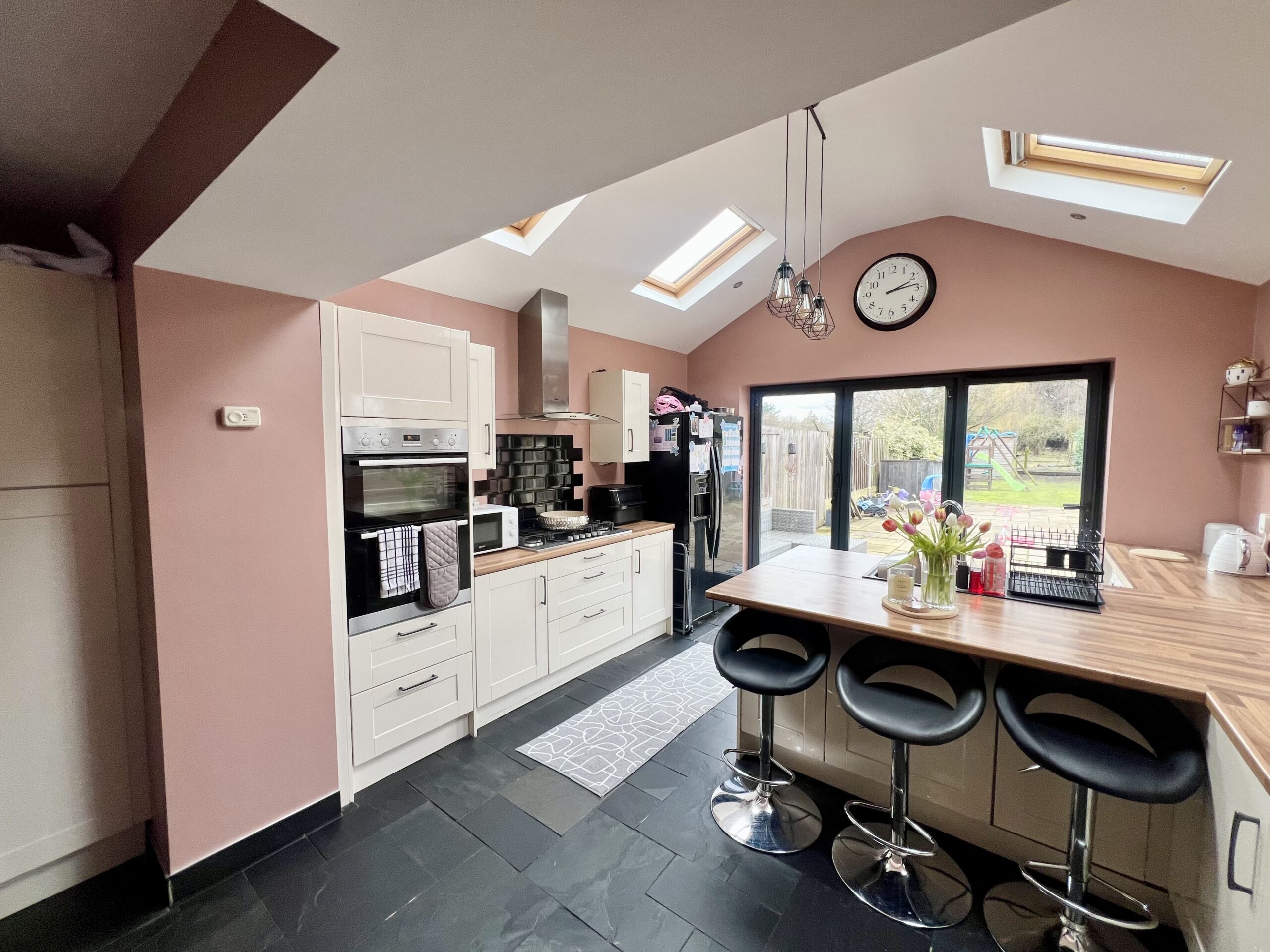 fully fitted kitchen complete with breakfast bar and bi-fold doors opening onto the garden, and a convenient