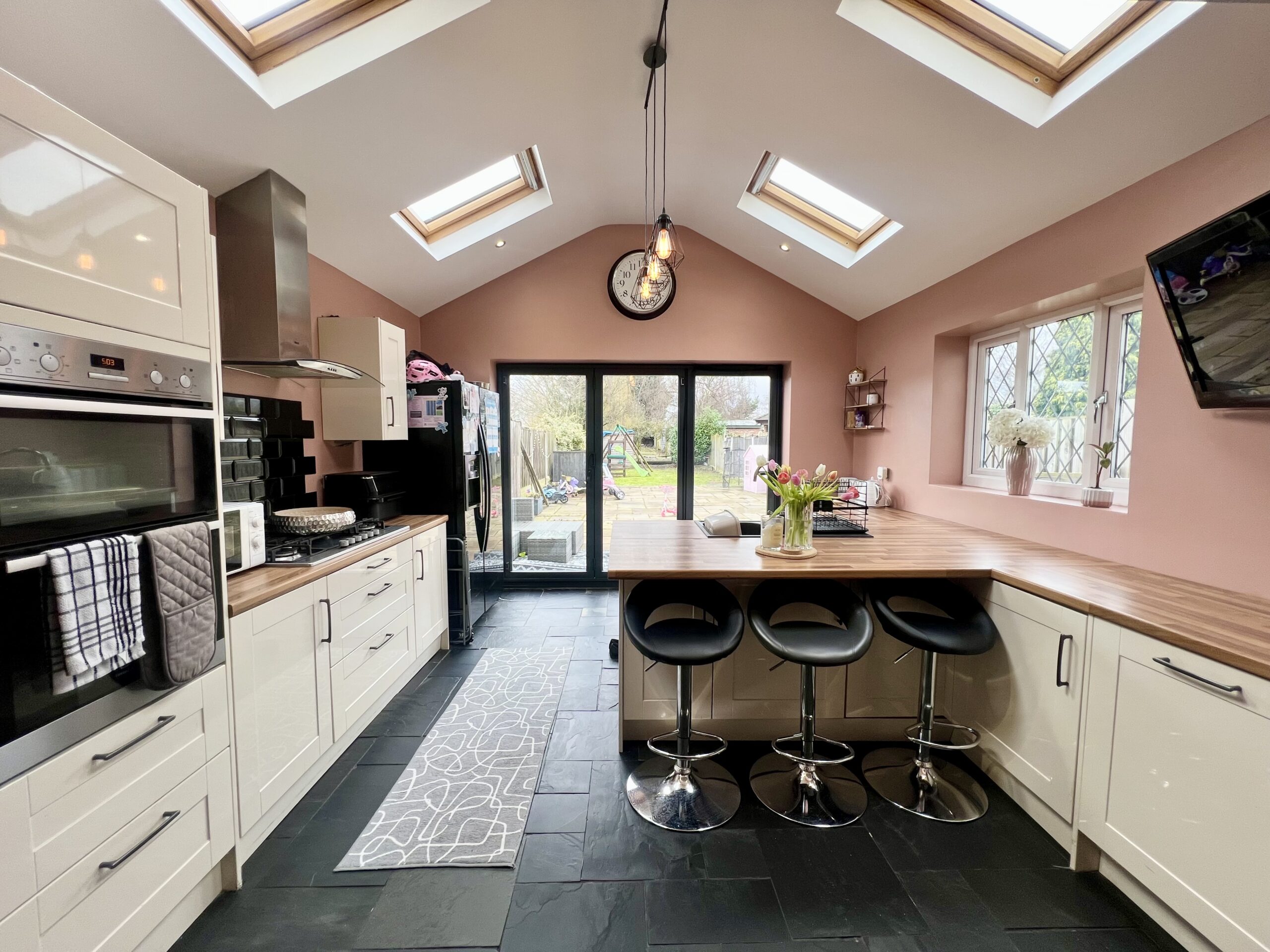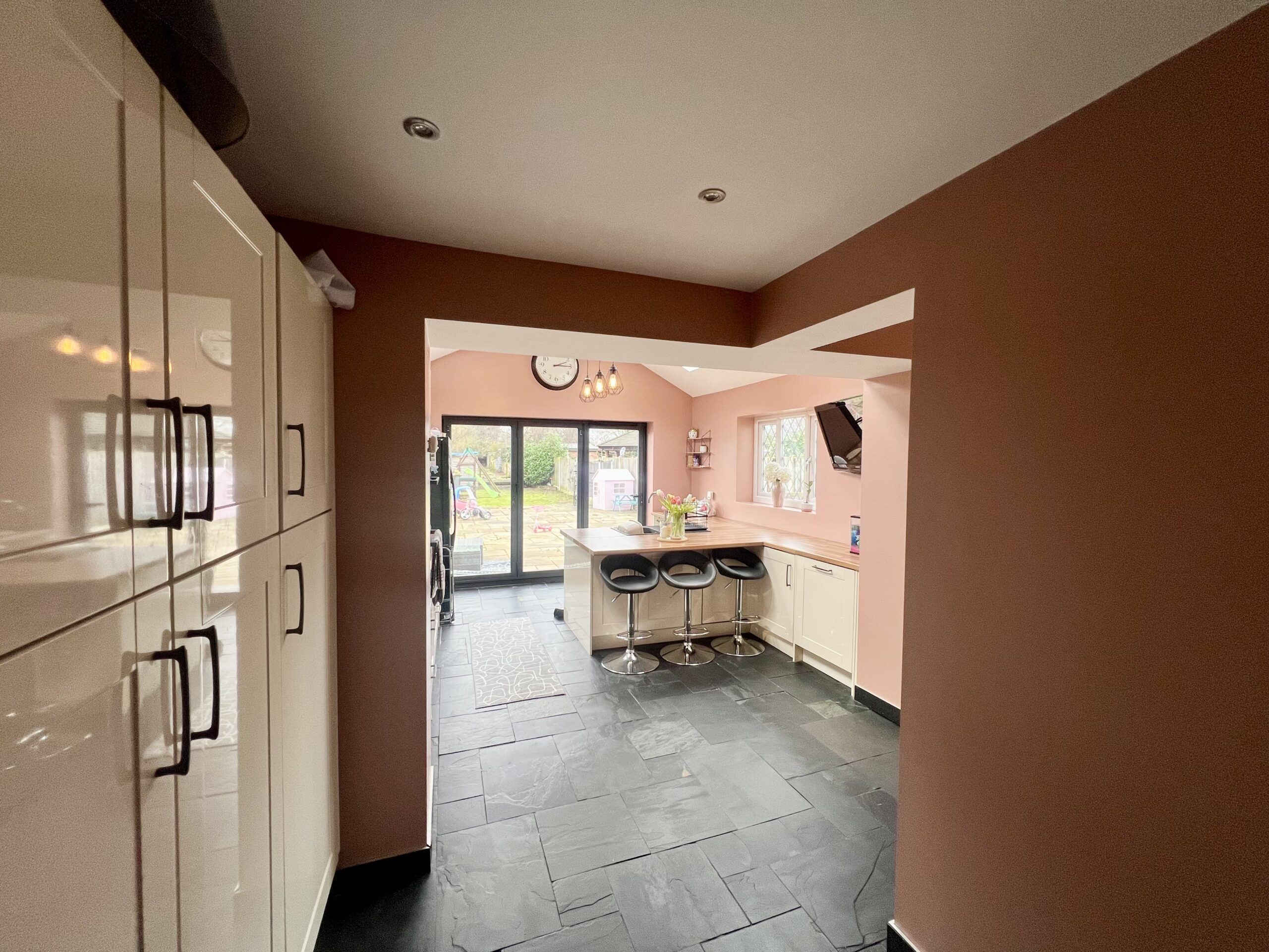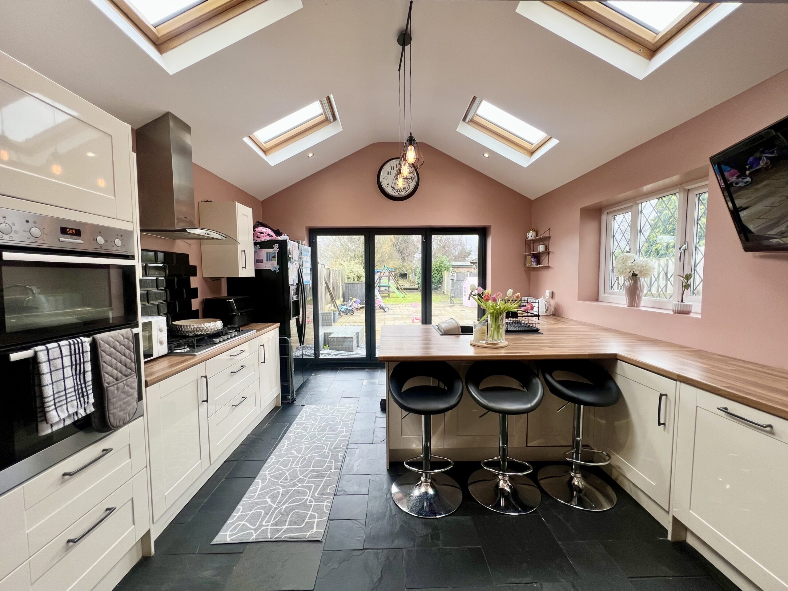 fully fitted kitchen complete with breakfast bar and bi-fold doors opening onto the garden, and a convenient