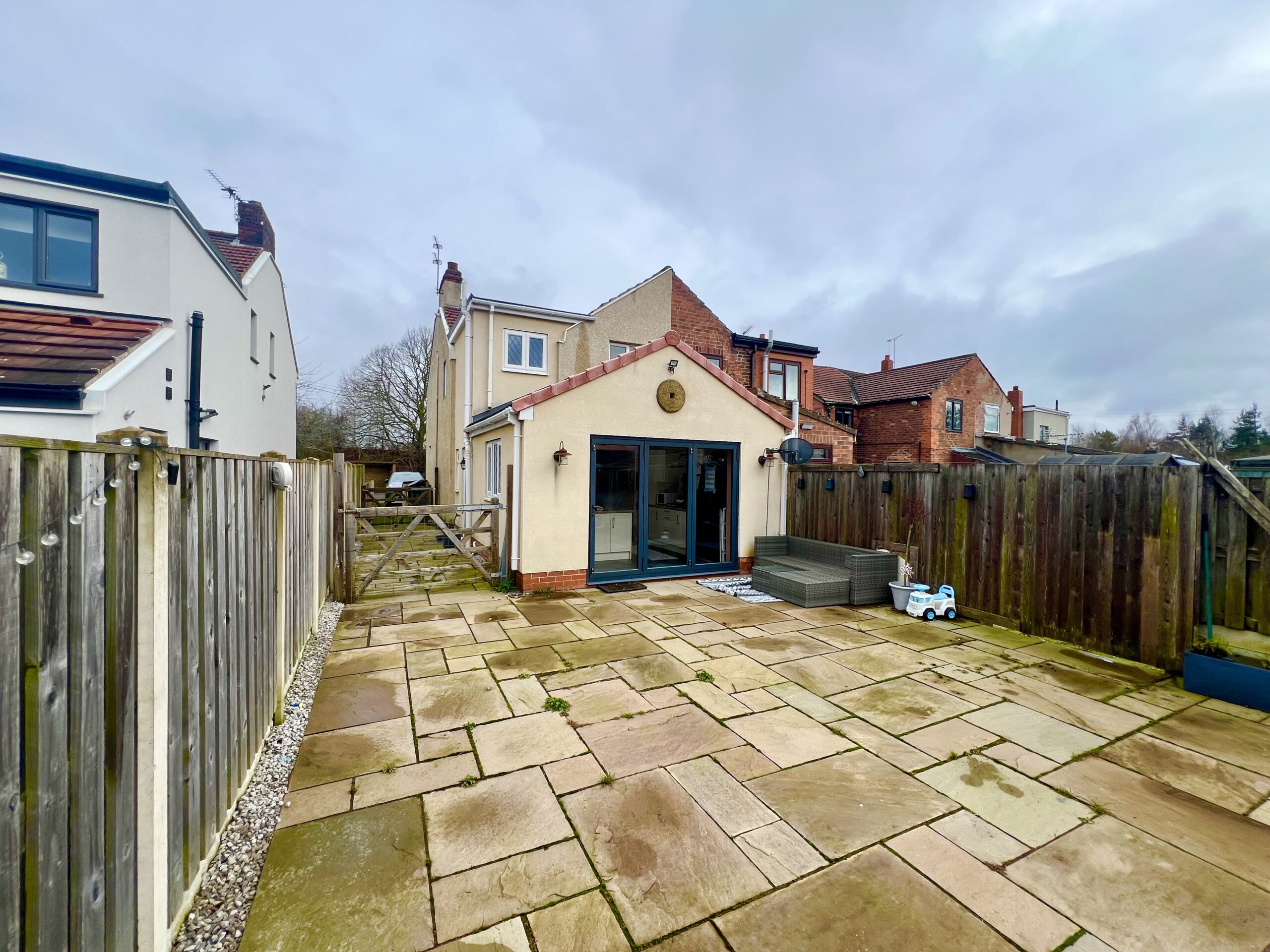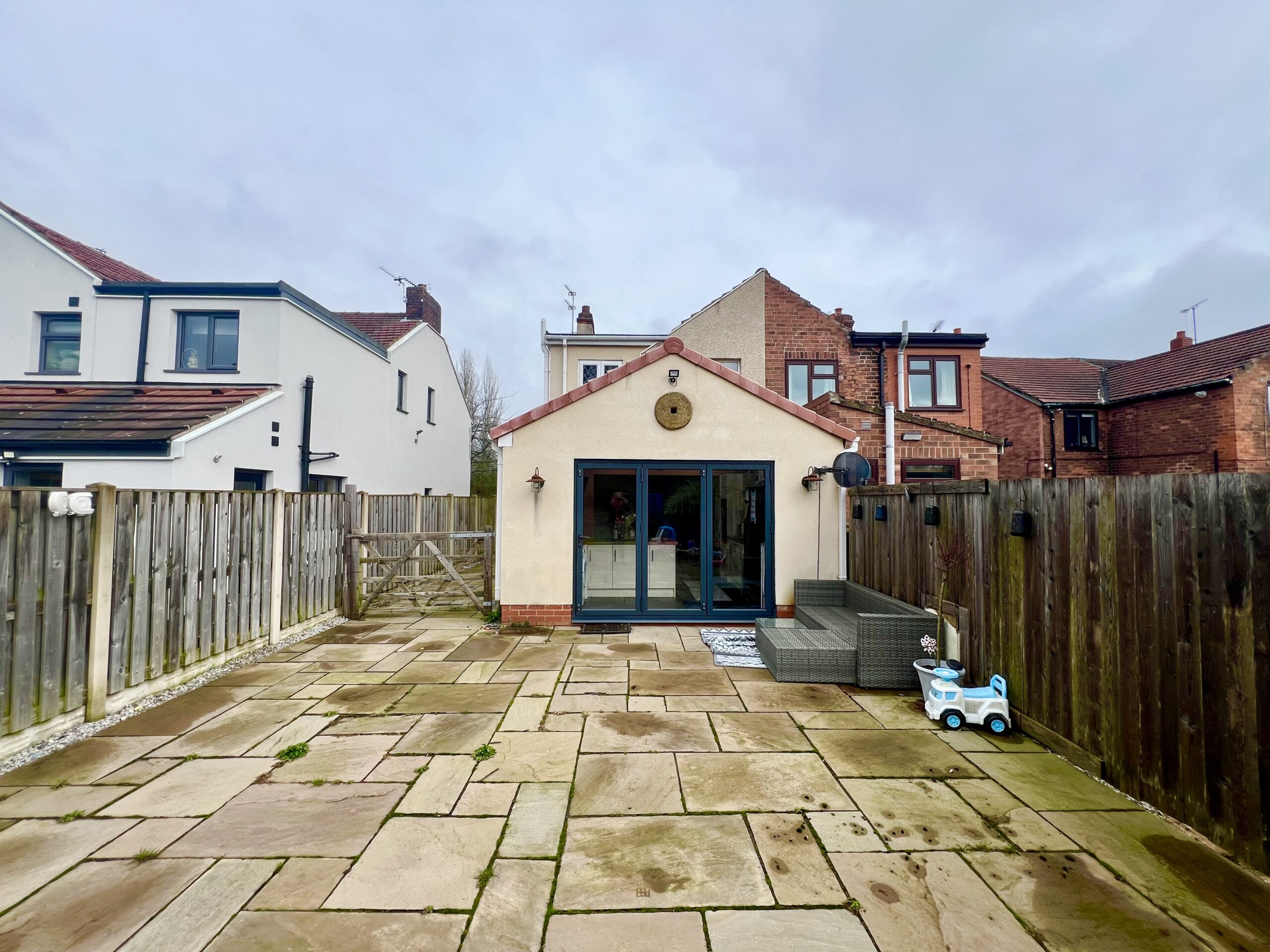 size and wonderfully private, creating a peaceful outdoor retreat. A patio area sits directly outside the bi-fold