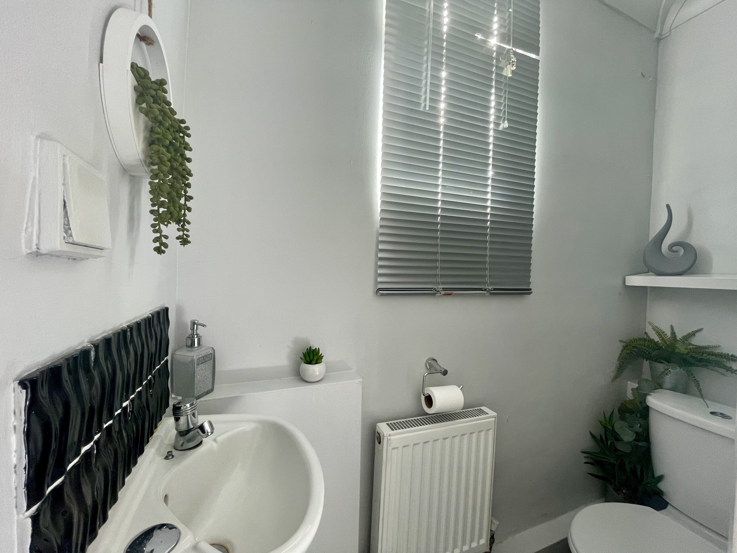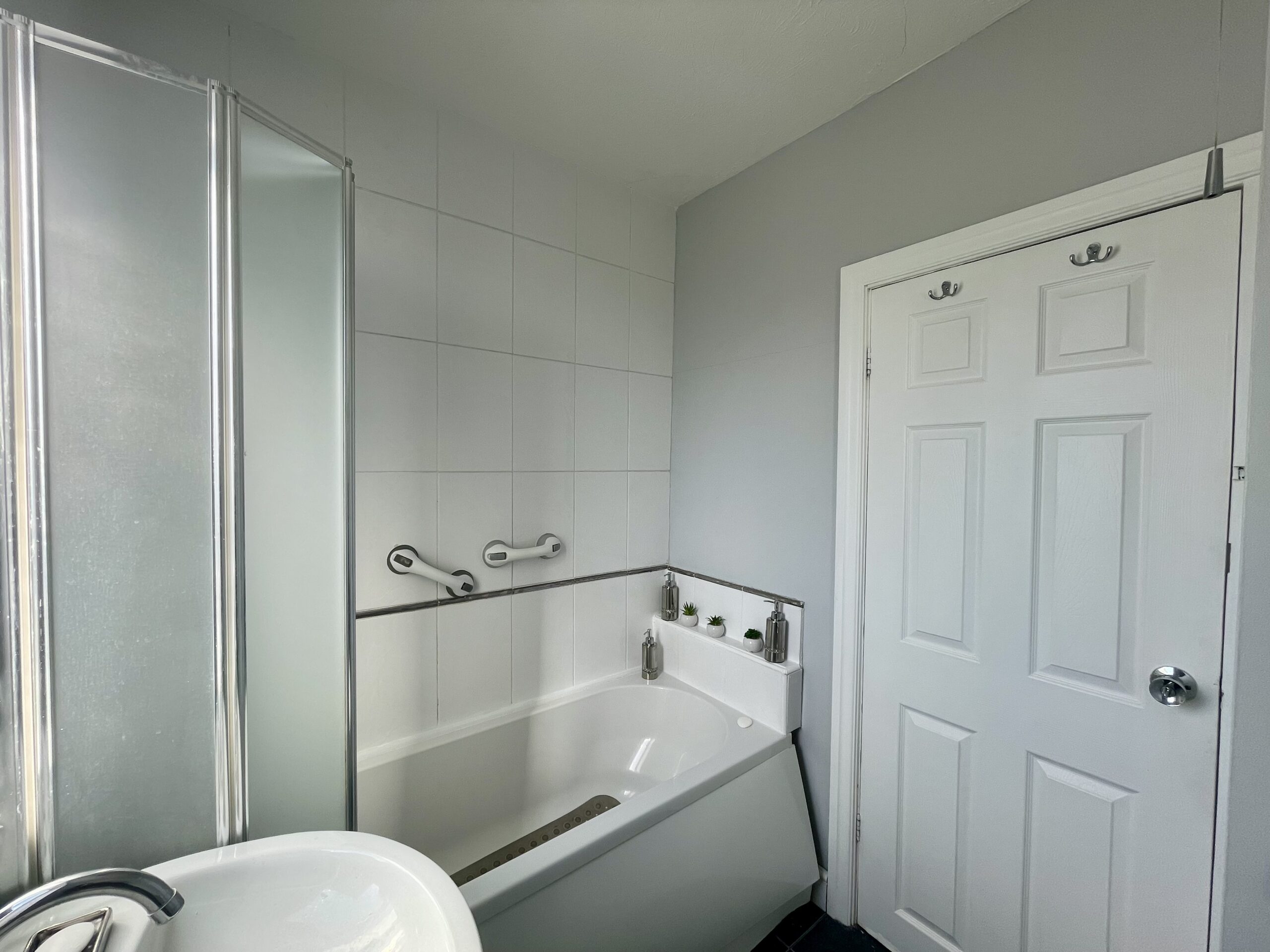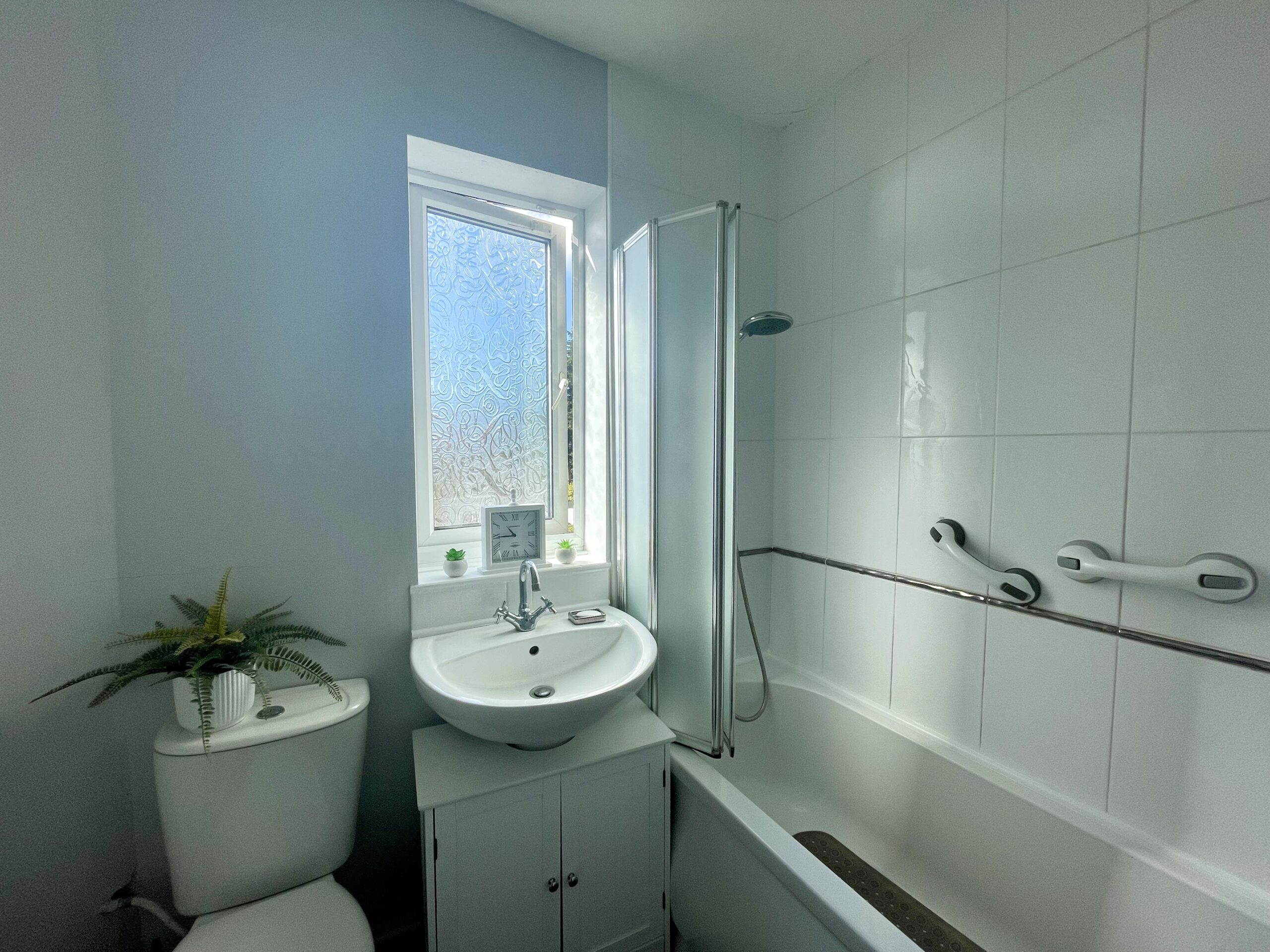 A fully tiled family bathroom with bath tub and shower over, hand basin with unit underneath and W/C. Obscure rear aspect glass window, vinyl floor covering, single pendant light fitting and heated towel rail.