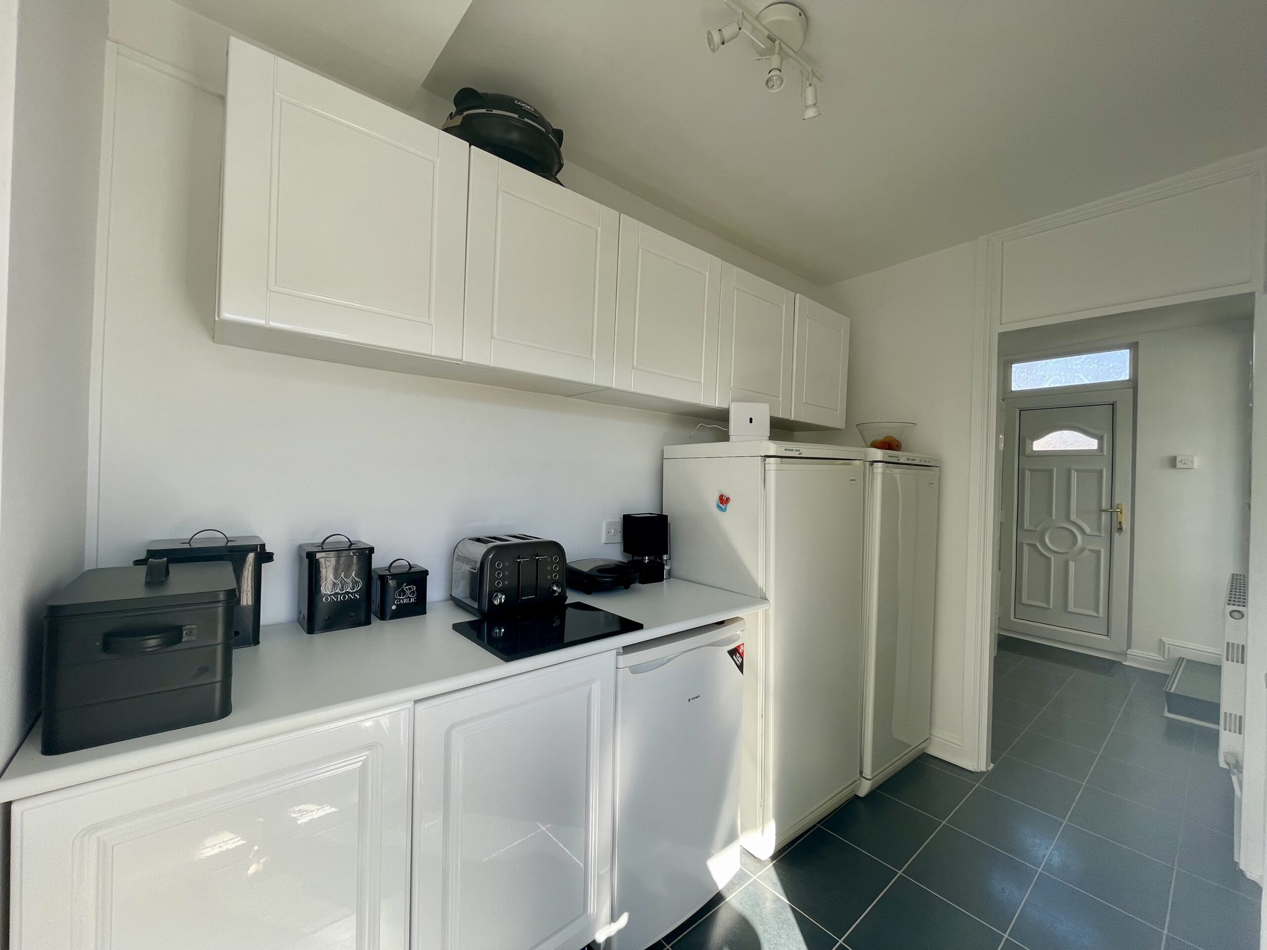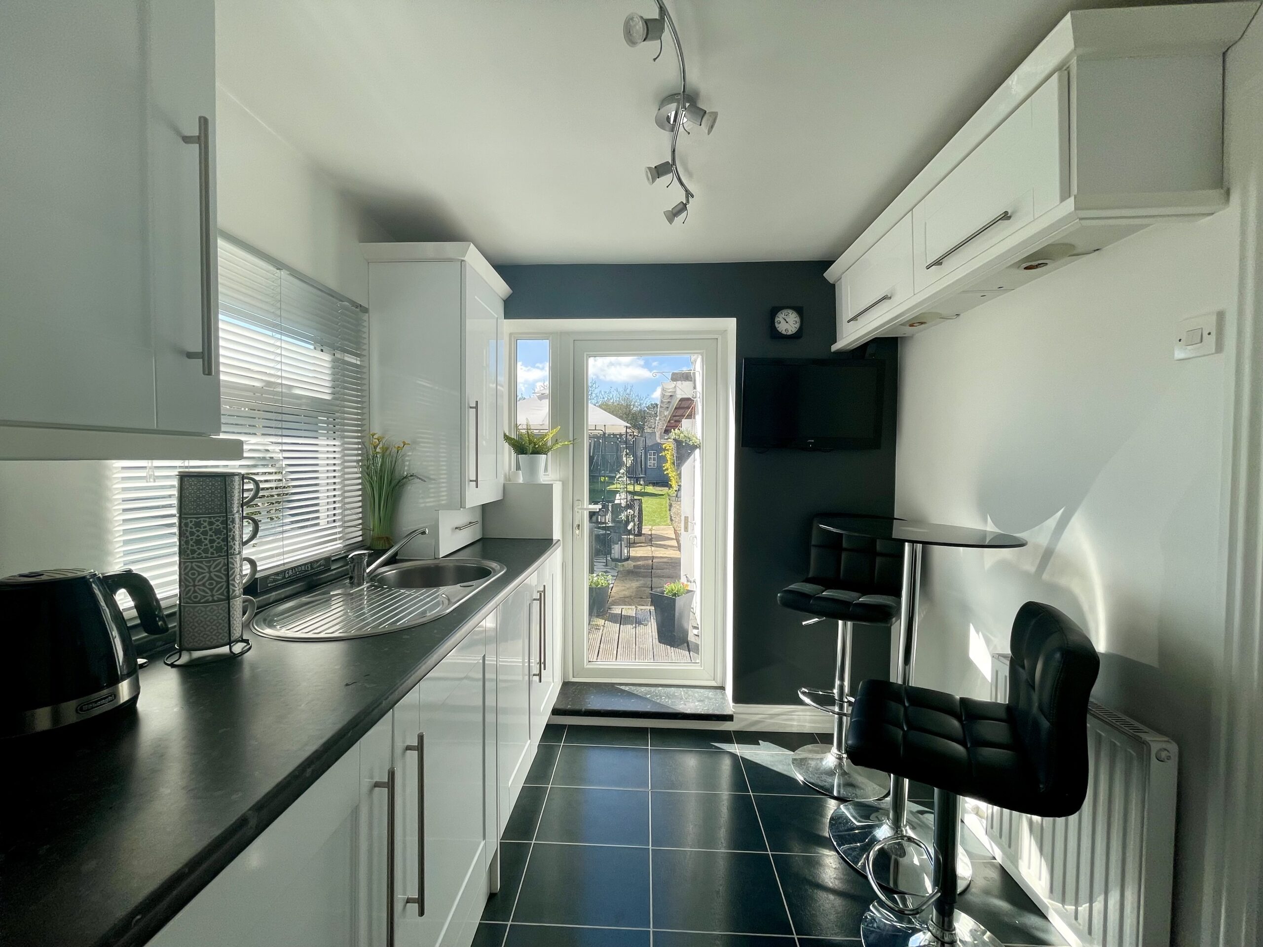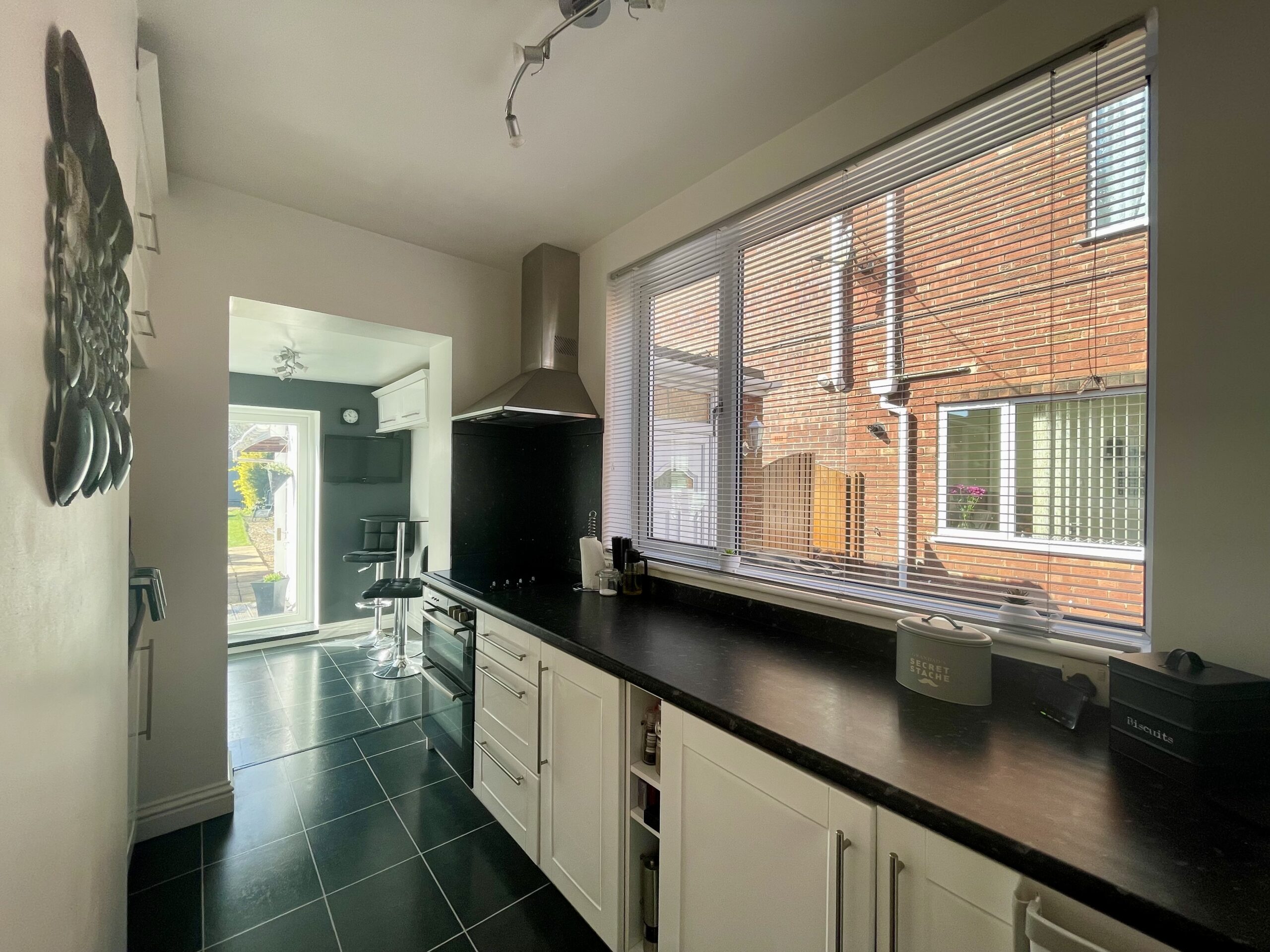 Fully fitted kitchen with a range of floor and wall units with contrasting worktops and breakfast bar; integrated appliances including oven, hob and extractor hood. Plumbing for dishwasher and 1 1/2 bowl sink unit with mixer tap. Rear and side aspect windows, large under stair cupboard providing ample space for household cleaning equipment, single pendant light fittings and central heating radiator. Vinyl floor covering and rear access door to garden.