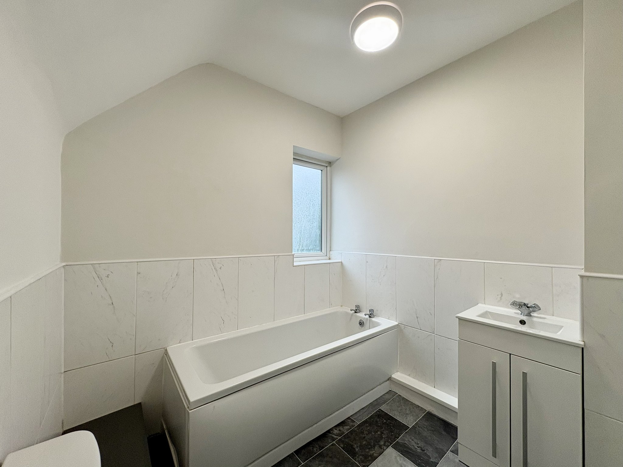 The part-tiled family bathroom comprises a rear aspect obscured glass window, bathtub, hand basin, WC, central heating radiator, and pendant light fitting.