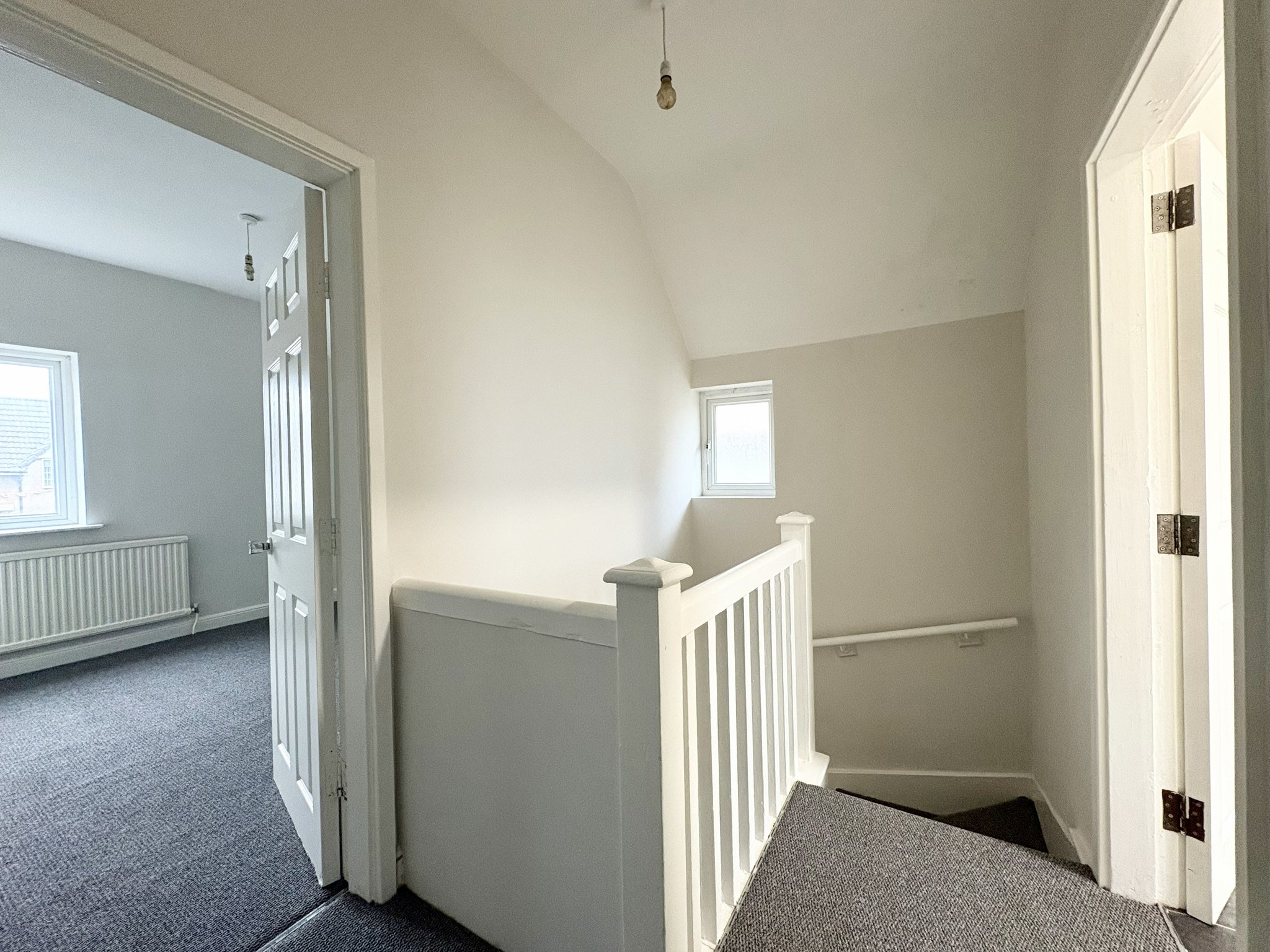 Open stairs lead to a spacious landing area with a side aspect window, carpet to the floor, single pendant light fitting, and loft access. There are three double bedrooms, all finished with carpet to the floor, single pendant light fittings, and central heating radiators: Bedroom 1 – front facing Bedroom 2 – rear facing Bedroom 3 – front facing.