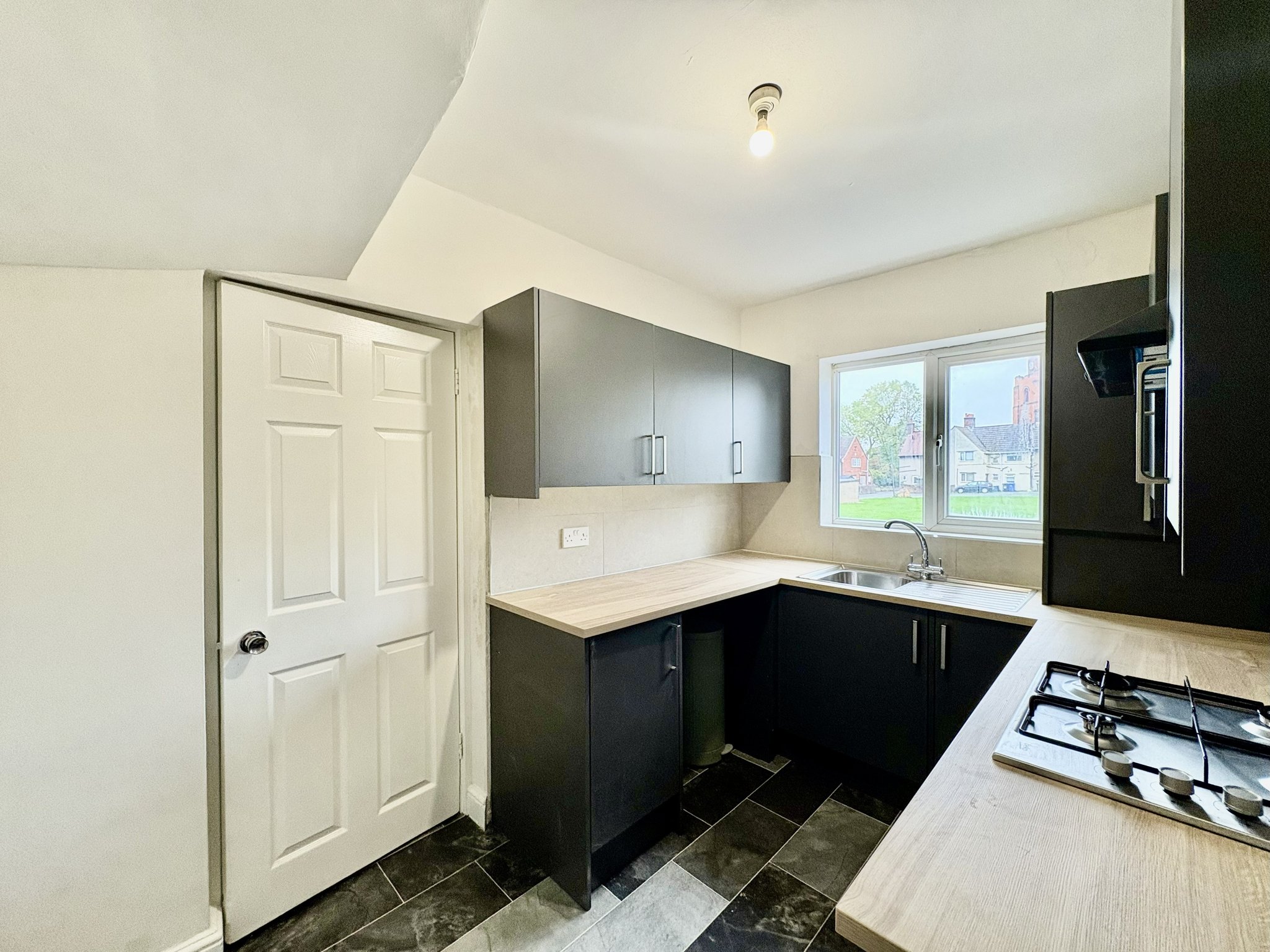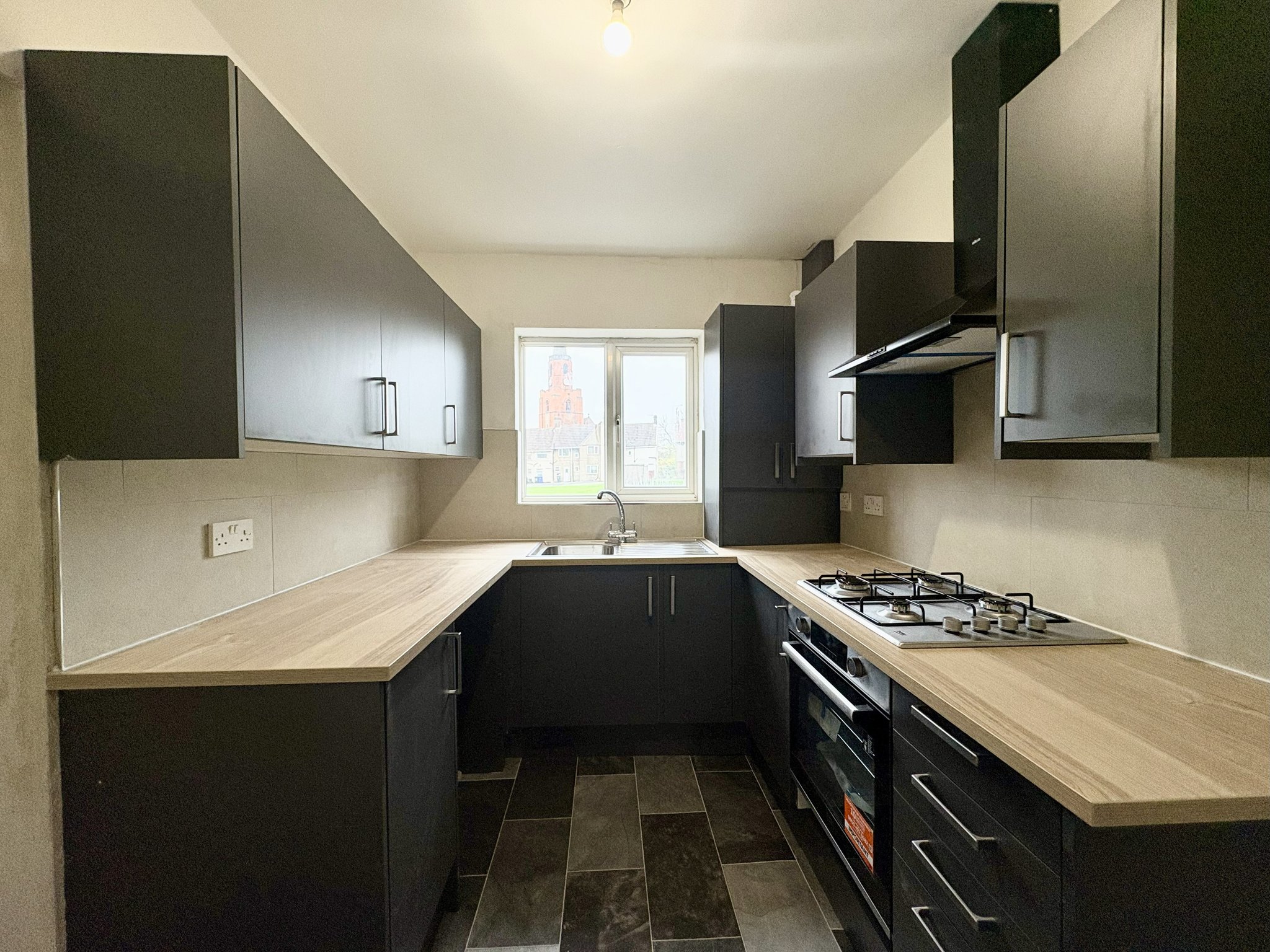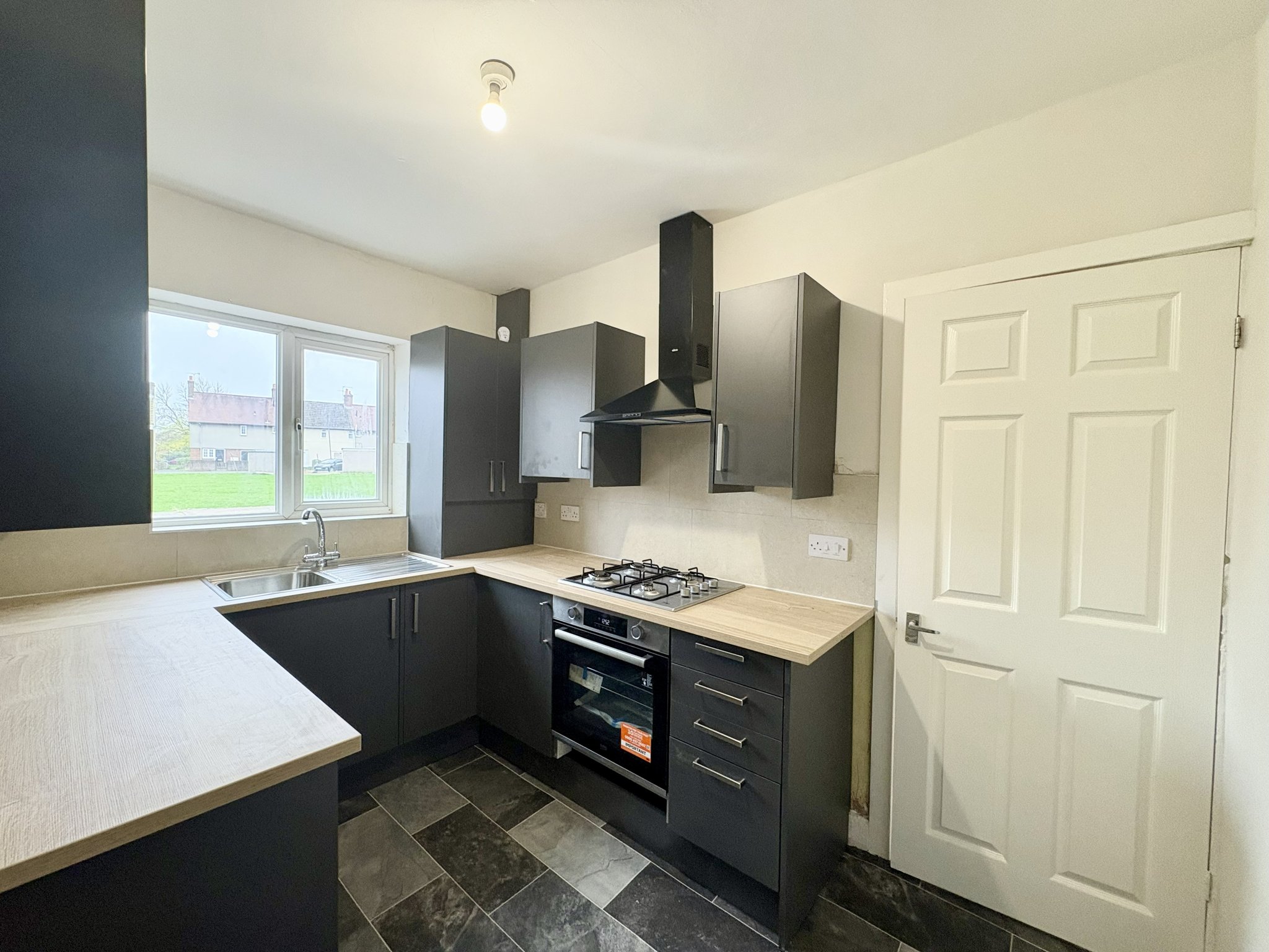 The newly fitted kitchen is equipped with a modern range of wall and base units, complemented by contrasting work surfaces, an integrated oven, hob, and extractor fan. There is space for a fridge, plumbing for a washing machine, and vinyl flooring throughout. A large store cupboard provides additional storage solutions. The kitchen continues into a side aspect lobby offering access to a further storage area, ground floor WC, and external side door leading outside.