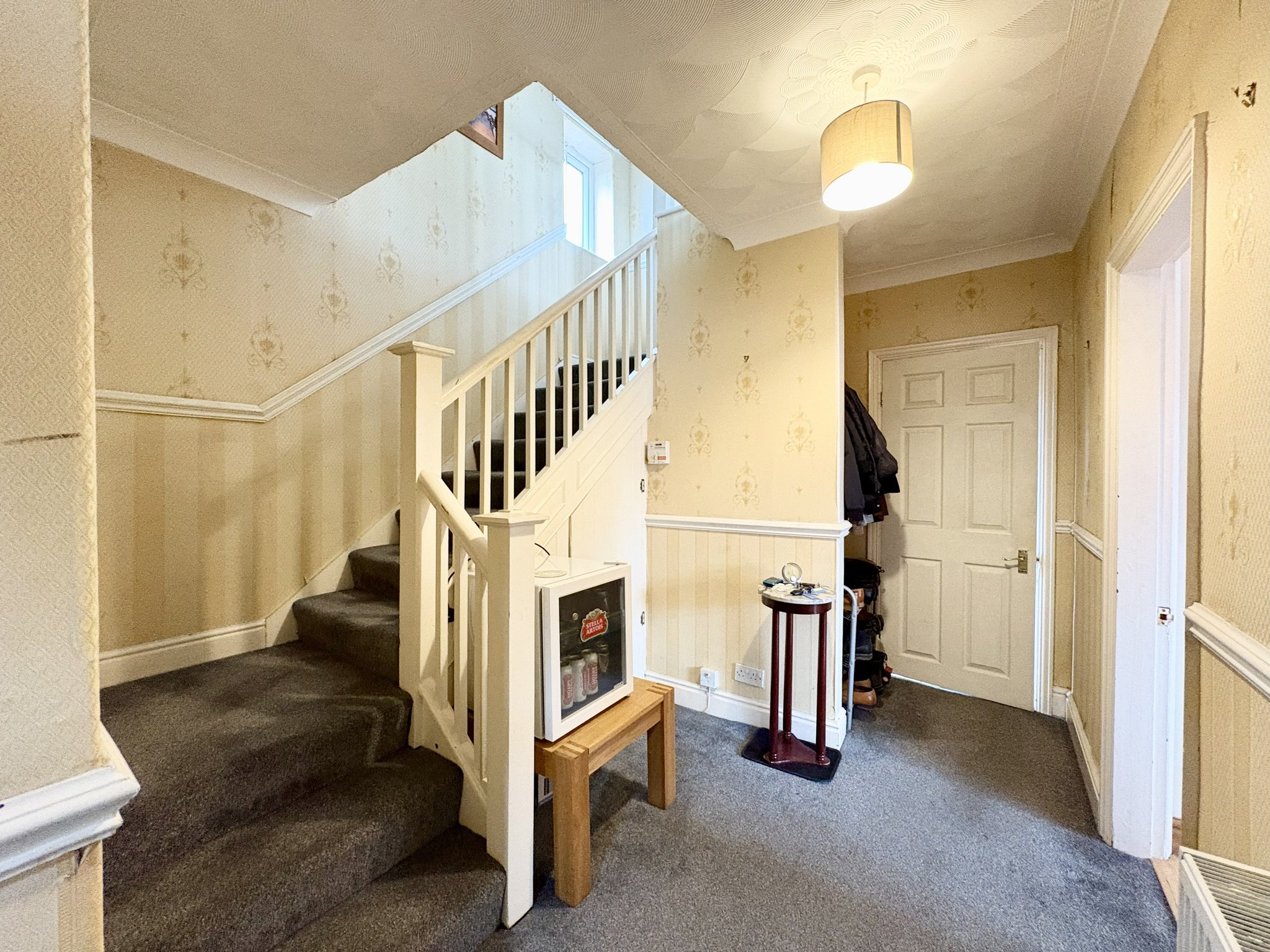 To the first floor, the property features a spacious landing and three generous double bedrooms, all well-lit and fitted with radiators and pendant light fittings, alongside a spacious family bathroom complete with three-piece suite.