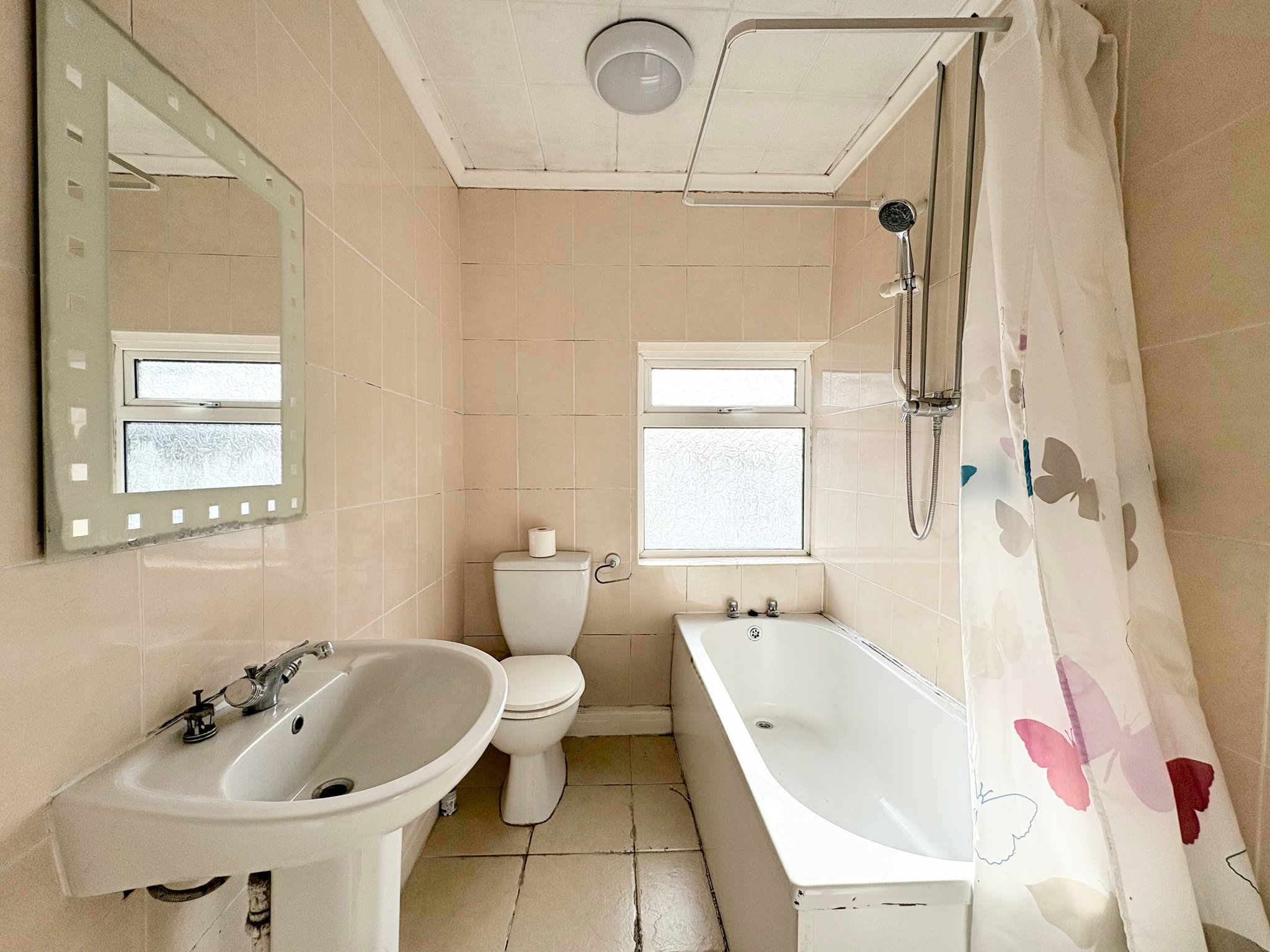 Fully tiled bathroom fitted with a suite comprising bath with shower over, wash hand basin and WC. The bathroom benefits from tiled flooring, radiator and single pendant light fitting.