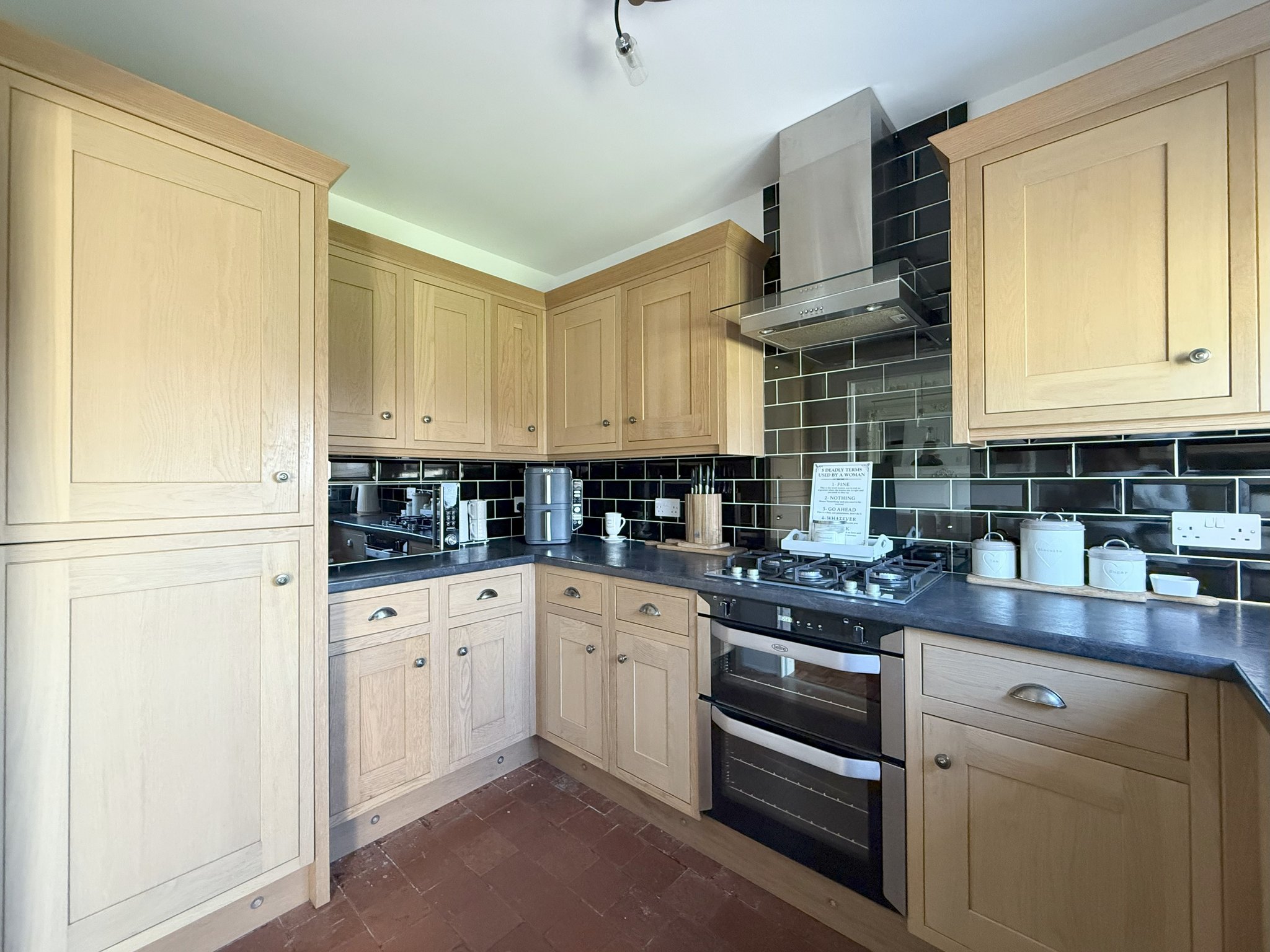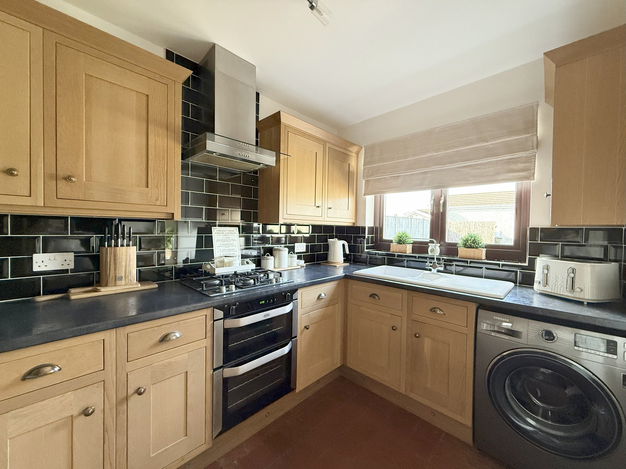 The kitchen is fully fitted with an attractive range of inframed oak wall and floor units complemented by contrasting worktops. Integrated appliances include an oven, gas hob with extractor hood. Fridge/freezer housed within kitchen unit, and plumbing for washing machine. The kitchen also includes a ceramic 1.5 bowl sink unit, rear-aspect window, tiled flooring and single pendant light fitting.