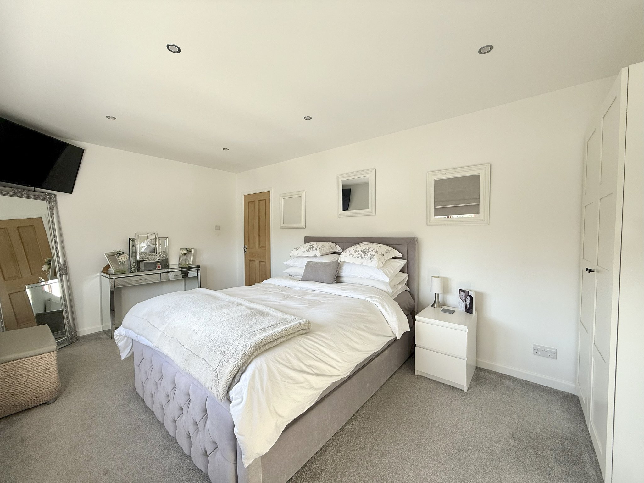 Bedroom 3 is a generous double bedroom with rear aspect window, plush carpet to floor, spot lighting, and a radiator.