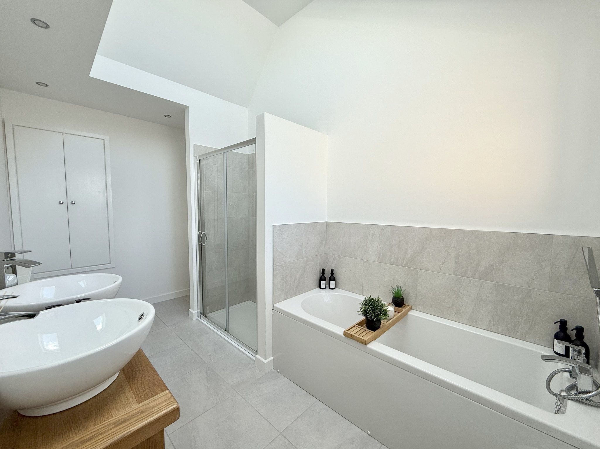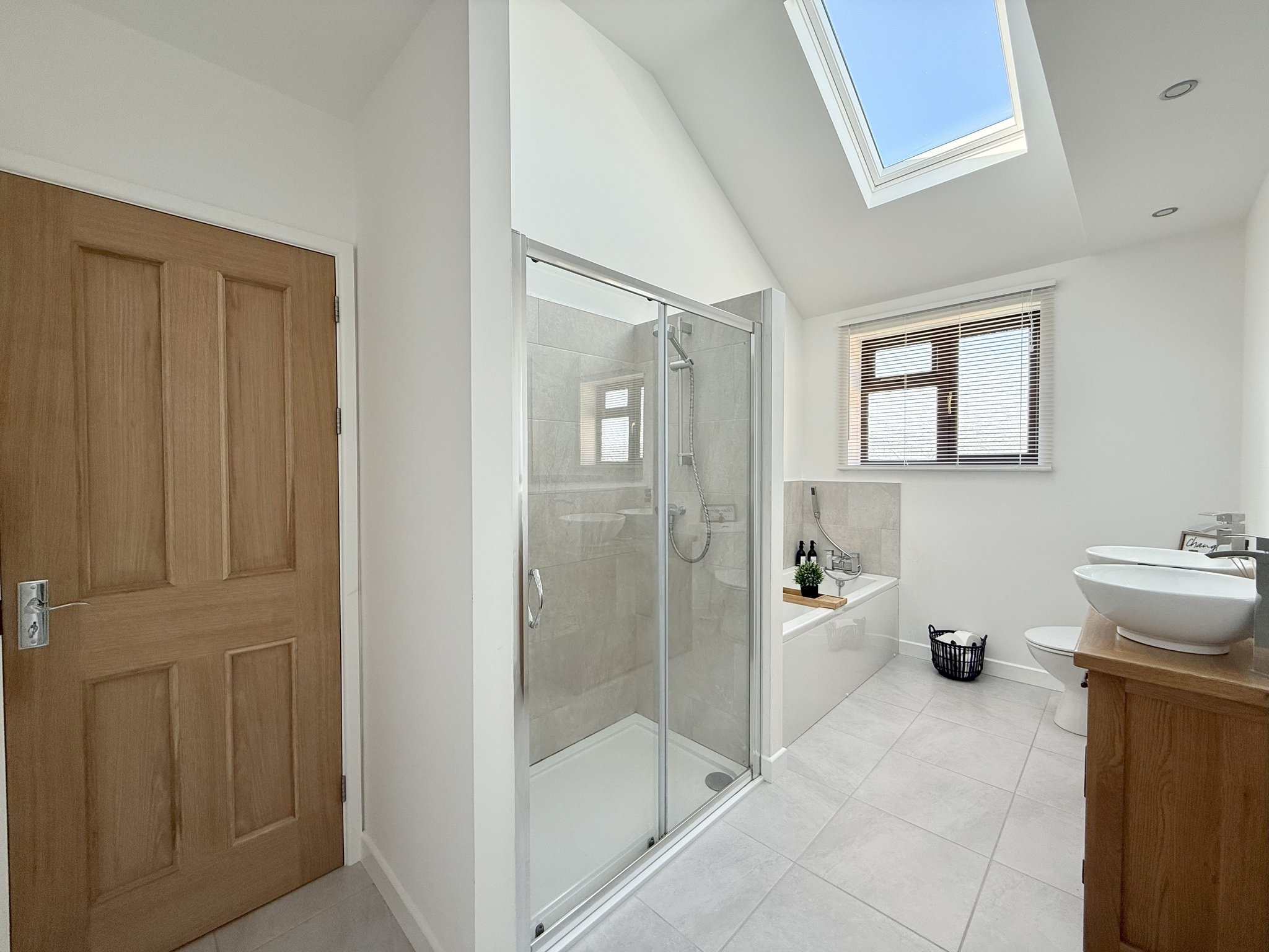 The family bathroom with vaulted ceiling has been recently refurbished to a high standard and features a full-size bathtub, walk-in shower, freestanding twin hand basins which are fitted in an oak unit providing additional storge, a WC and radiator. It is part-tiled with a fully tiled floor, includes spot lighting, storage cupboard, and has a rear-aspect obscure glass window and Velux style skylight.
