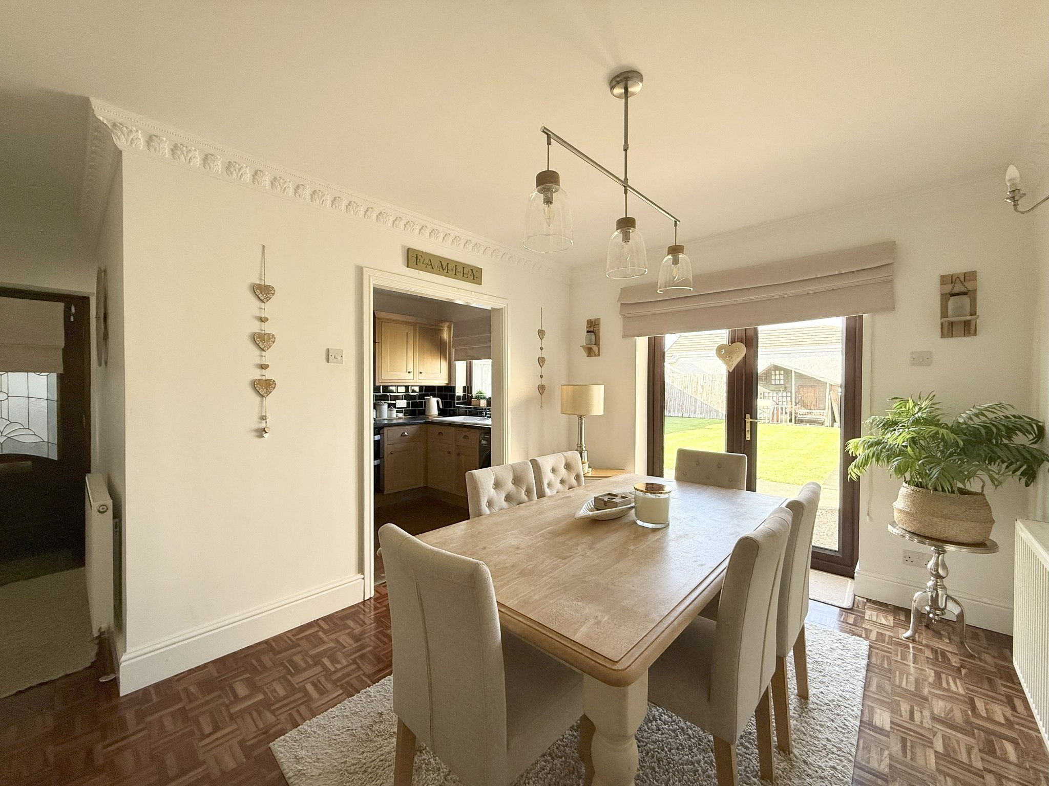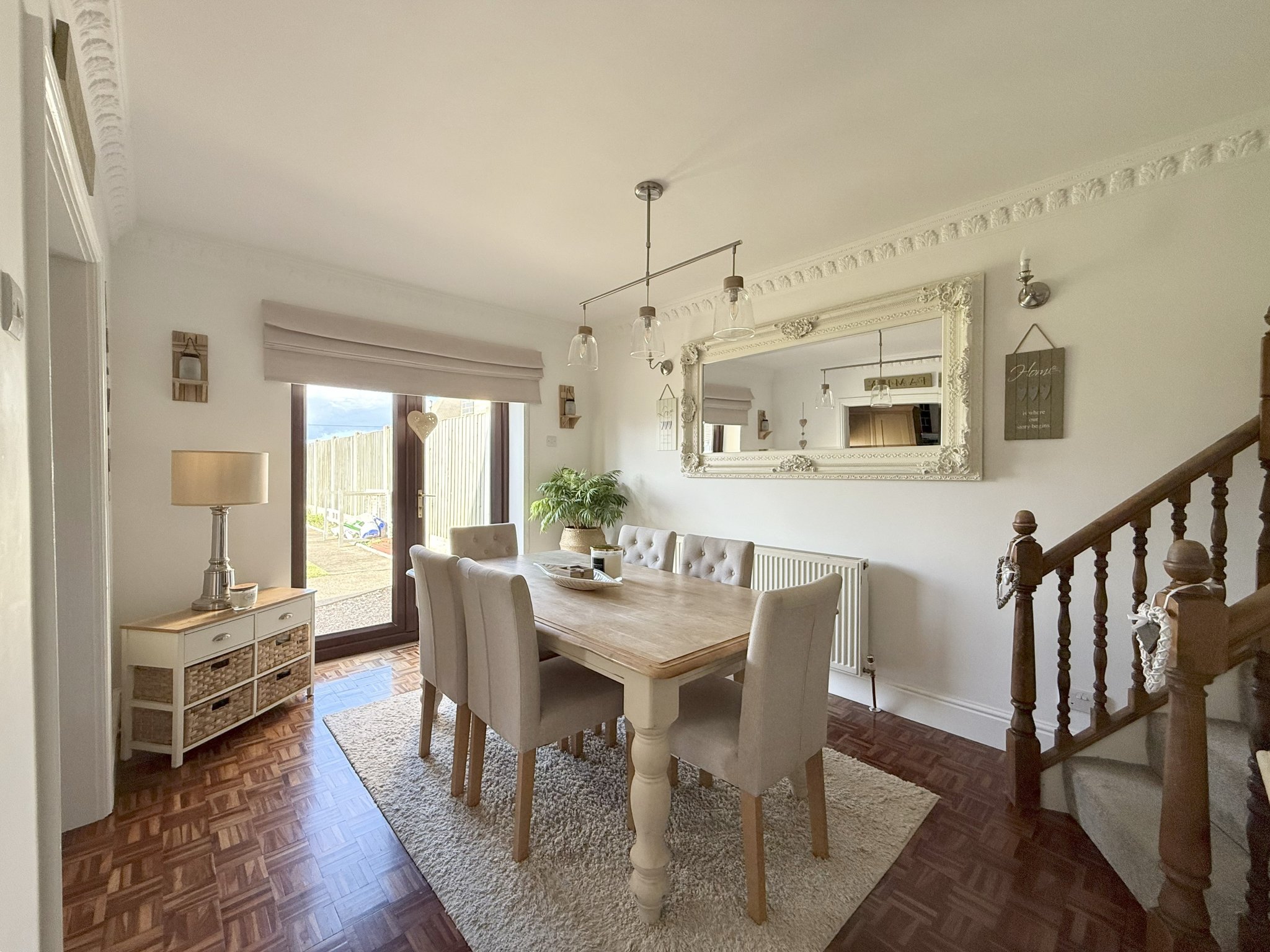 The dining room is finished with a stylish parquet wood floor with French doors leading to the rear garden, a single pendant light fitting, and a radiator. This flexible space is ideal as a second sitting area, playroom, or home office.