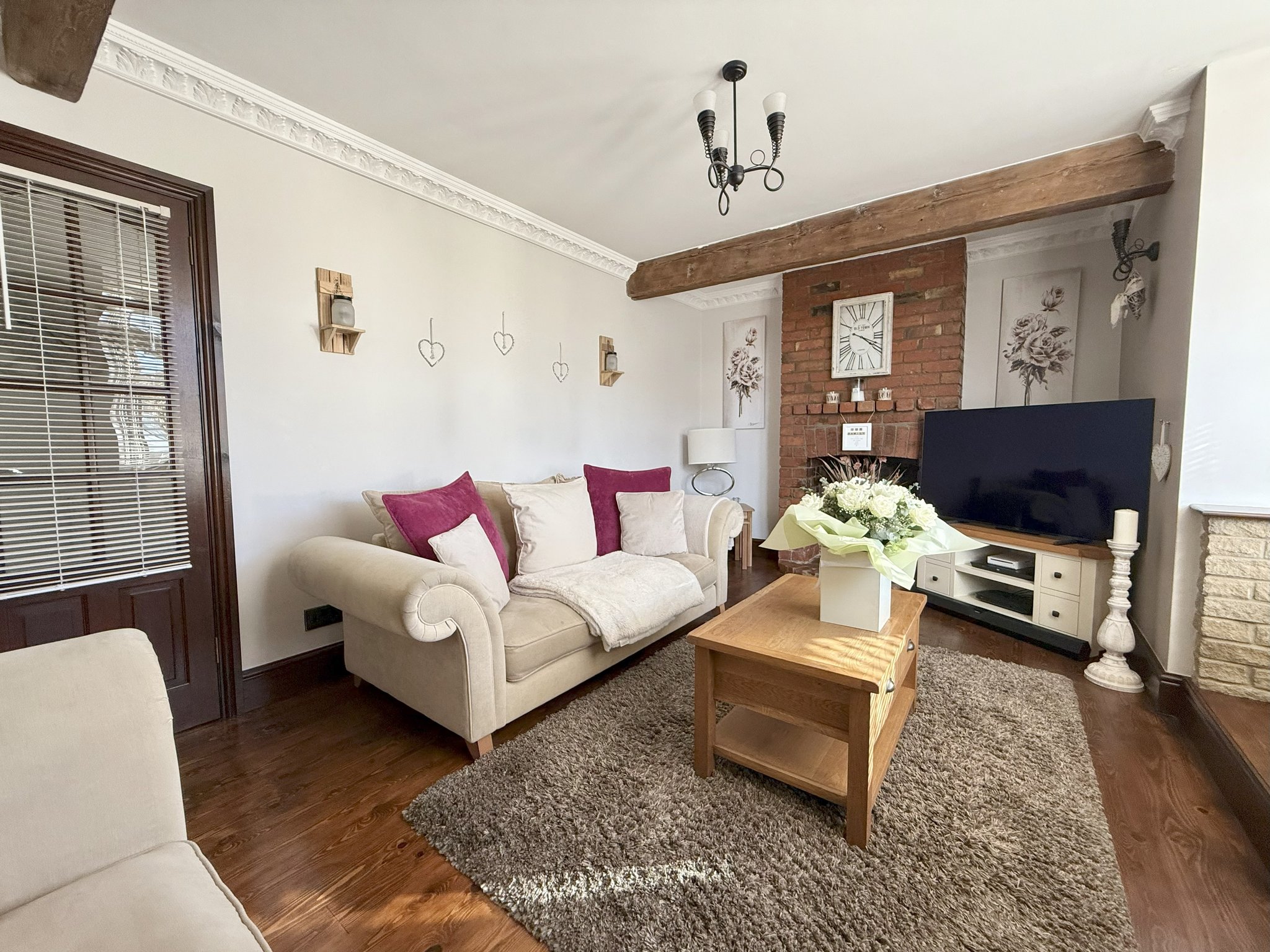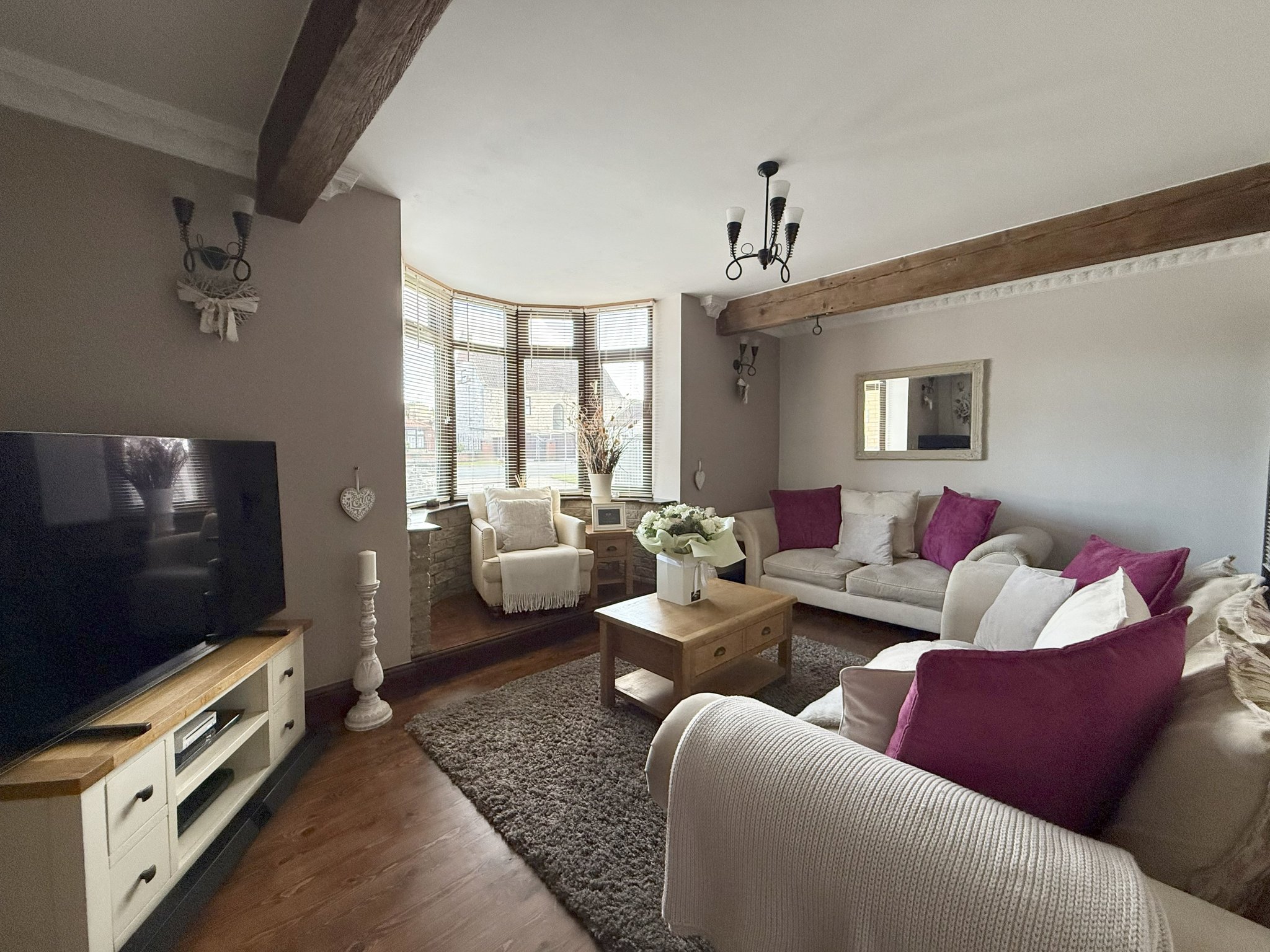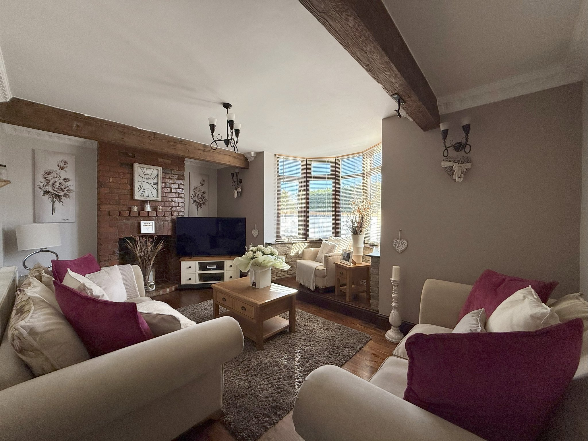 The lounge is a bright, front-aspect room featuring an original brick feature fireplace and exposed wood beams, adding warmth and character. There is a wood floor, a large front-facing bay window, a radiator, and a single pendant light fitting.