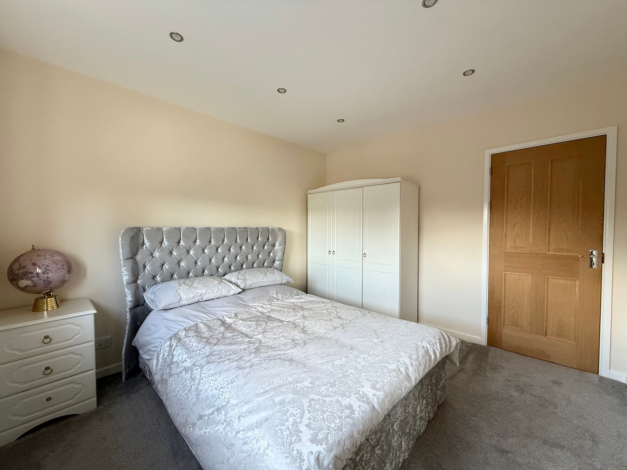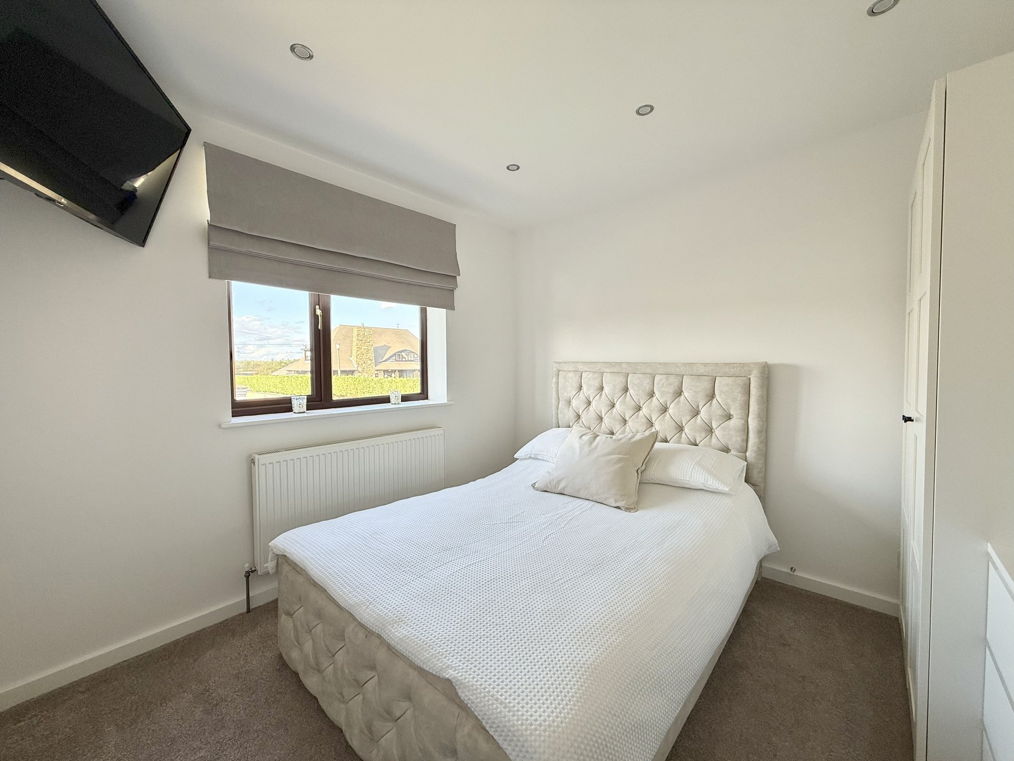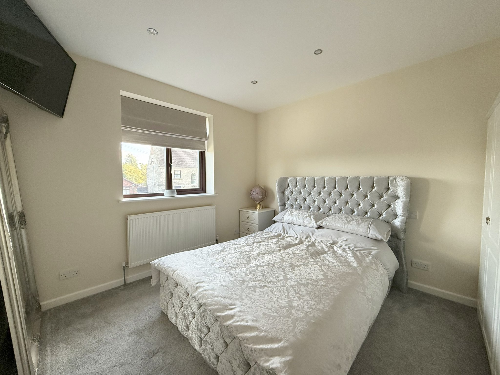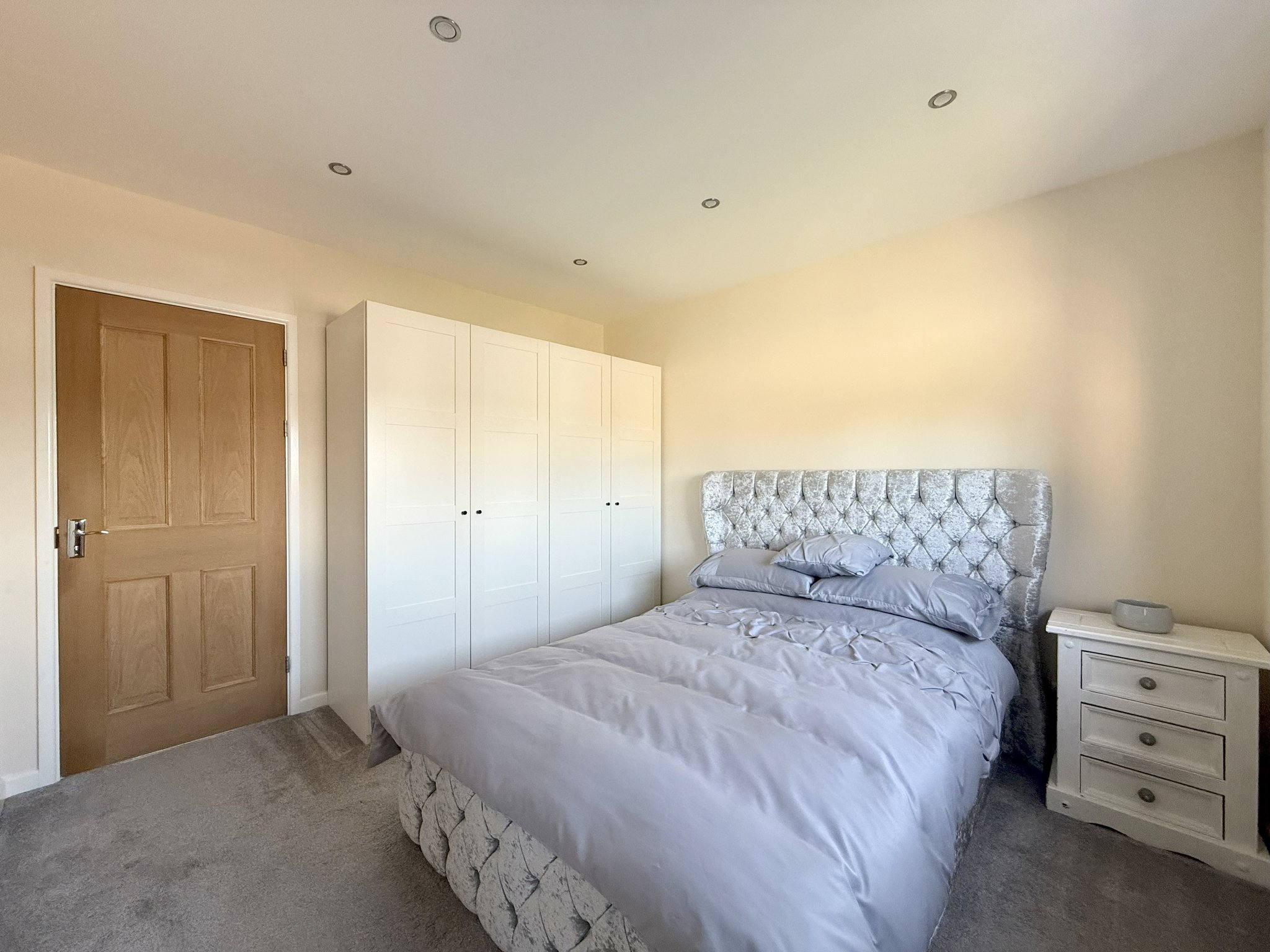 Bedroom 4 is also a double bedroom with rear-aspect window, plush carpet, spot lighting, and a radiator.