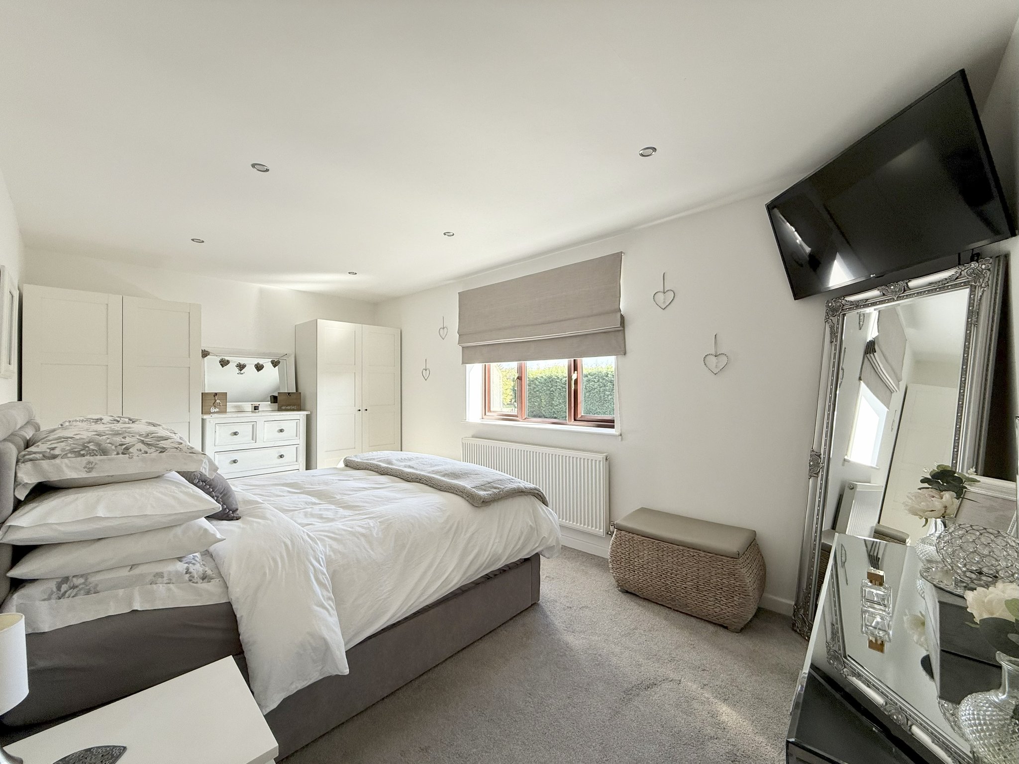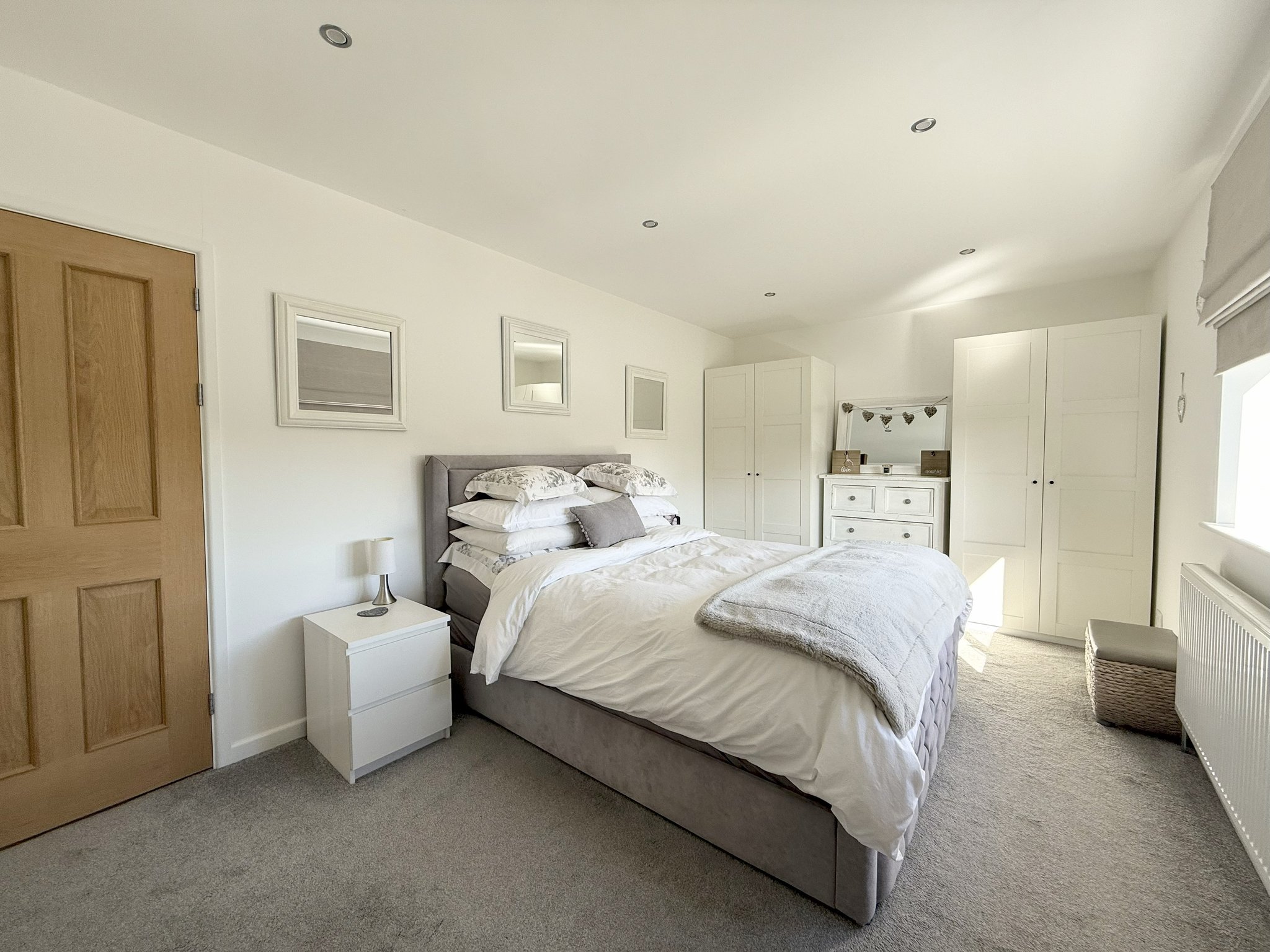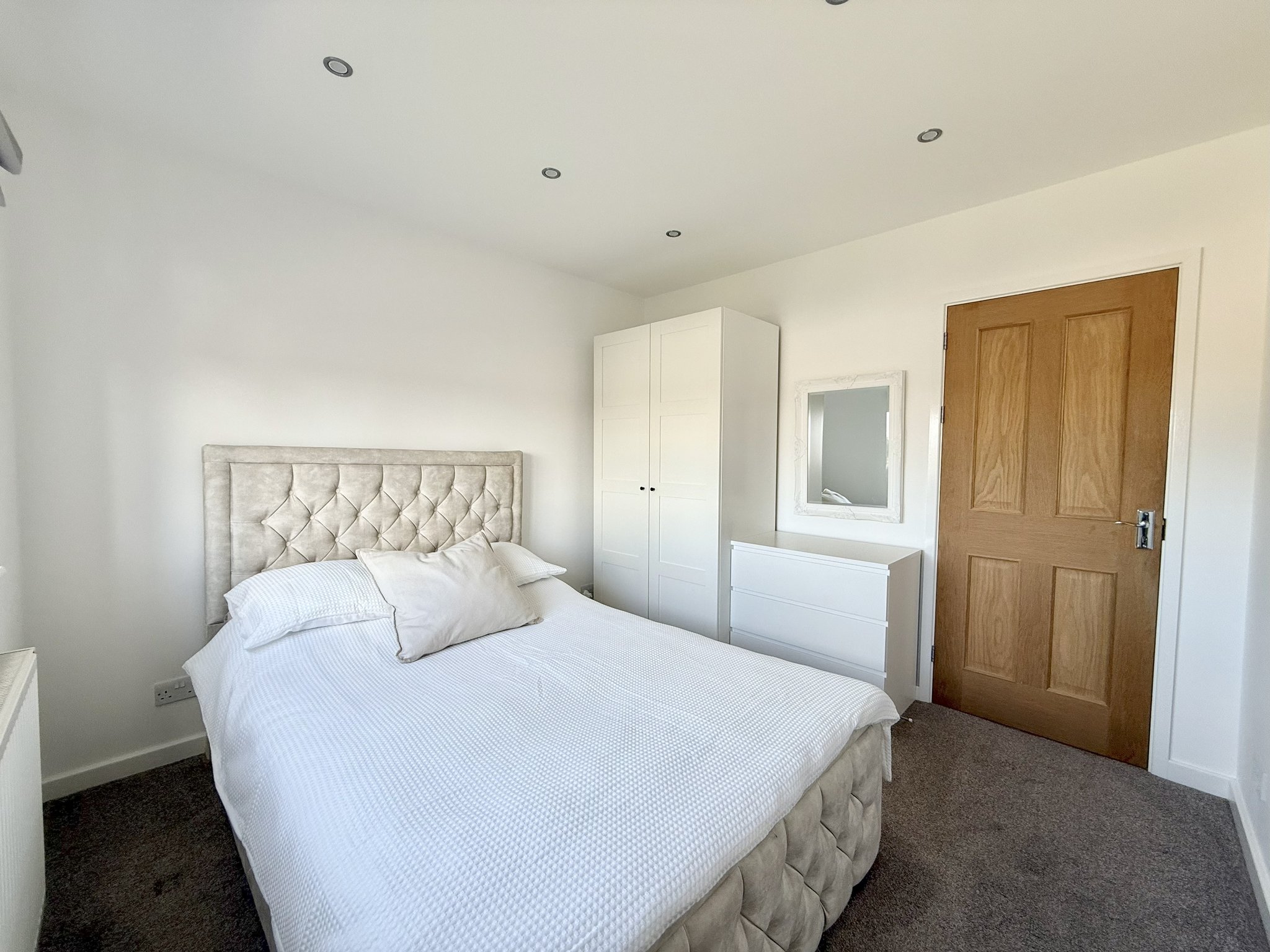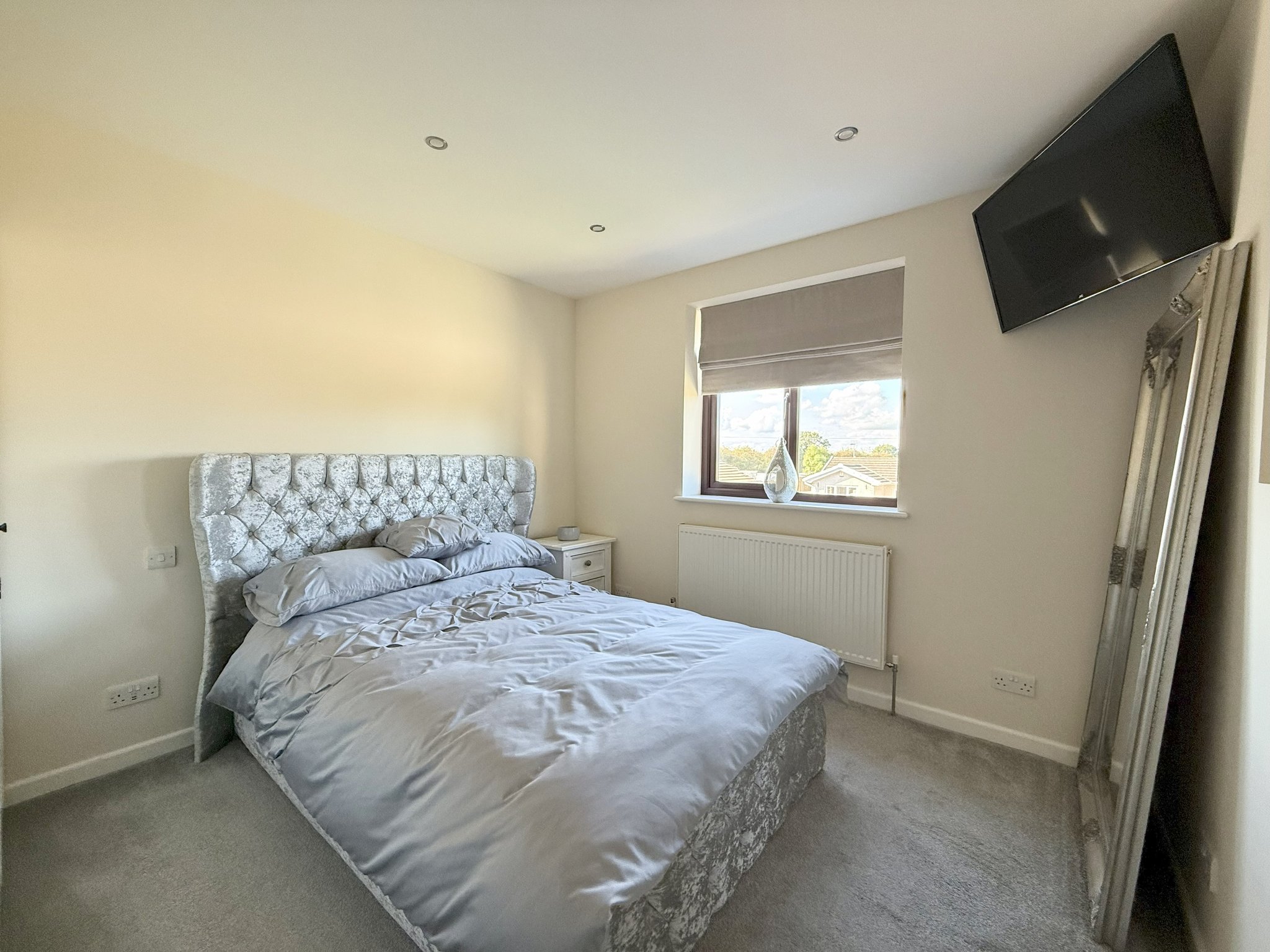 Bedroom 4 is also a double bedroom with rear-aspect window, plush carpet, spot lighting, and a radiator.