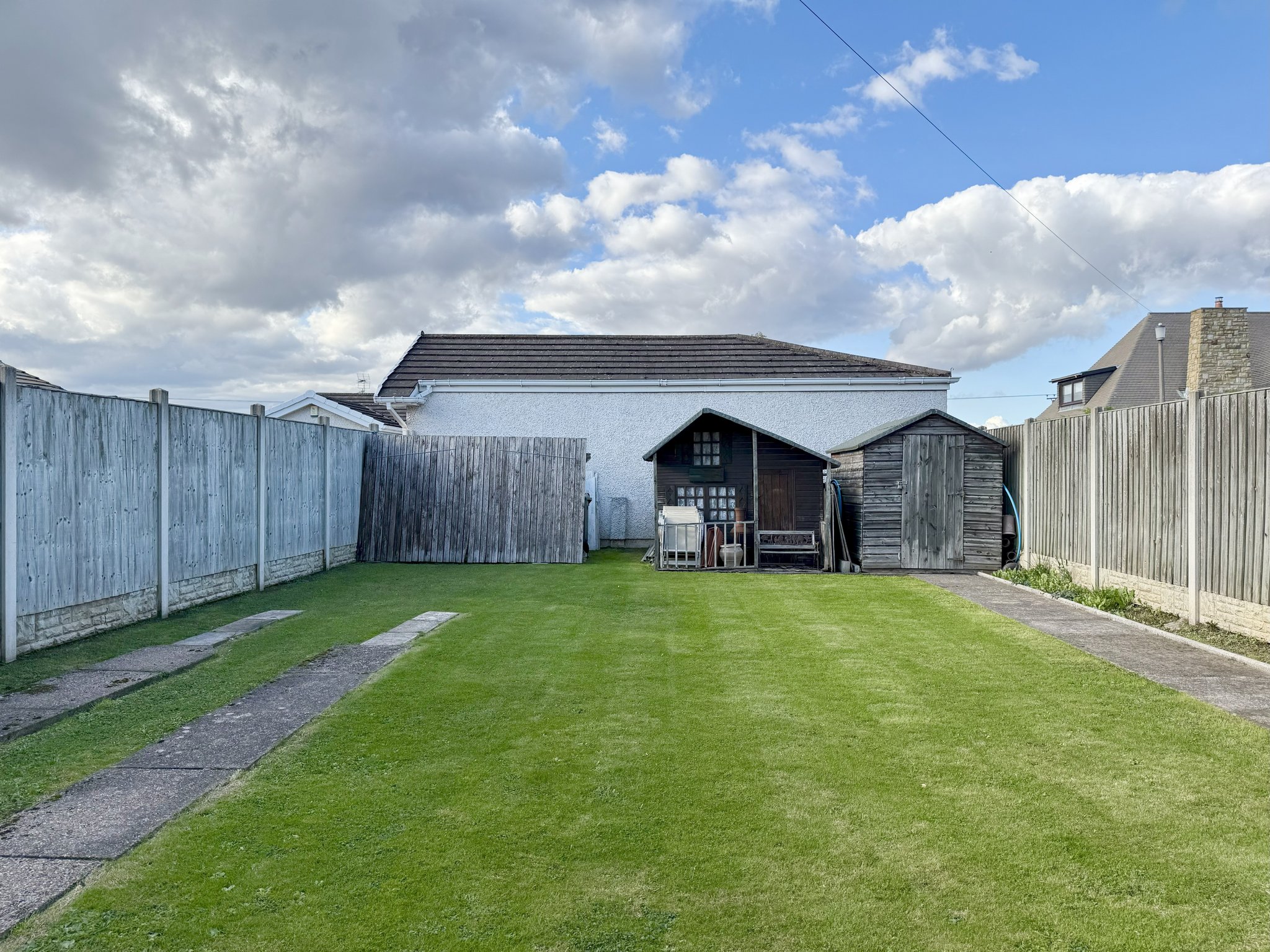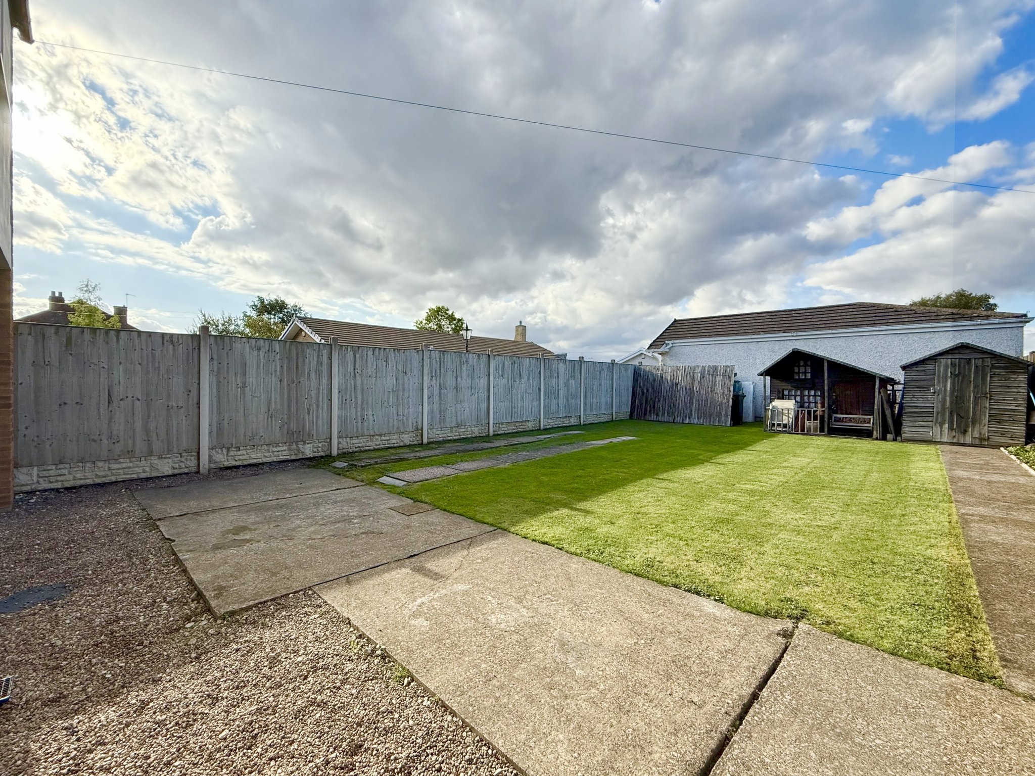 To the front of the property is a gravel driveway with a paved border, offering off-street parking for up to three vehicles. Side access leads to the large, south-facing rear garden, which is mainly laid to lawn with a patio area. The rear garden also offers the potential for further parking and/or extension if required.