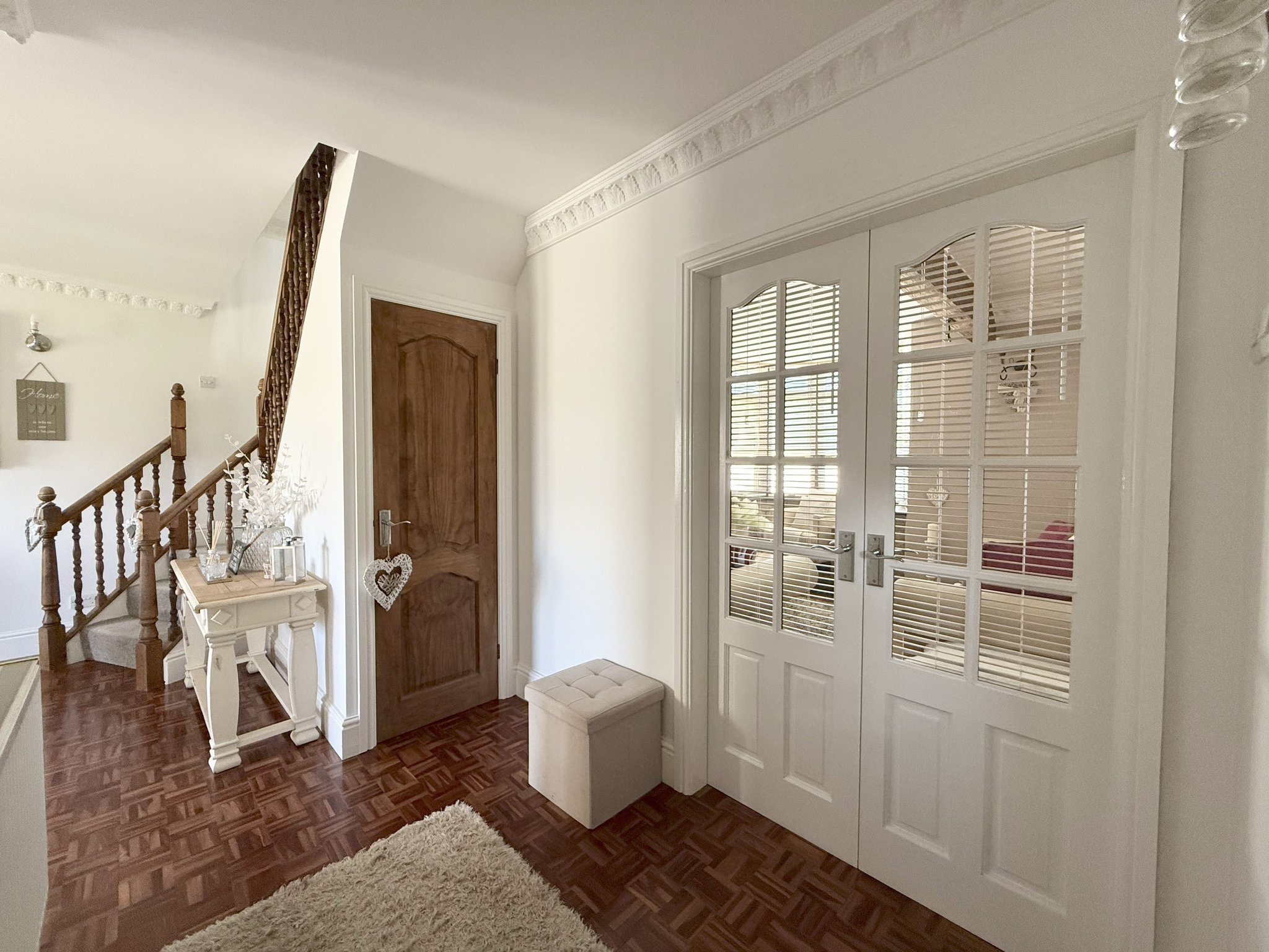 The entrance hall provides access to the lounge, dining room and the staircase to the first floor. It features beautiful parquet wood flooring, a single pendant light fitting, store cupboard, and a radiator.