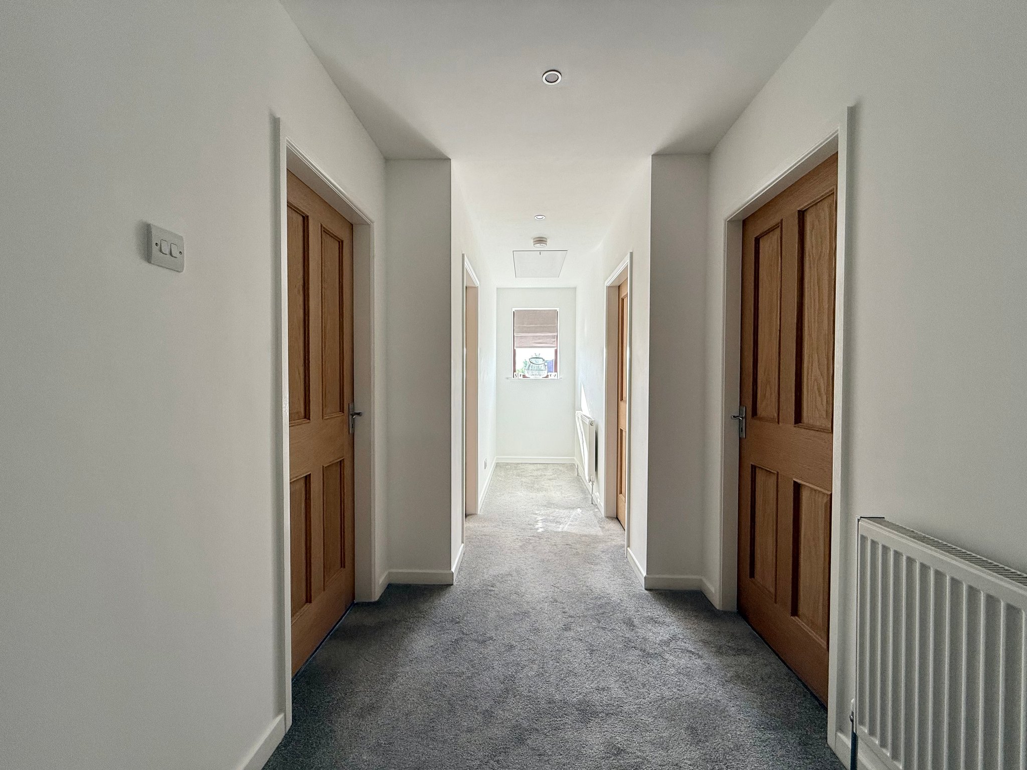 The landing provides access to all four bedrooms and the family bathroom. It is fitted with plush carpet, includes a radiator, and gives access to the fully boarded loft space with fixed ladder and lightning.