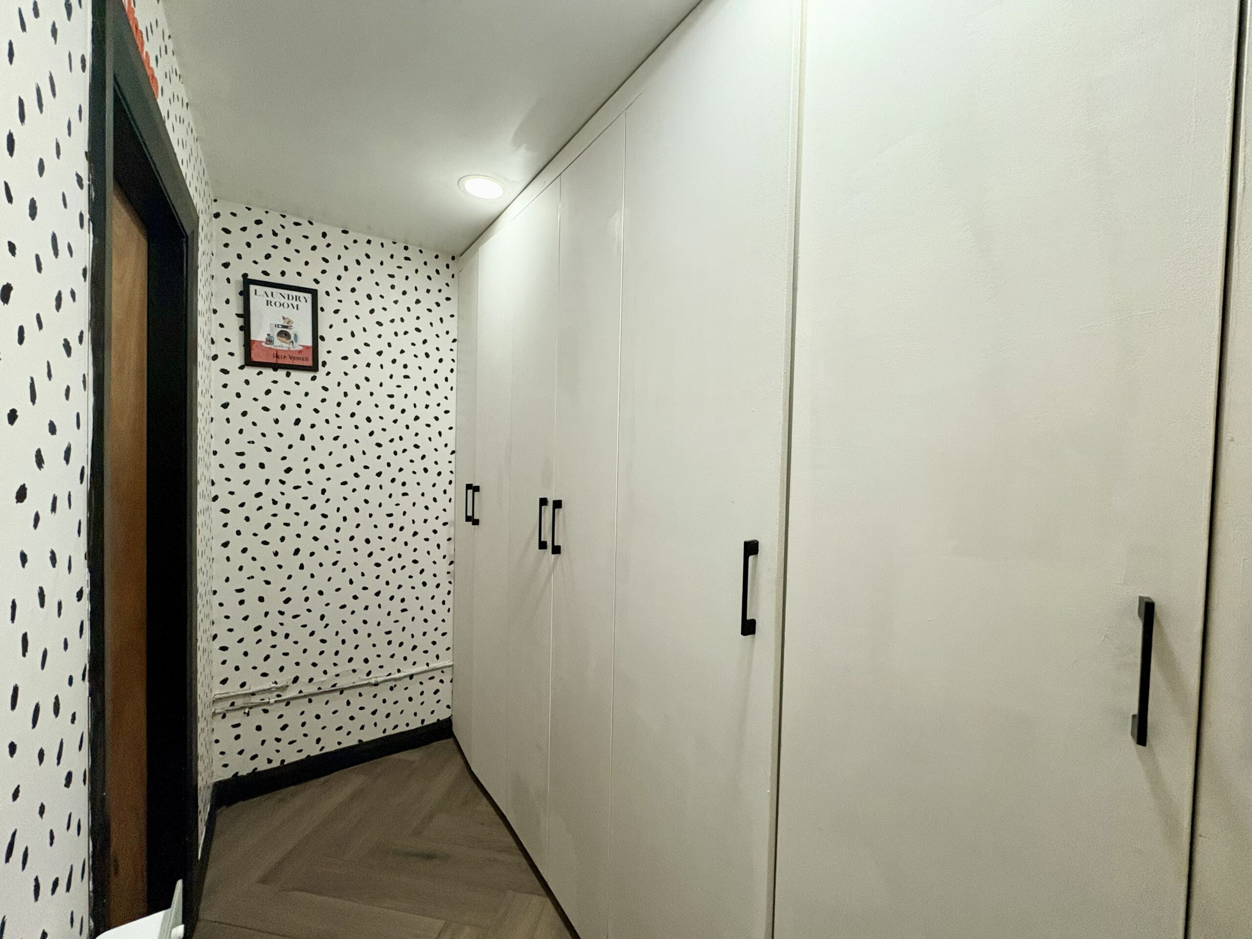 The utility area provides additional practicality with floor-to-ceiling cupboards housing the washing machine, space for a tumble dryer and shelving for domestic storage. The area includes spot lighting, an electric radiator and matching herringbone flooring, along with internal access to the garage.