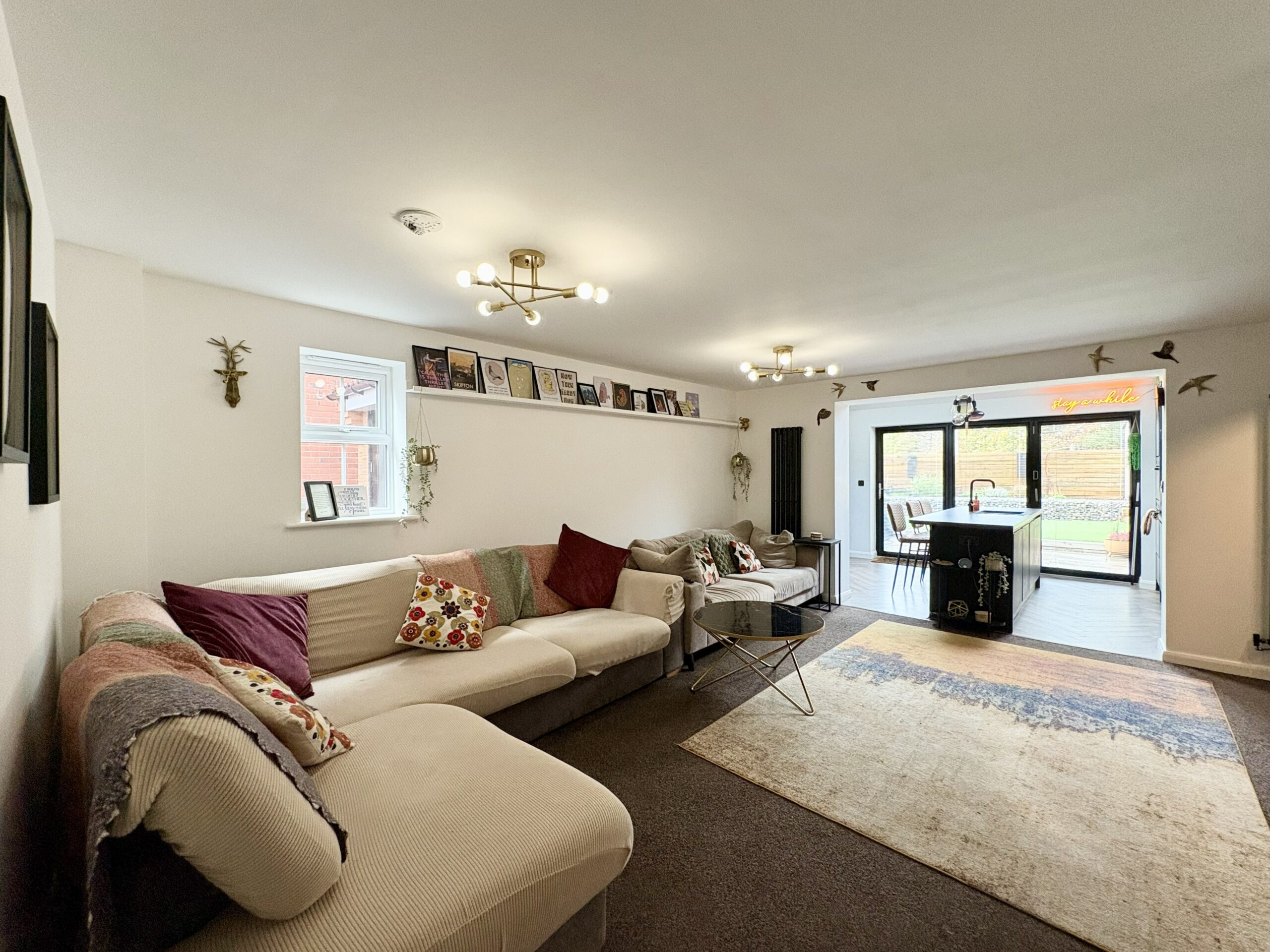 The lounge is a spacious and comfortable reception room with fitted carpet, two tall column radiators and two pendant light fittings, creating a warm and inviting environment for everyday family living.