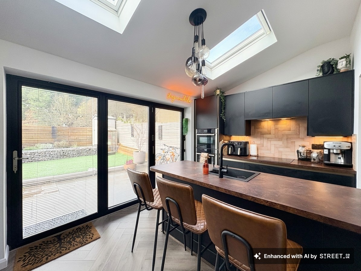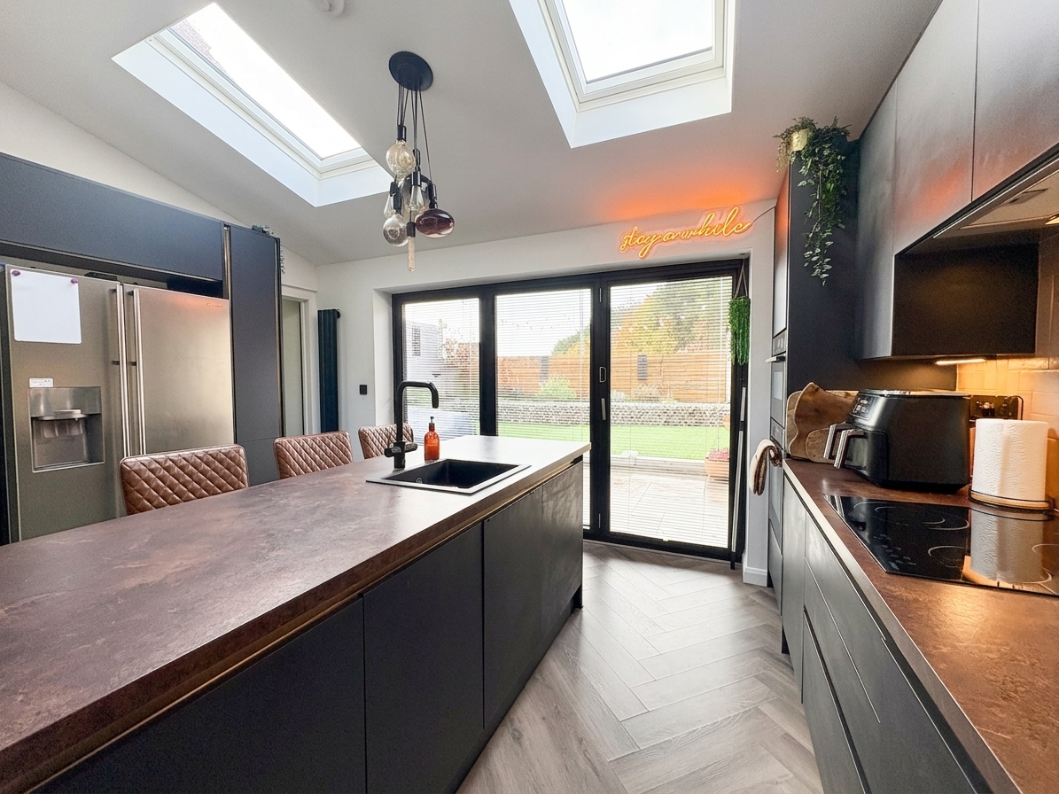 Forming the heart of the home, the impressive open-plan kitchen and dining area showcases a modern extension finished to a high standard. The contemporary fitted kitchen includes contrasting worktops and a central island, with integrated appliances comprising a dishwasher, washing machine, induction hob with built-in extractor, and a double oven/microwave. There is space for a fridge freezer. Natural light floods the room through two skylights and expansive bi-fold doors that open directly onto the south-west-facing rear garden, creating a seamless indoor outdoor flow ideal for entertaining and family gatherings. Stylish herringbone wood-effect laminate flooring and a feature pendant light over the island enhance the modern feel of the space.