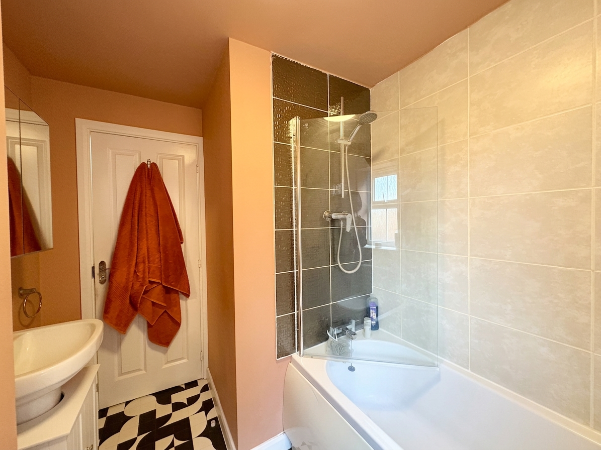 The family bathroom is fitted with a bath with shower over, WC and hand basin. It features vinyl flooring, part-tiled walls, a side-aspect obscure-glass window, heated towel rail and single pendant light fitting, creating a bright and modern space.