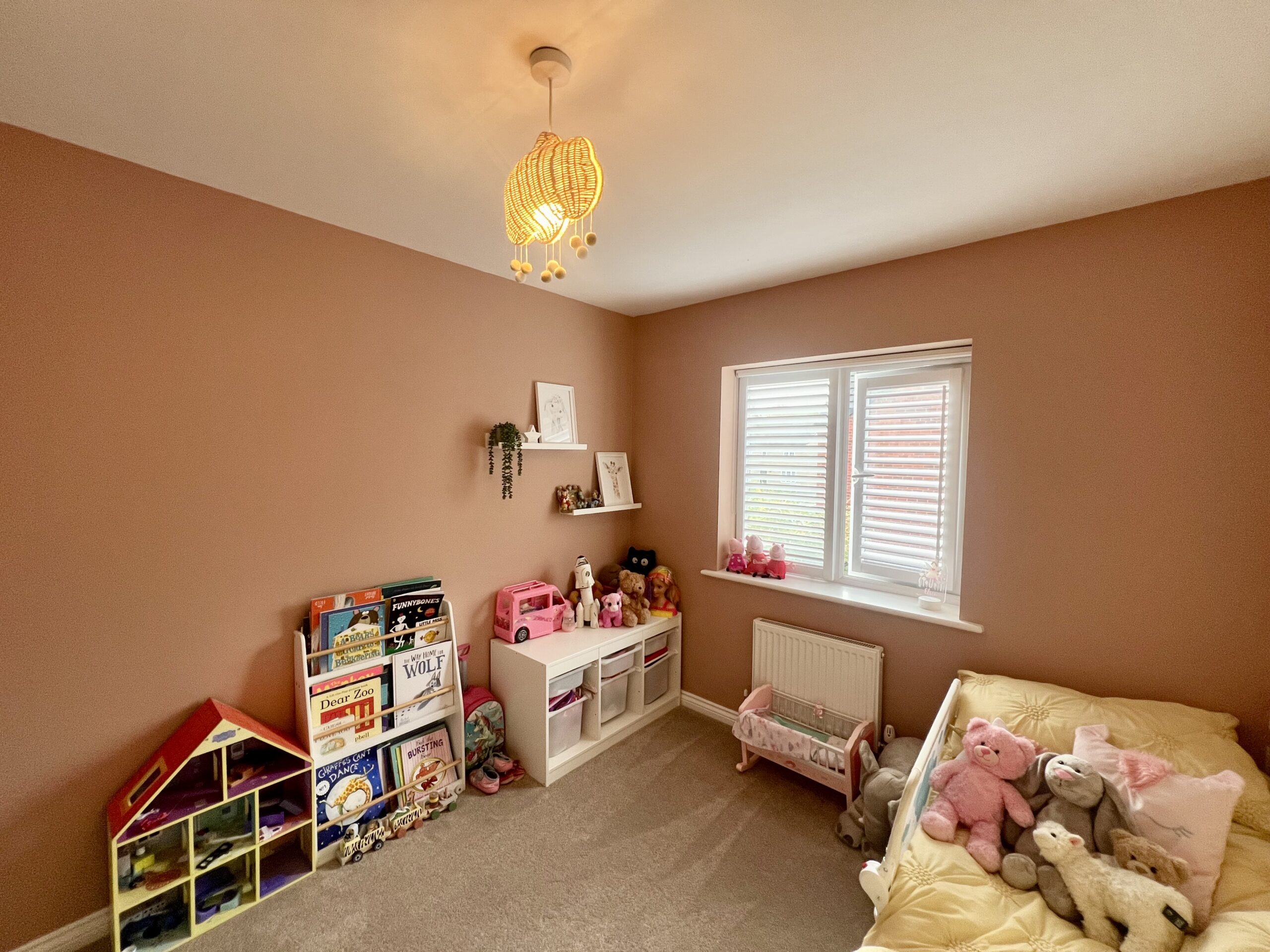 Bedroom two is a well-proportioned double room located at the rear of the property. It features window shutters, carpet flooring, a central heating radiator and a single pendant light fitting, creating a comfortable and stylish space.