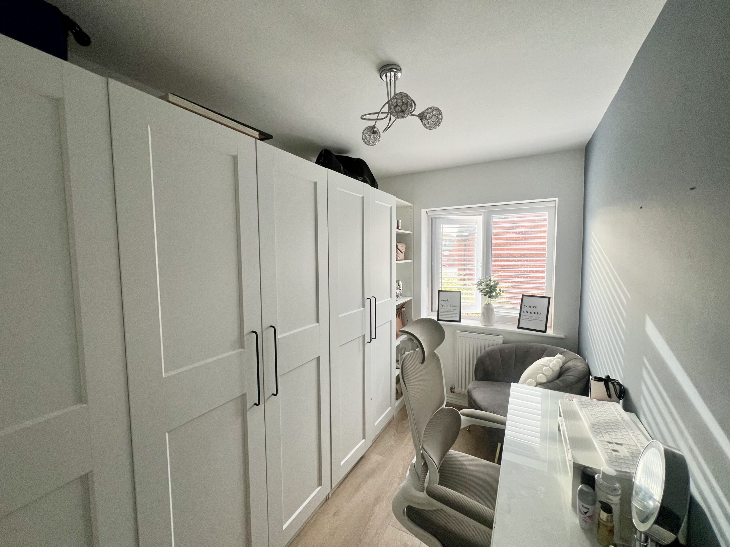 Bedroom three is currently being used as a study and walk in wardrobe but is a well proportioned third bedroom, with shutters to window, wood effect flooring, radiator and single pendant light fitting.
