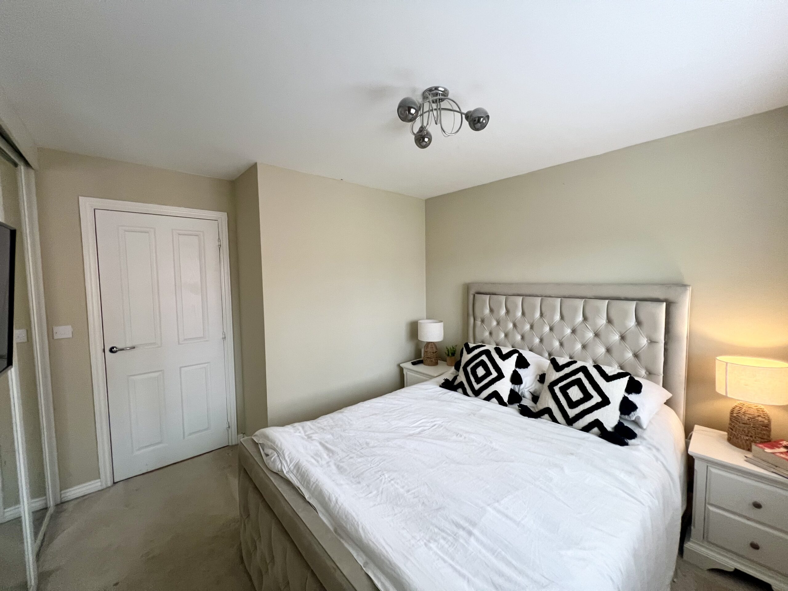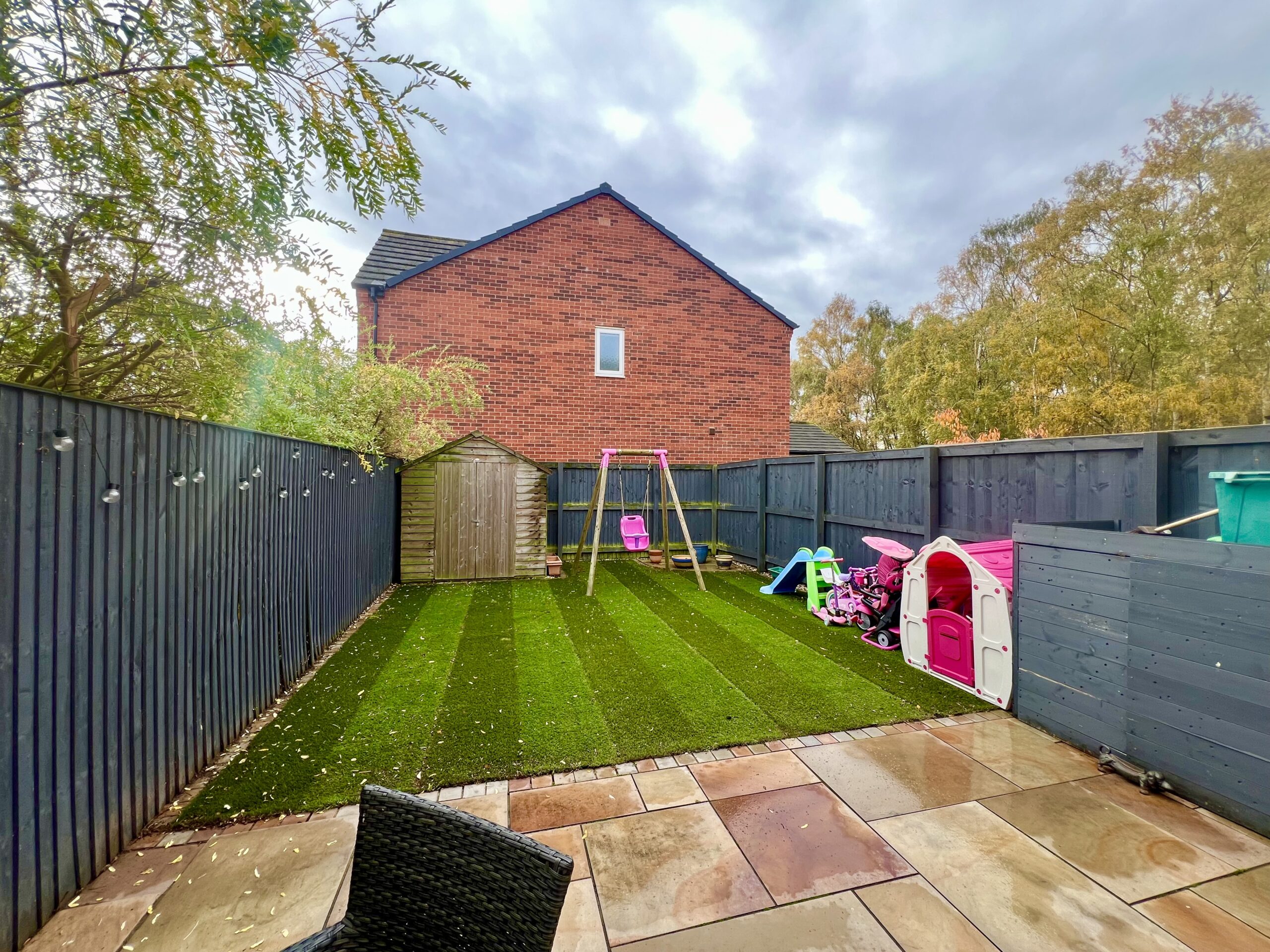 To the front of the property there are two allocated parking spaces, along with access to the front entrance and a side gate leading to the rear garden. The rear garden is beautifully presented with artificial grass, providing a low-maintenance outdoor space. It offers excellent privacy and features a patio area, perfect for socialising and entertaining.