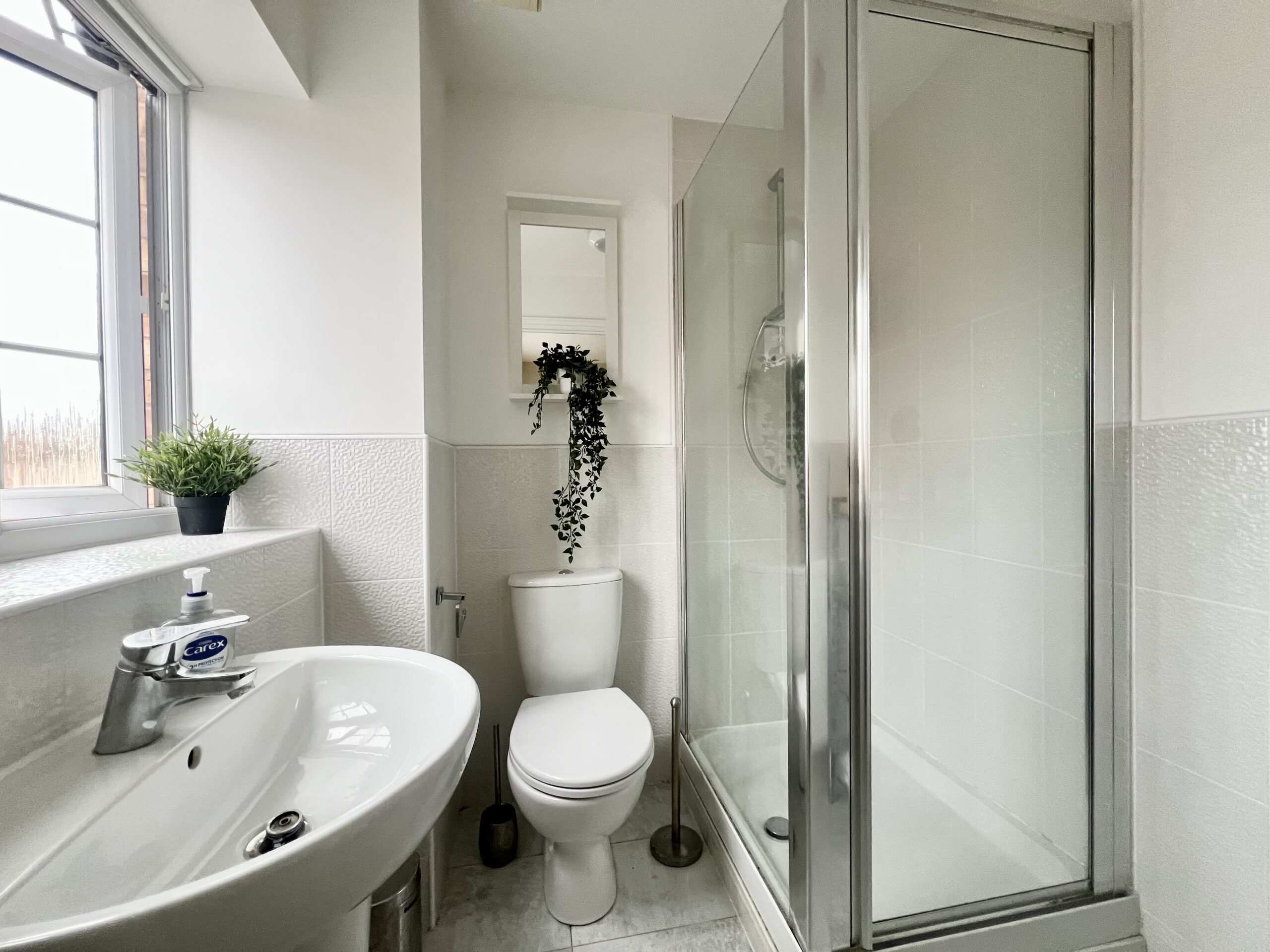 The ensuite is located at the front of the property and features an obscure window for privacy. It is partly tiled and includes a shower cubicle, WC, hand basin, and a central heating radiator.
