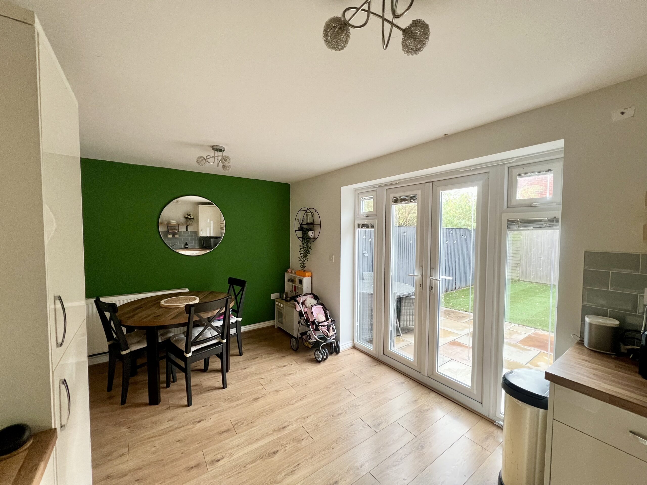 The spacious kitchen/diner is fitted with a range of wall and base units, offering ample storage and worktop space. Integrated appliances include a dishwasher, washer/dryer, fridge freezer, oven and hob. The room features wood-effect flooring and French doors that open out onto the patio and rear garden, creating a bright and inviting space ideal for dining and entertaining.
