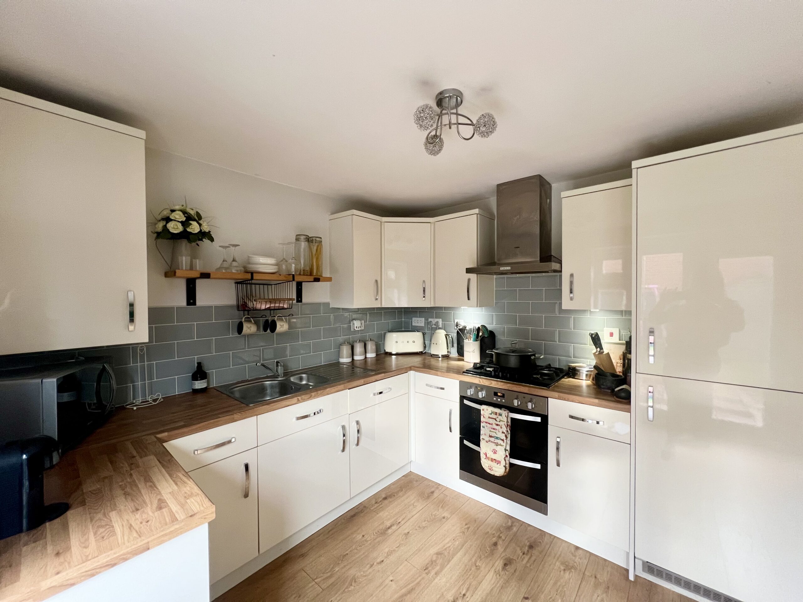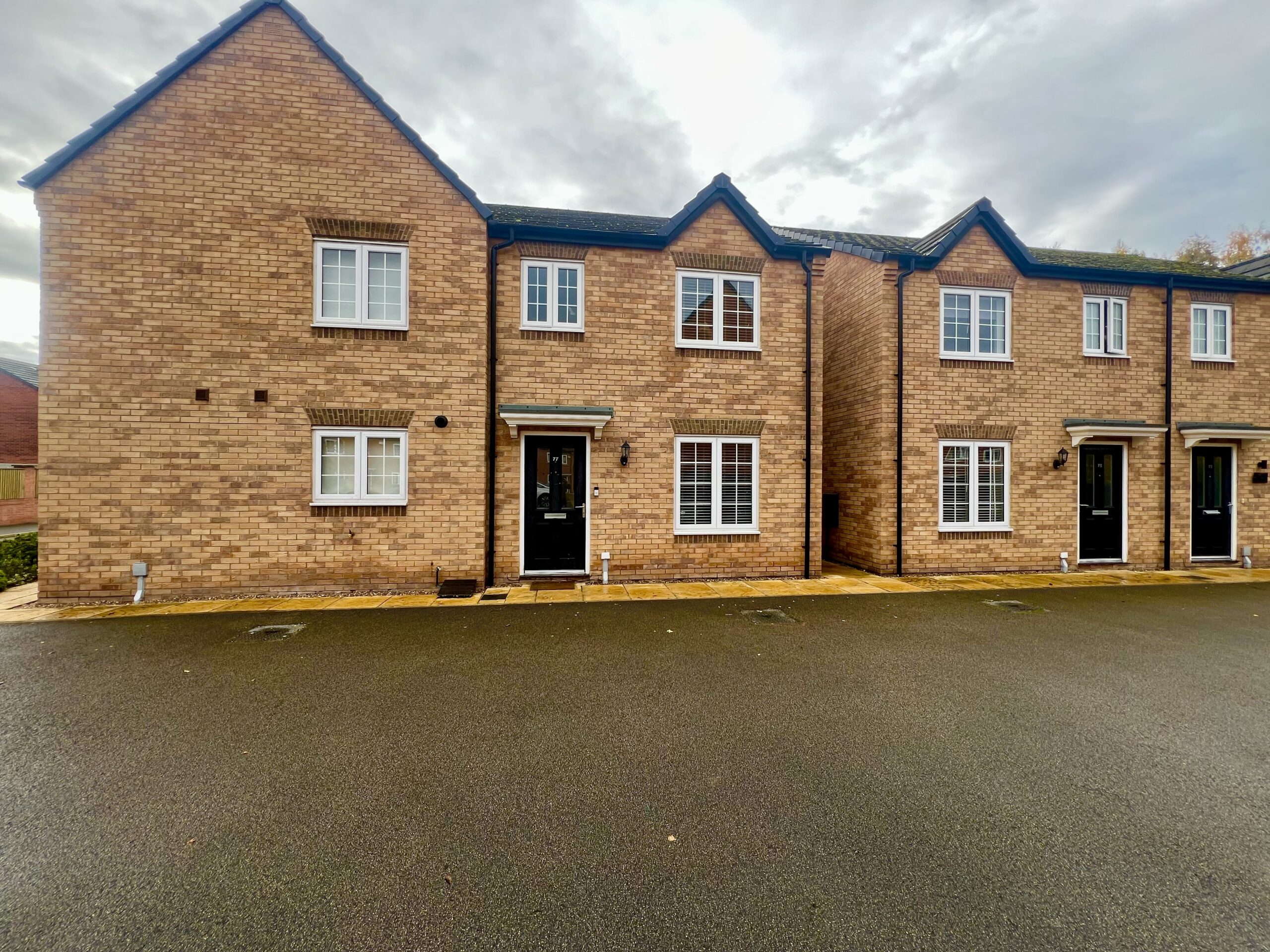 The accommodation briefly comprises a welcoming separate lounge, a modern fully fitted kitchen and dining area with patio doors leading to the rear garden, and a convenient ground floor WC. Upstairs, the property offers a principal bedroom with ensuite shower room, two further well-proportioned bedrooms and a contemporary family bathroom. Externally, there is parking for two cars and a landscaped rear garden, perfect for family living or entertaining.
