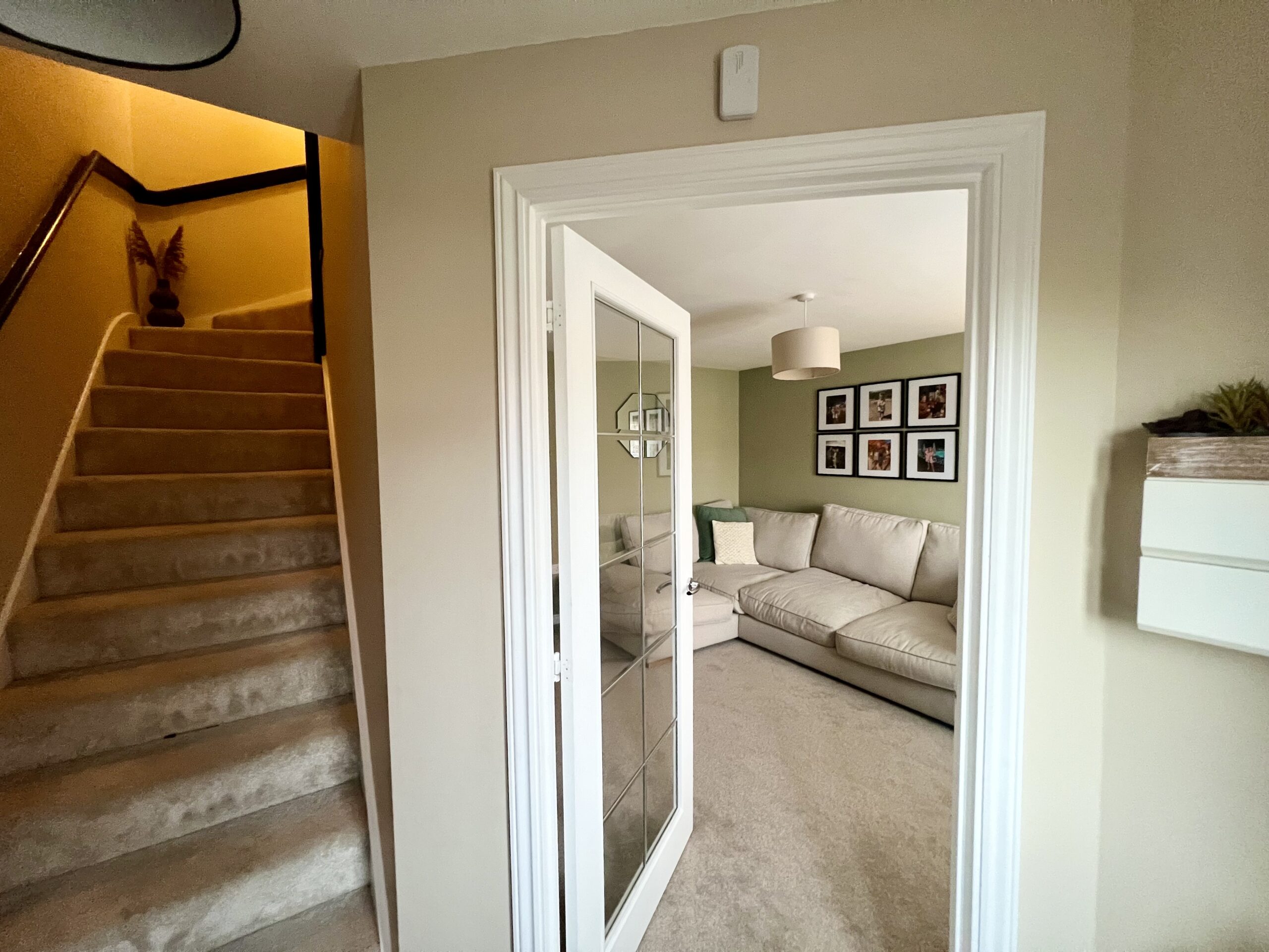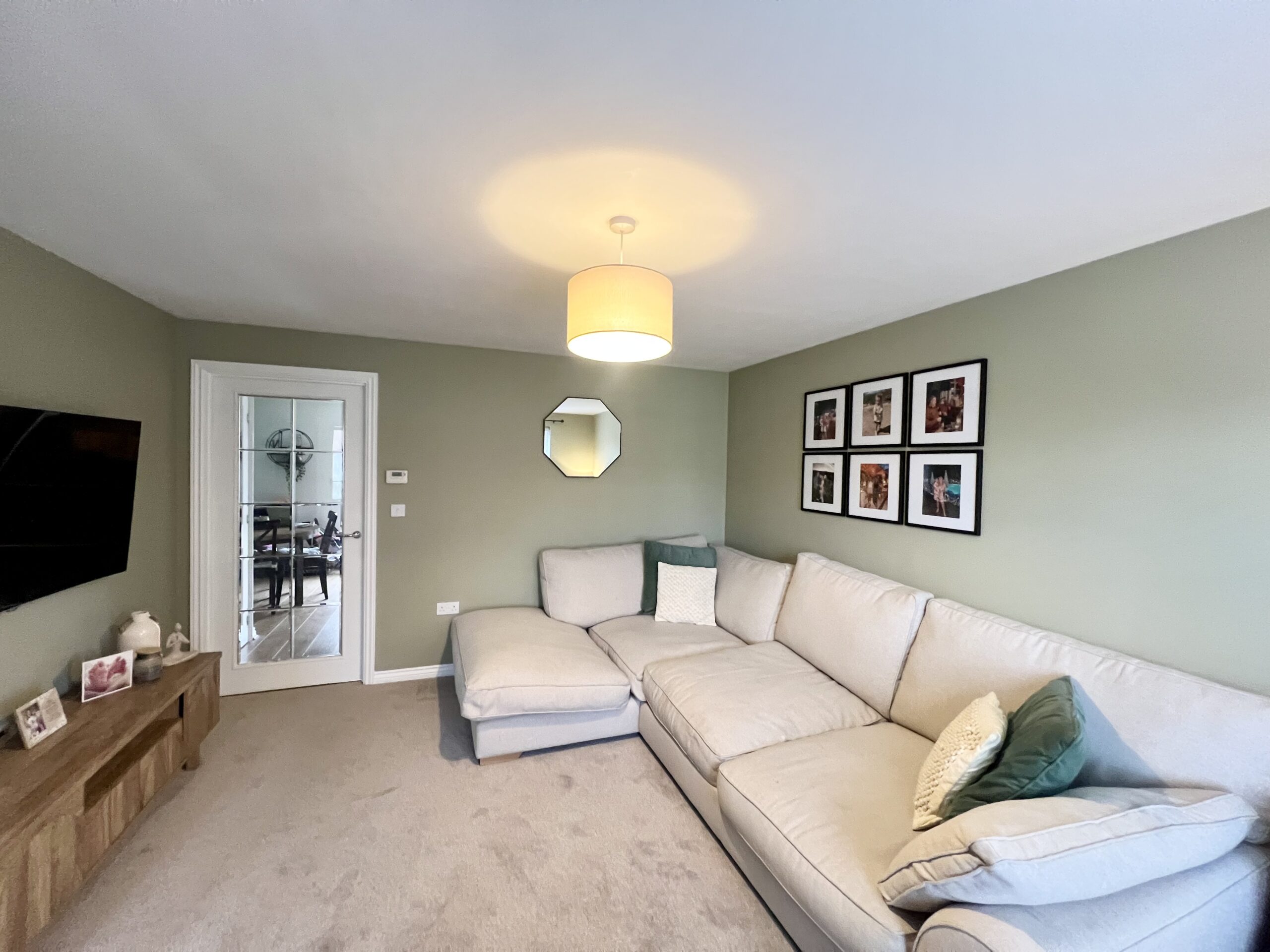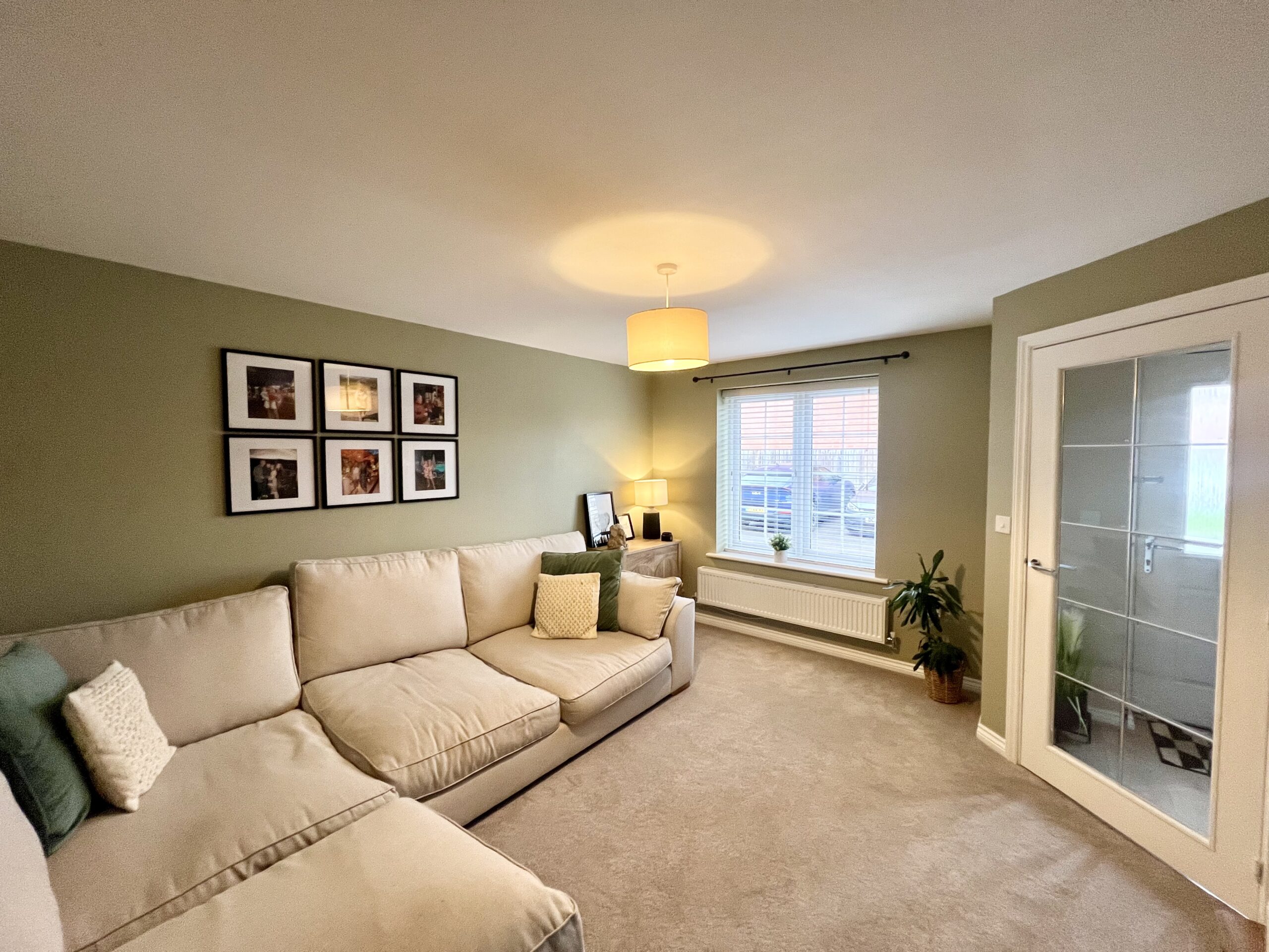 The lounge is fitted with carpet flooring and features a front-facing window with fitted blinds, a single pendant light fitting and a central heating radiator. This comfortable living space is ideal for relaxing and offers access to the kitchen/diner and the downstairs WC.