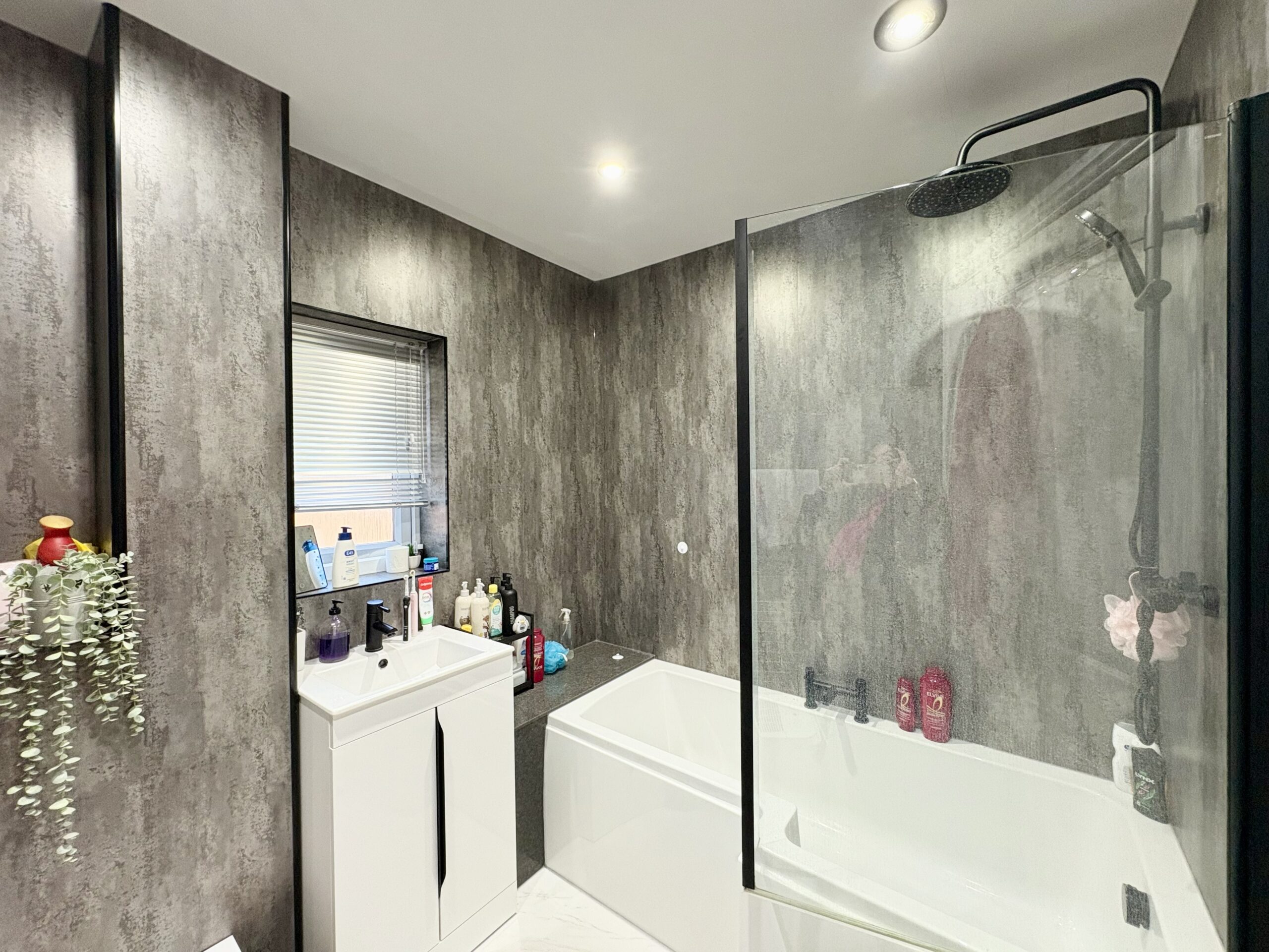 with shower above, WC and wash hand basin. An obscured side-aspect