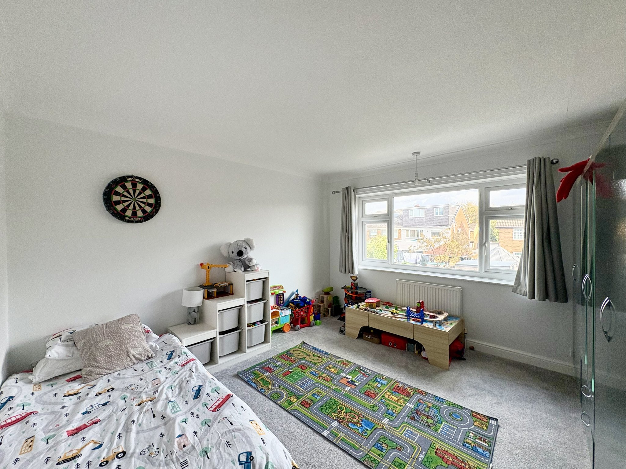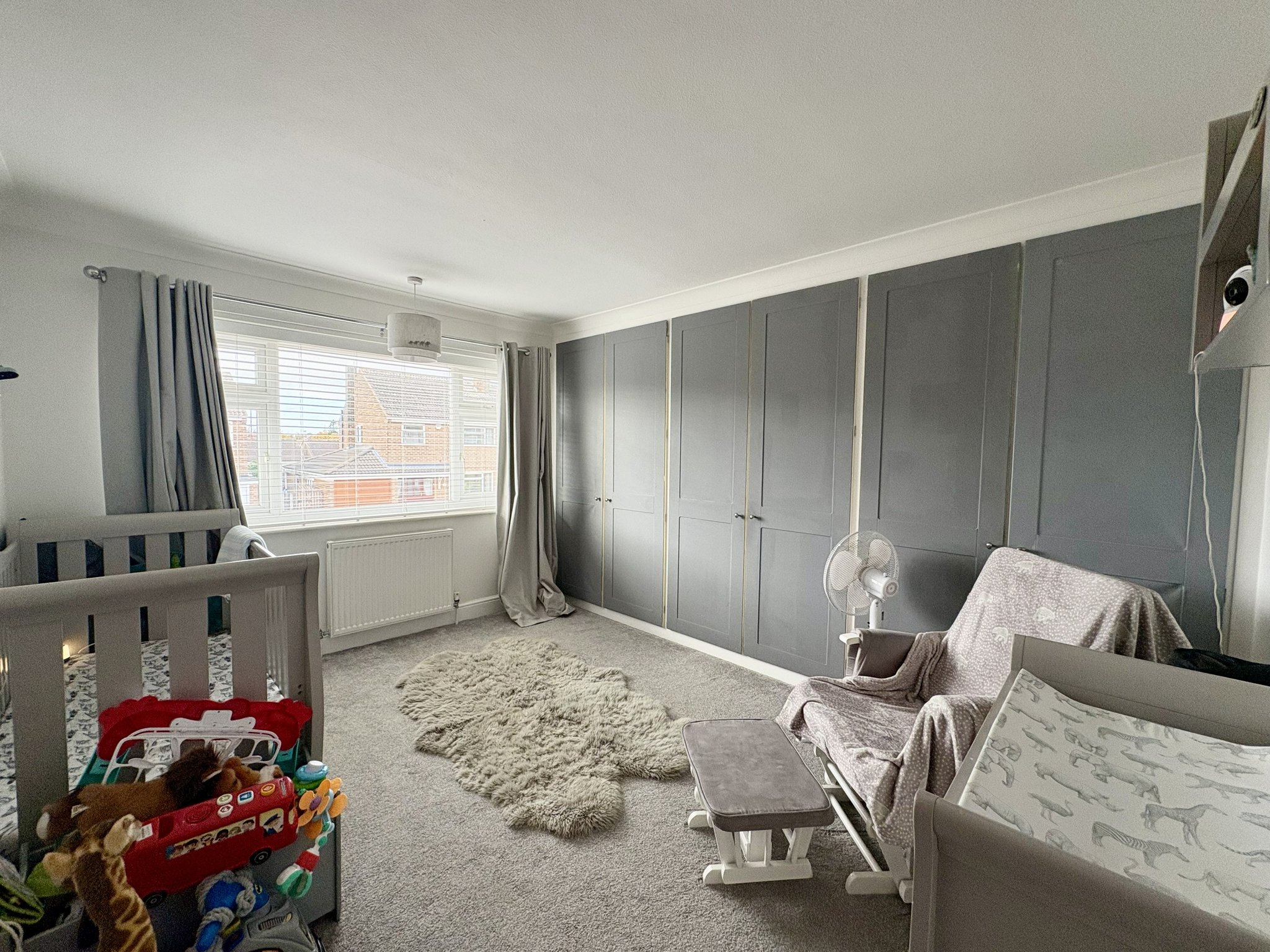 Bedroom Three is another generous double with a rear-aspect window, carpet flooring, radiator, and single pendant light fitting.