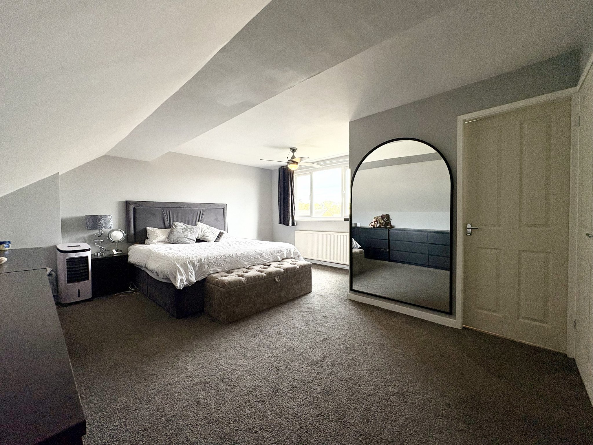 Second Floor - The principal bedroom is a spacious and tranquil retreat with a rear-aspect window, carpet flooring, radiator, single pendant light fitting, and ample eaves storage. The ensuite shower room is fitted with a walk-in shower, hand basin, WC, heated towel rail, and tiled flooring with part-tiled walls. A rear-aspect obscure glass window provides natural light, and spot lighting enhances the contemporary finish.