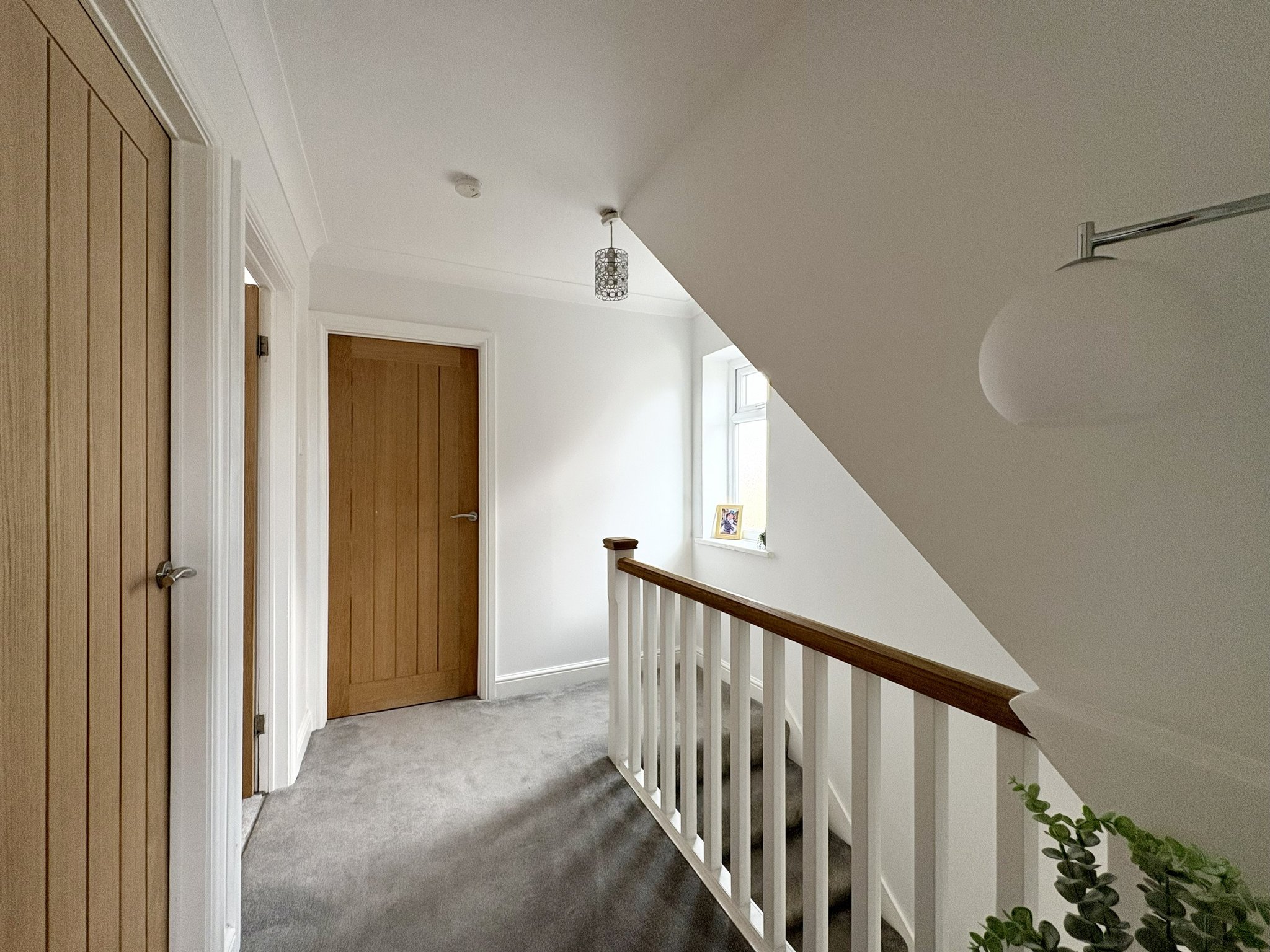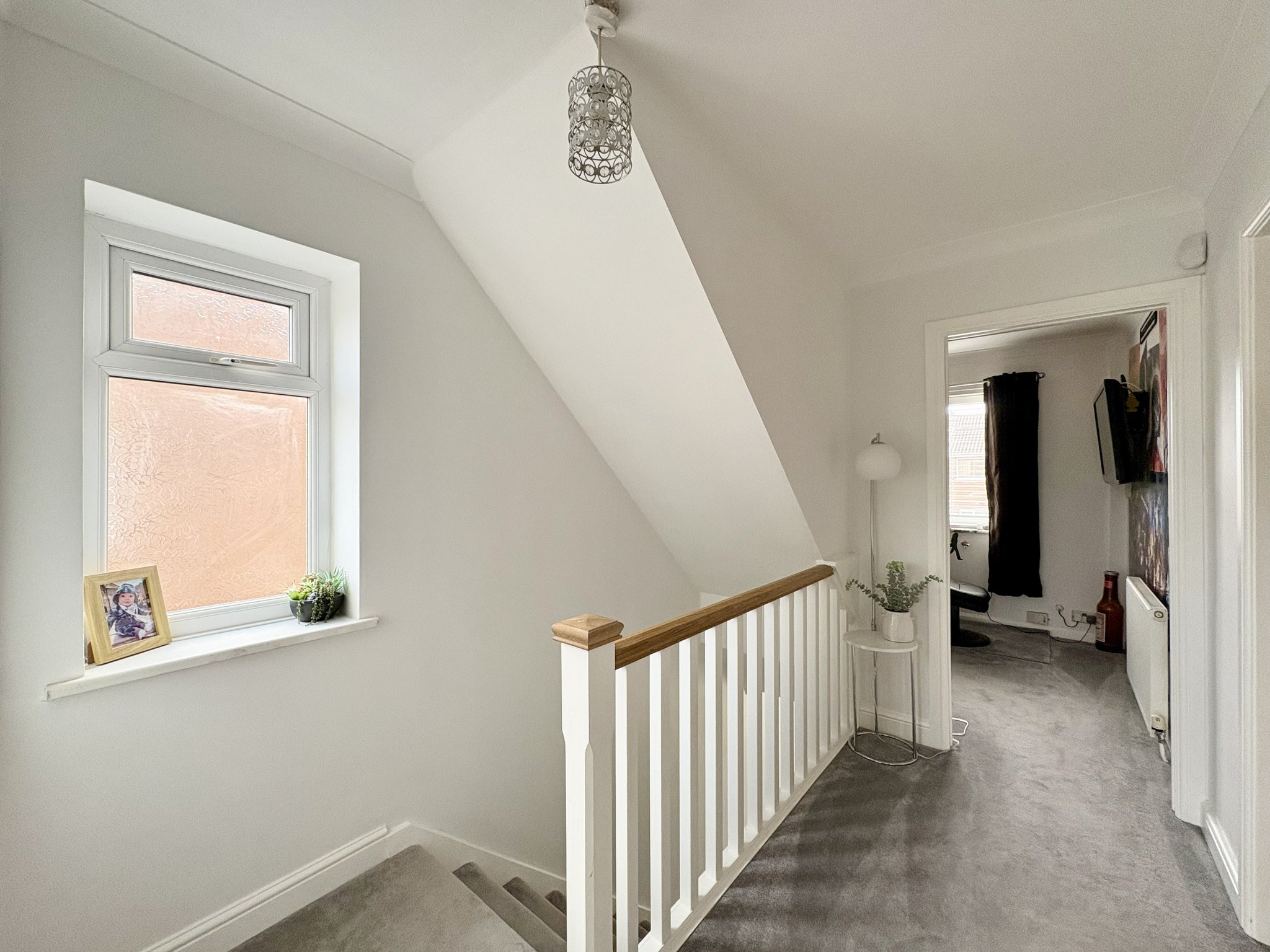 First Floor - The first-floor landing is carpeted, with a single pendant light fitting, radiator, and a side-aspect window providing natural light.