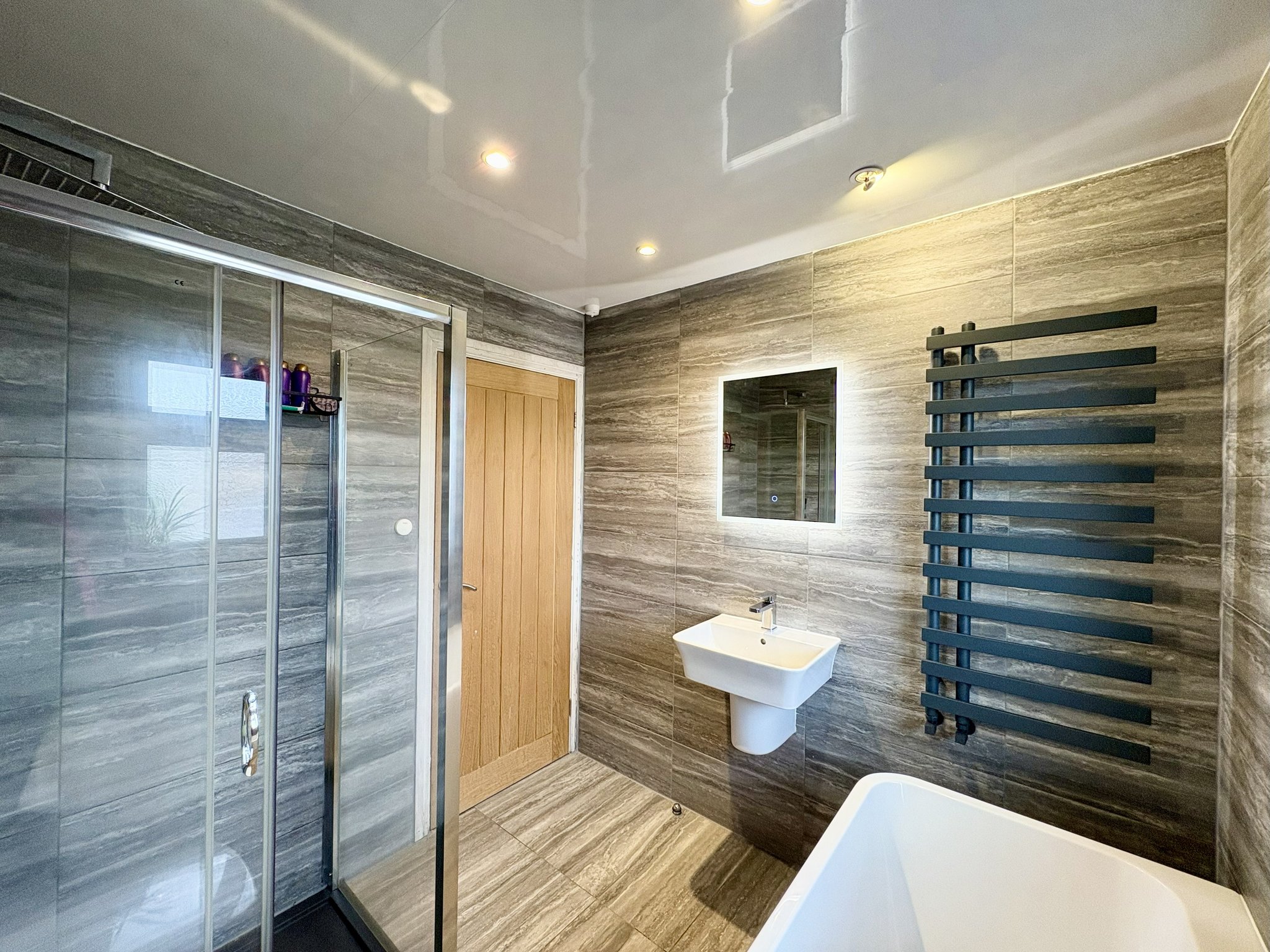 The family bathroom is beautifully designed with full wall and floor tiling, spot lighting, and a rear-aspect frosted window. It features a freestanding bathtub, a large walk-in shower, hand basin, WC, and a heated towel rail, creating a luxurious modern space for relaxation.