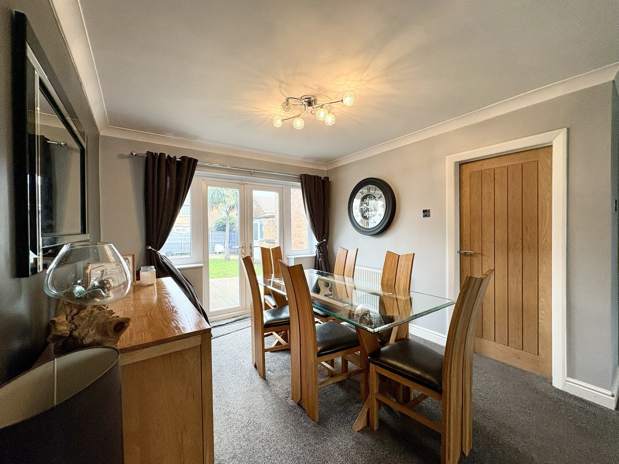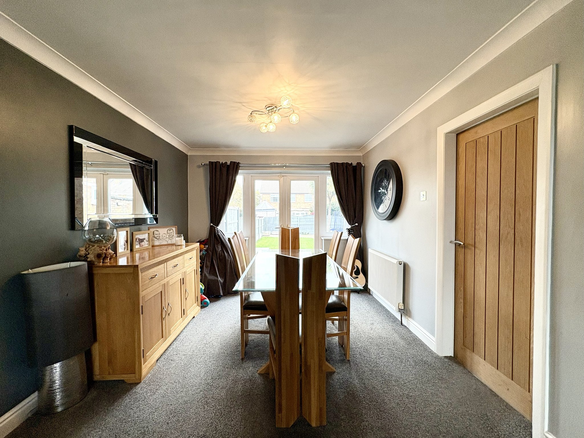The open plan dining room has carpet flooring, a radiator, single pendant light fitting, and French doors opening onto the rear decking area, creating a seamless transition between indoor and outdoor living - ideal for entertaining or family gatherings.
