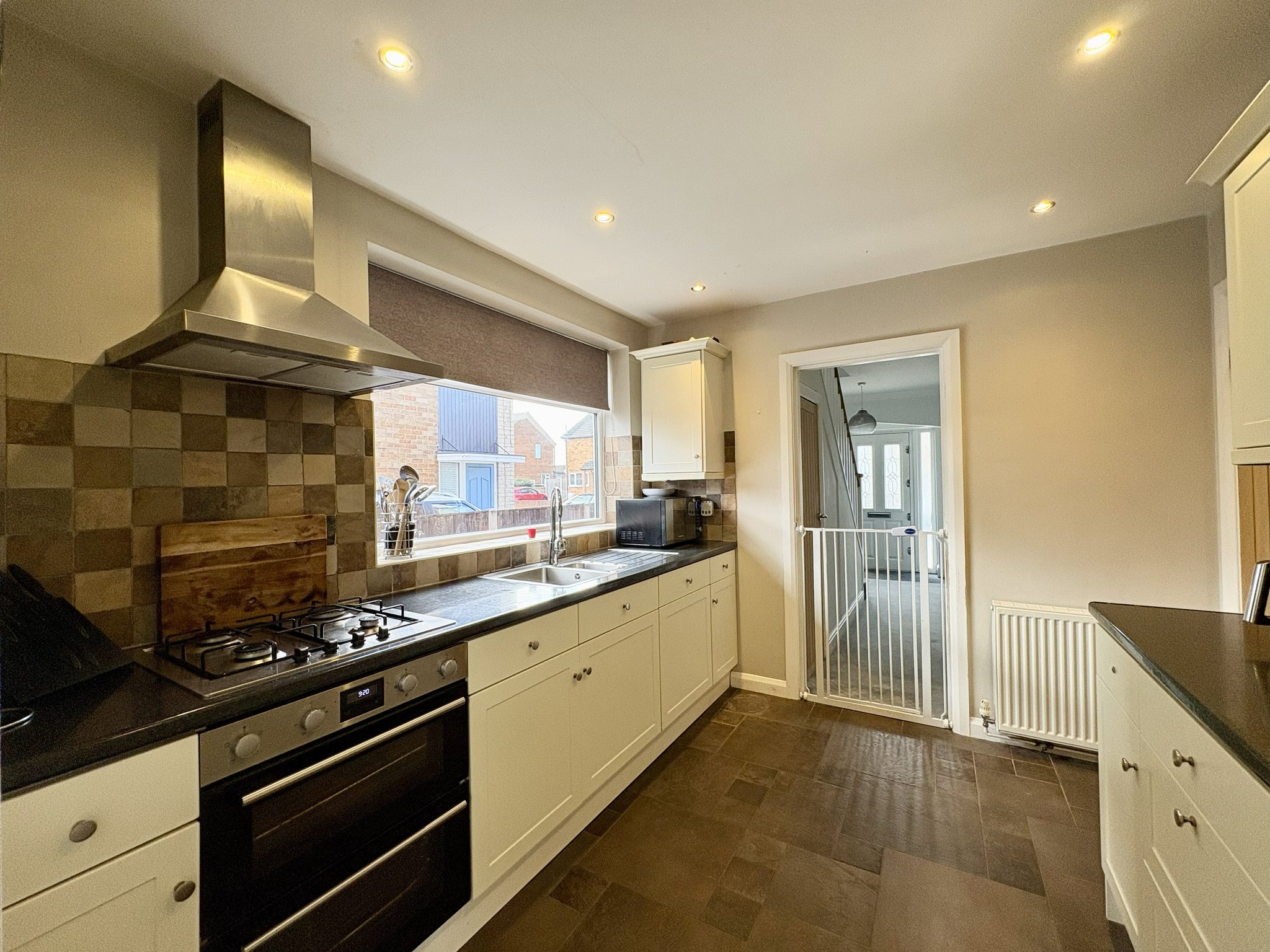 The kitchen is modern and well-equipped, fitted with a range of cream shaker-style wall and base units with contrasting black worktops. Integrated appliances include an oven, hob, grill, extractor fan, and dishwasher. The room has tiled flooring throughout, spot lighting, and a side-aspect window allowing plenty of light.