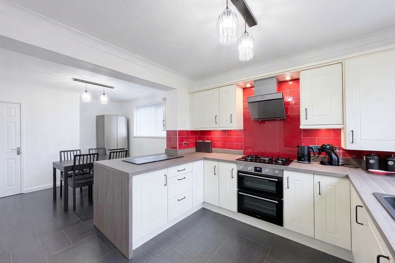 Kitchen / Dining Room - Forming the heart of the home, the generous kitchen and dining area has been thoughtfully designed for both everyday family life and entertaining. The kitchen is fitted with cream shaker-style wall and base units, complemented by contrasting work surfaces and a central breakfast bar providing additional storage and informal seating. Integrated appliances include a double oven and grill, gas hob with extractor hood, dishwasher and washing machine. The space is finished with tiled flooring, spot lighting, radiator and pendant lighting.
