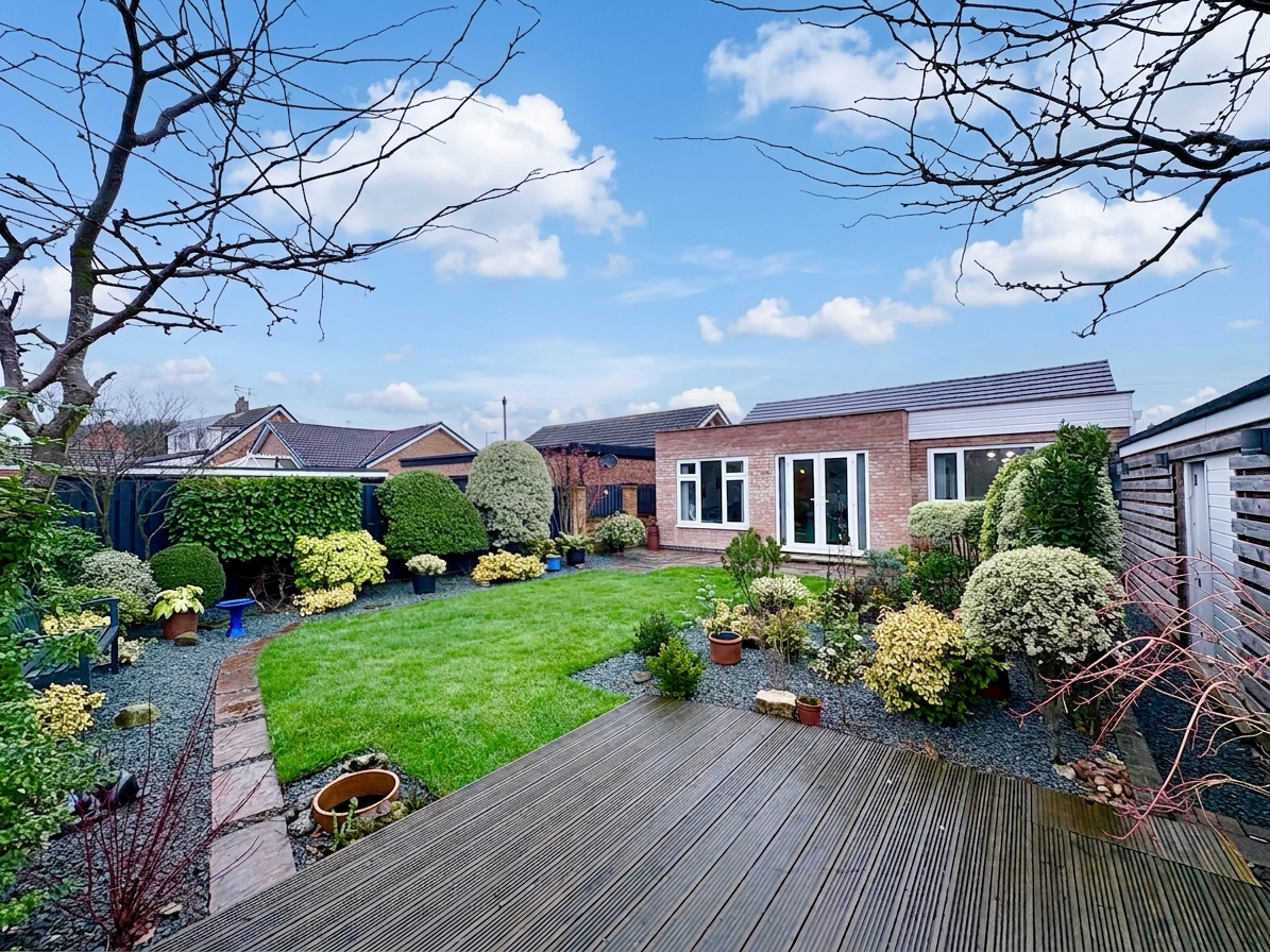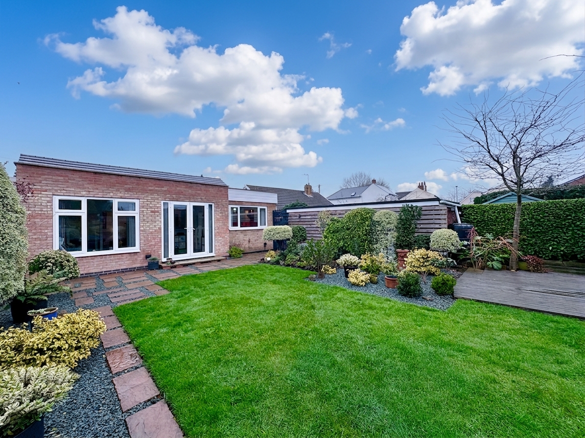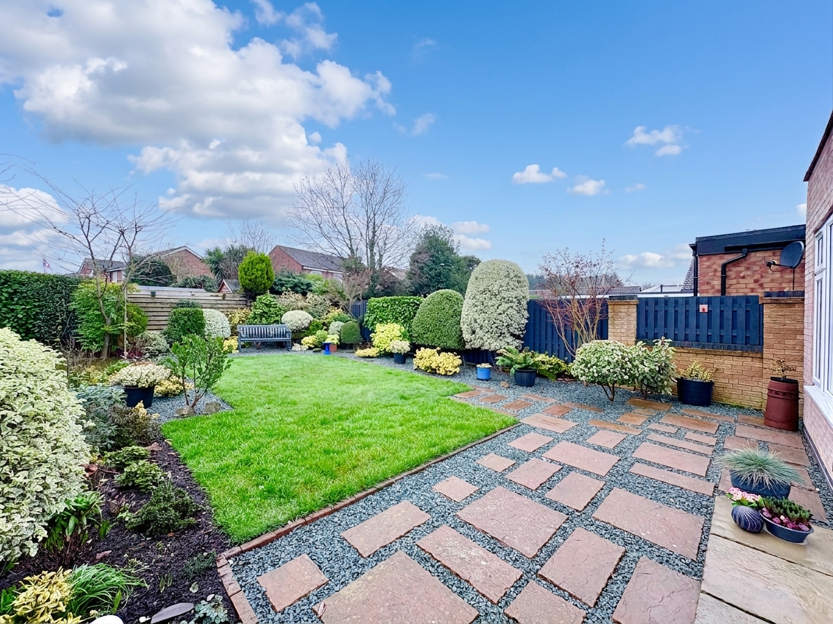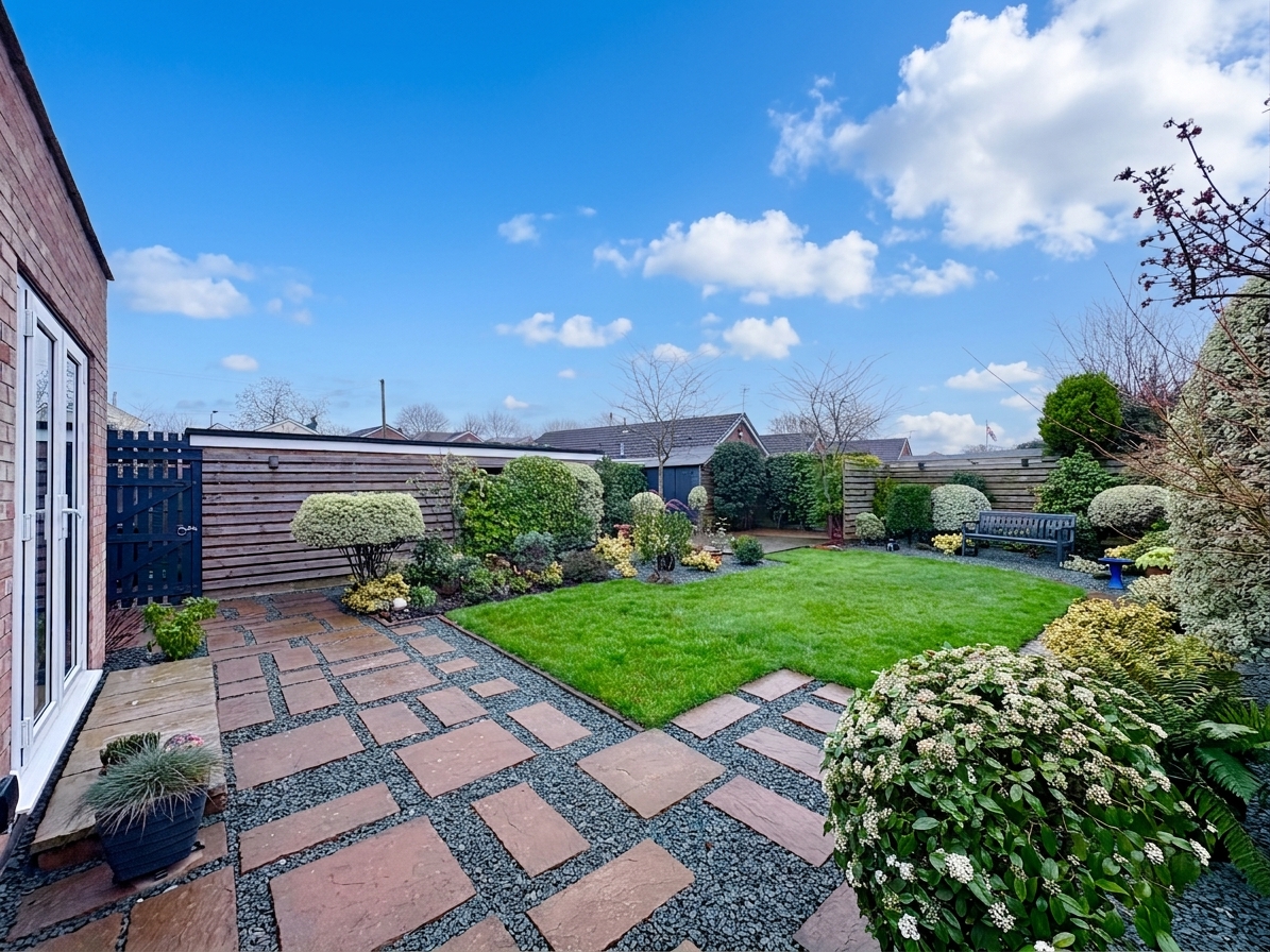 The property sits on a generous plot with a front garden and block-paved driveway providing off-road parking for up to three vehicles. To the rear lies a beautifully maintained south-facing garden, a true feature of this home. The garden enjoys a large lawned area bordered by mature planting, small trees and shrubs, creating a private and tranquil setting. There are two separate patio areas, ideal for outdoor dining and entertaining, along with a decked seating area perfectly positioned to enjoy the sun throughout the day. A useful garden shed provides additional storage.