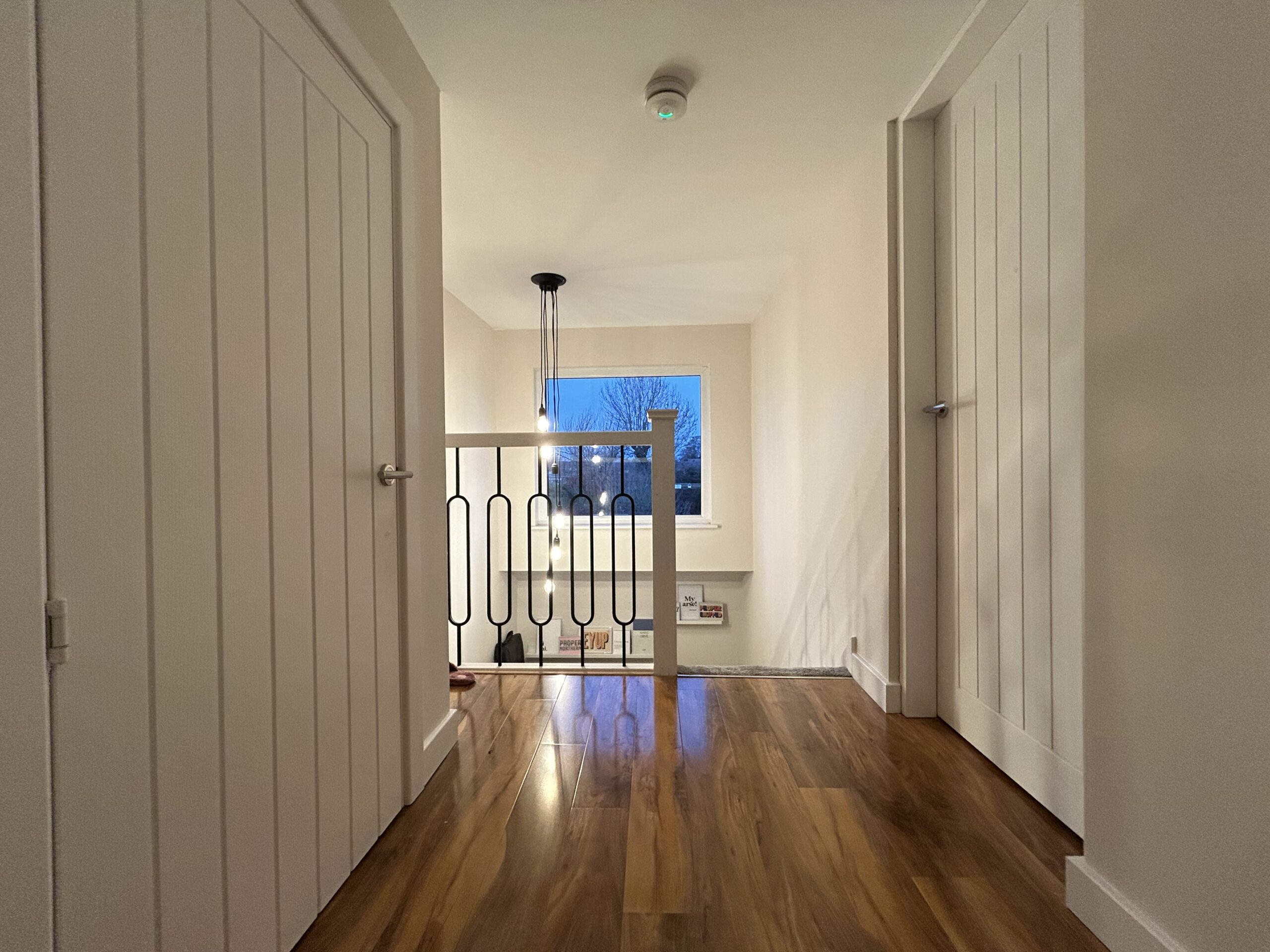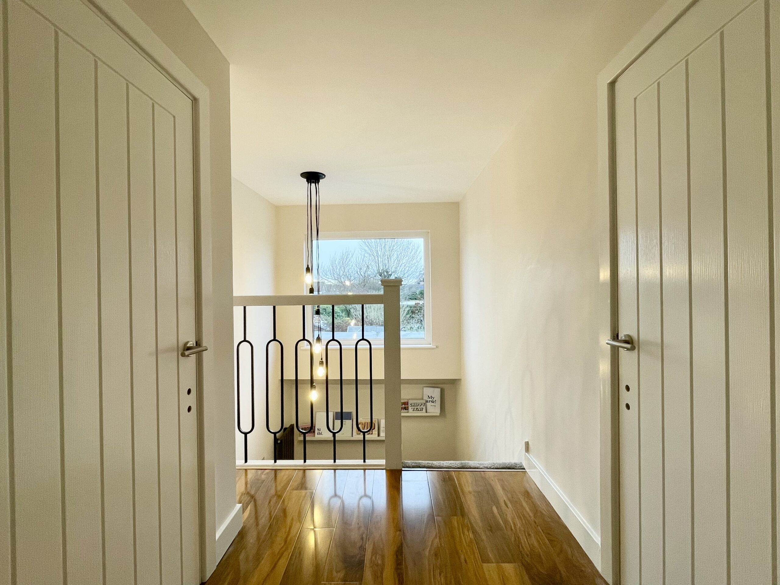 To the first floor, the landing is fitted with high-gloss wood-effect laminate flooring, a designer chandelier,