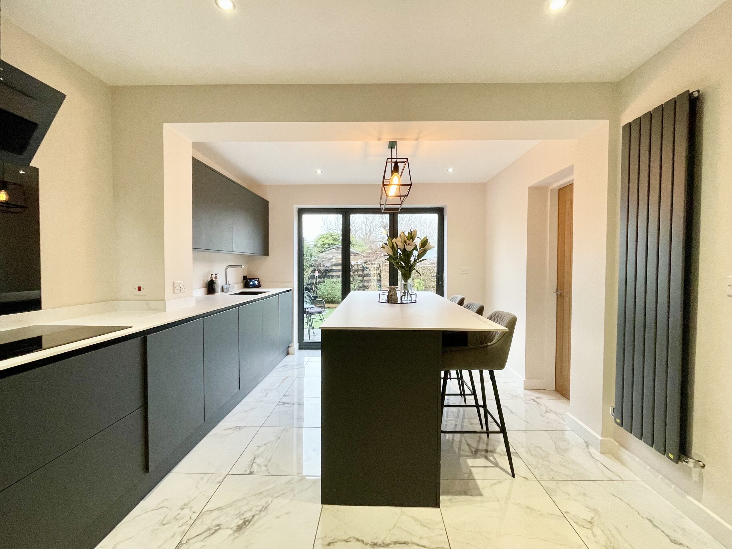 washing machine. The room is finished with tiled flooring, spot lighting, a designer radiator and bi-fold doors