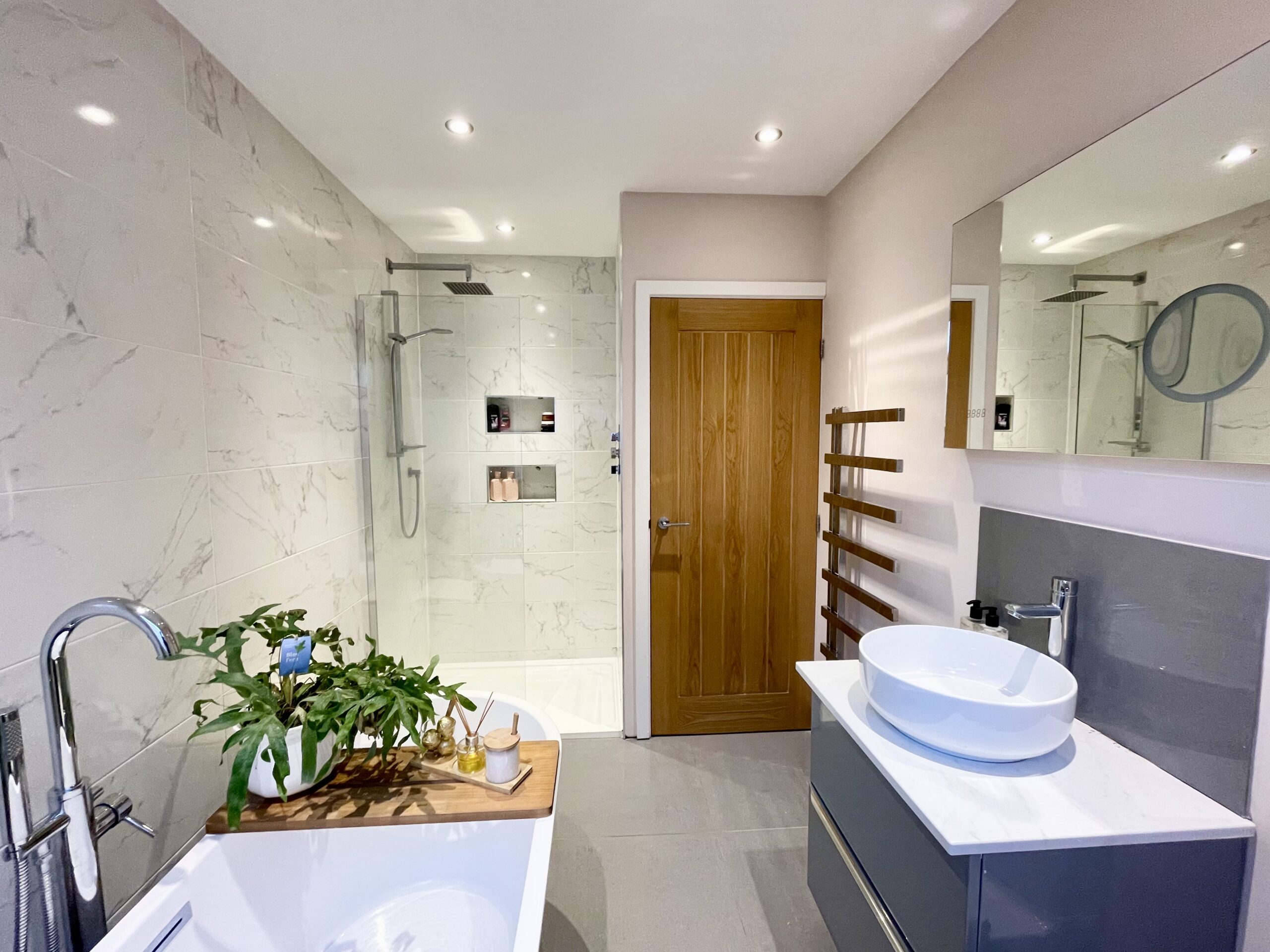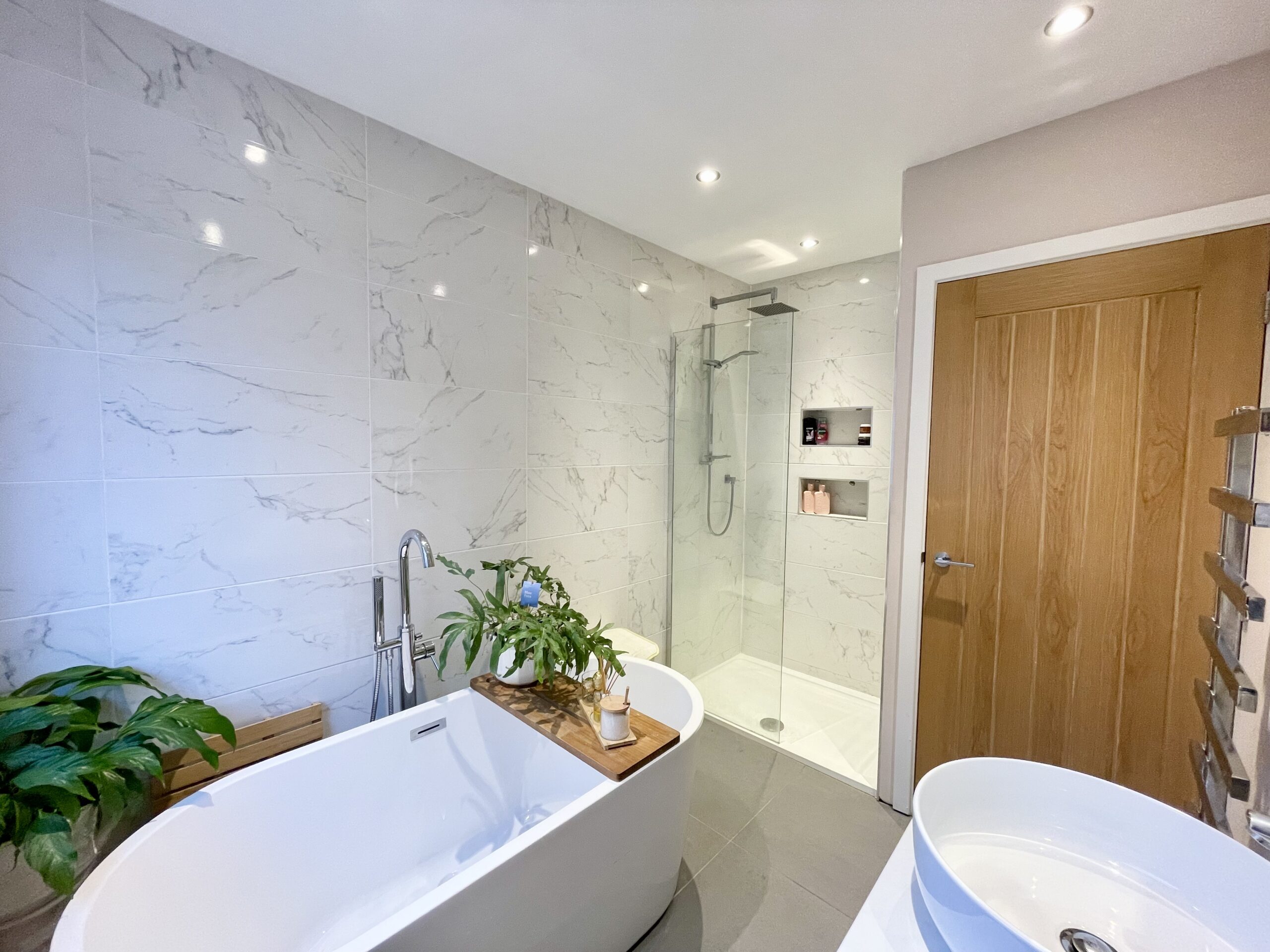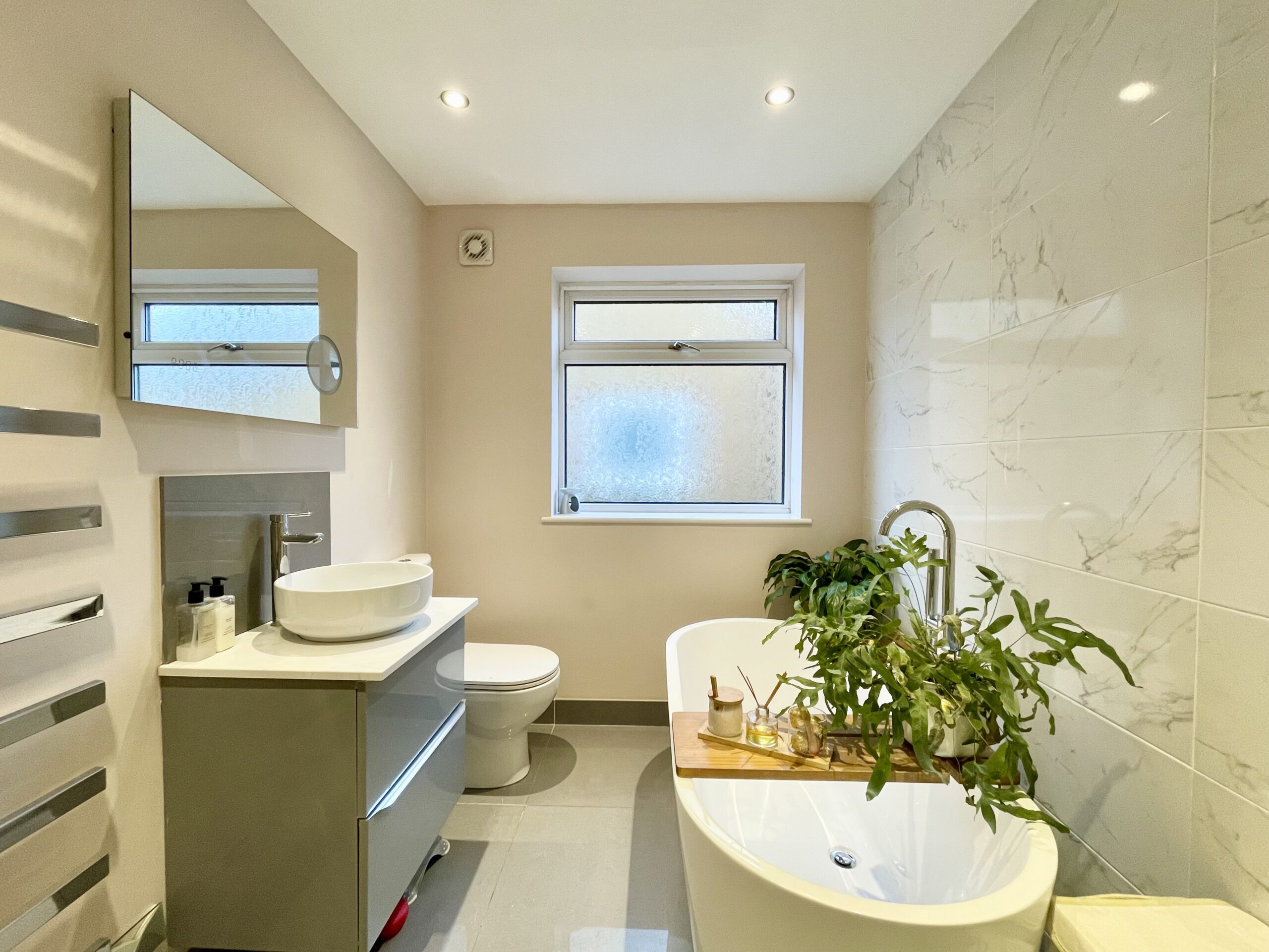 The family bathroom is finished to a high standard and comprises a white suite including a standalone bath,