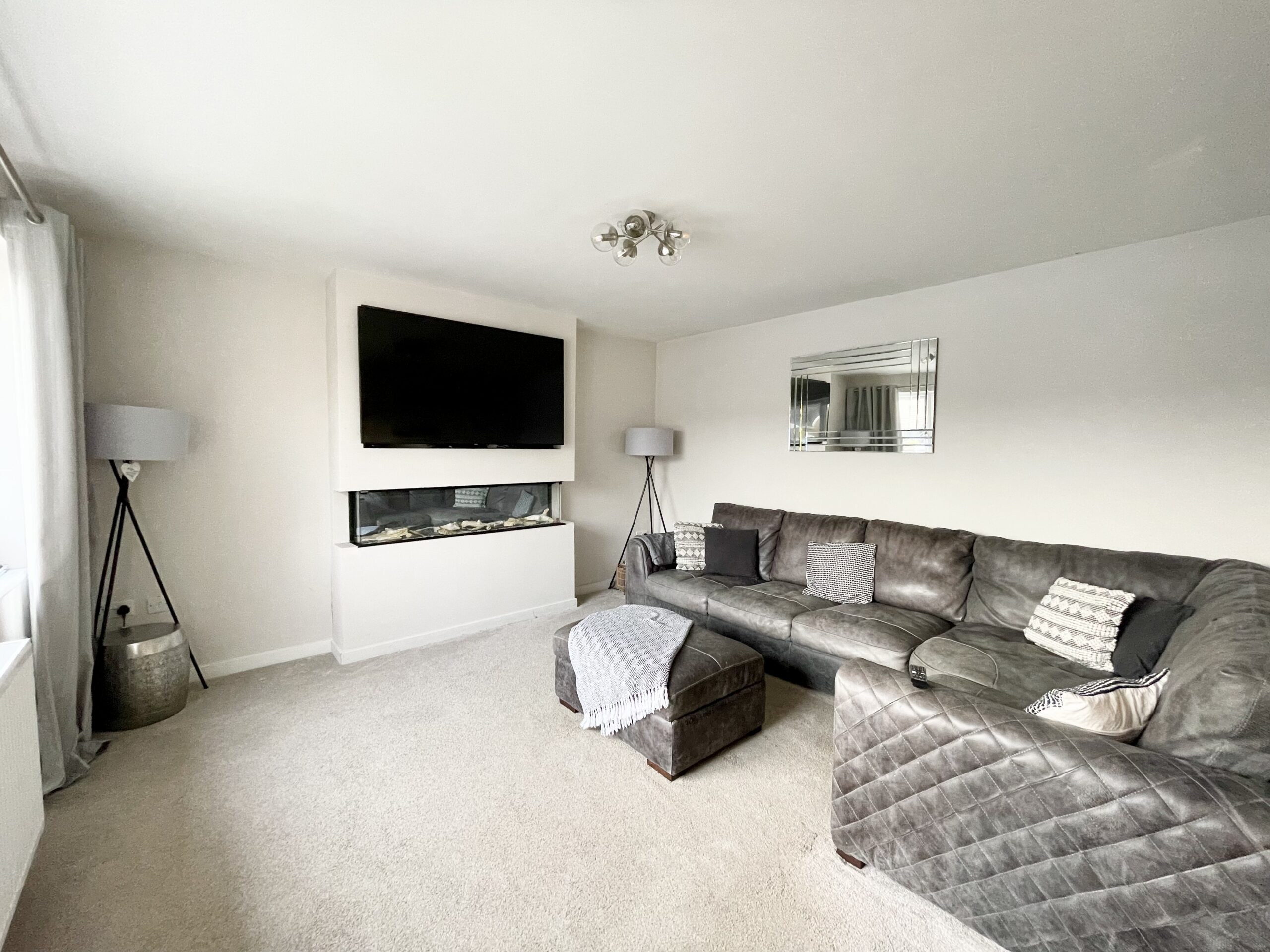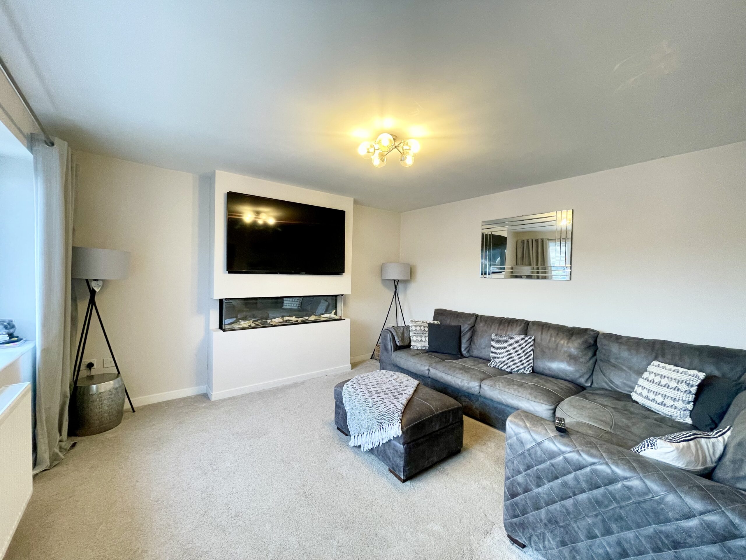 The front-facing lounge benefits from carpeted flooring, a feature media wall, radiator and ceiling pendant