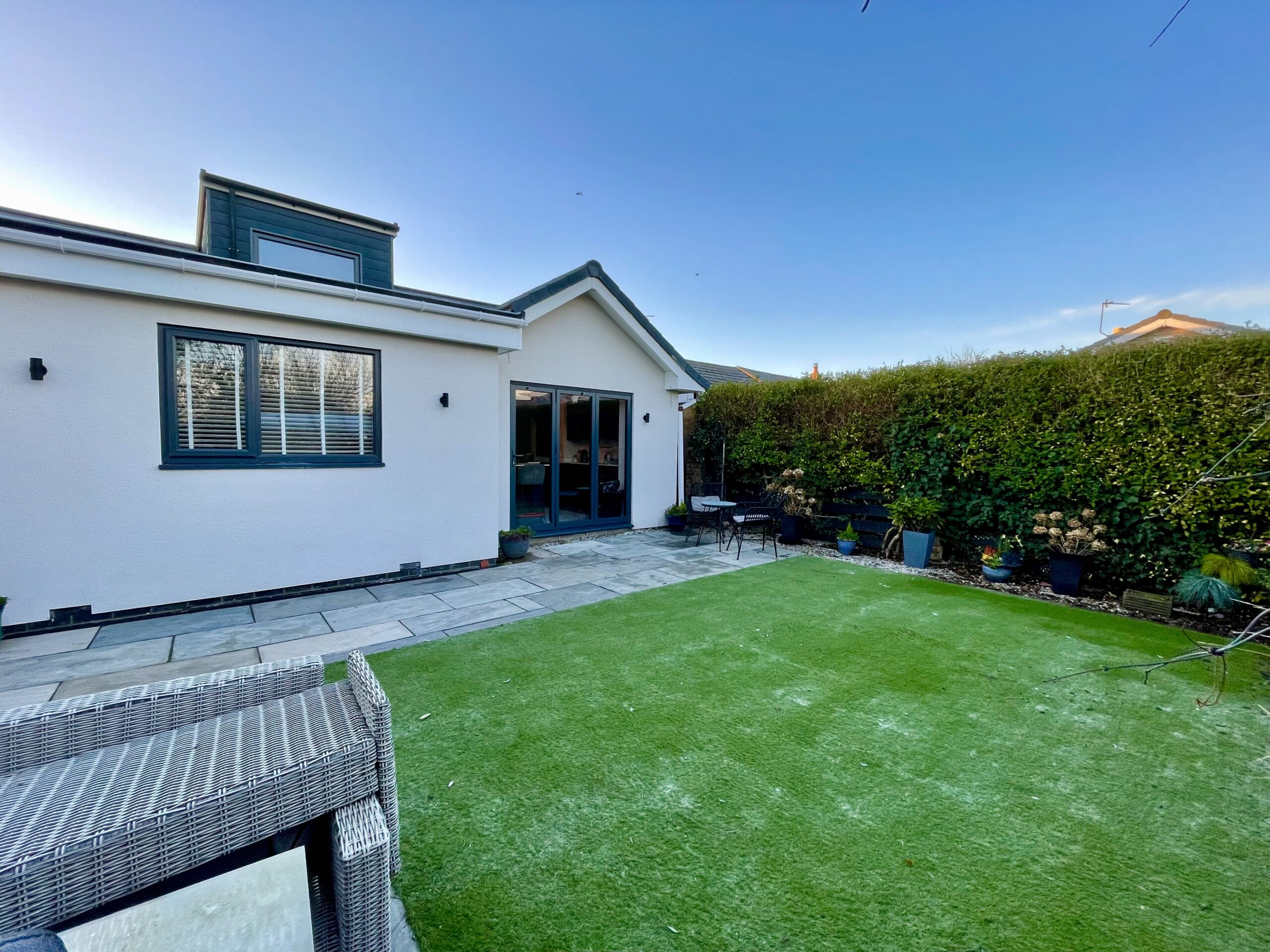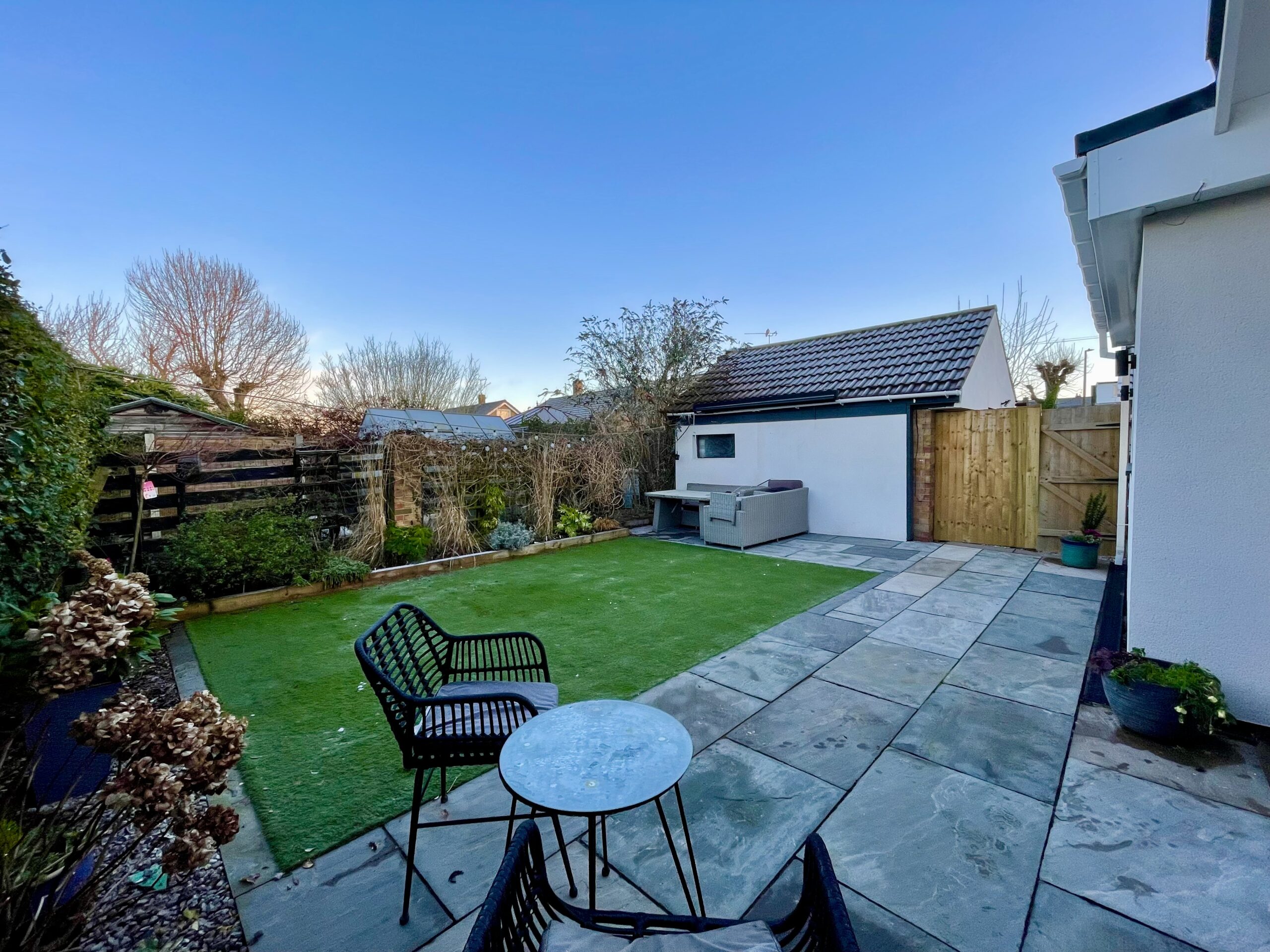 The rear garden features a patio area, artificial lawn, established shrub borders and a large garden store