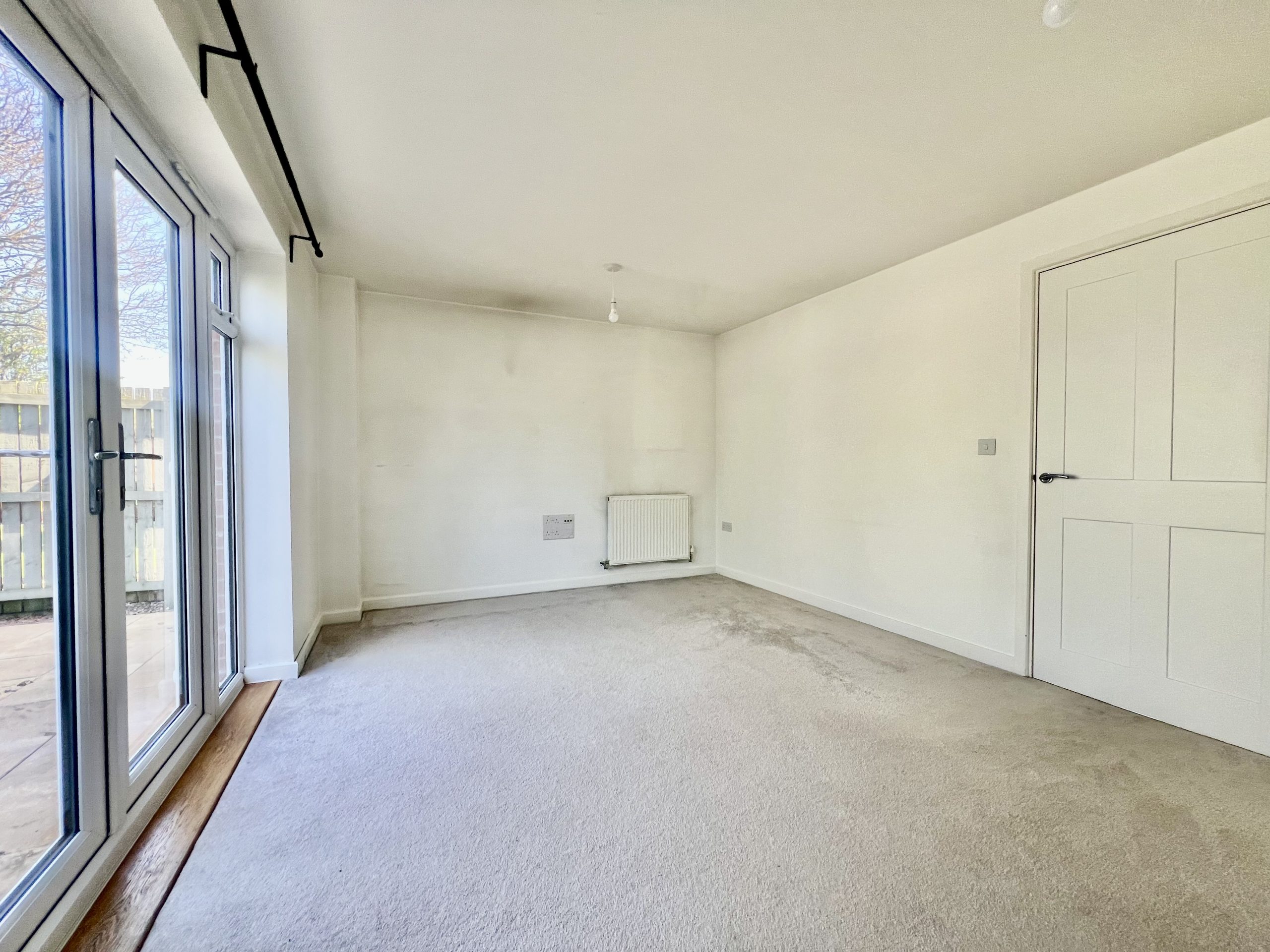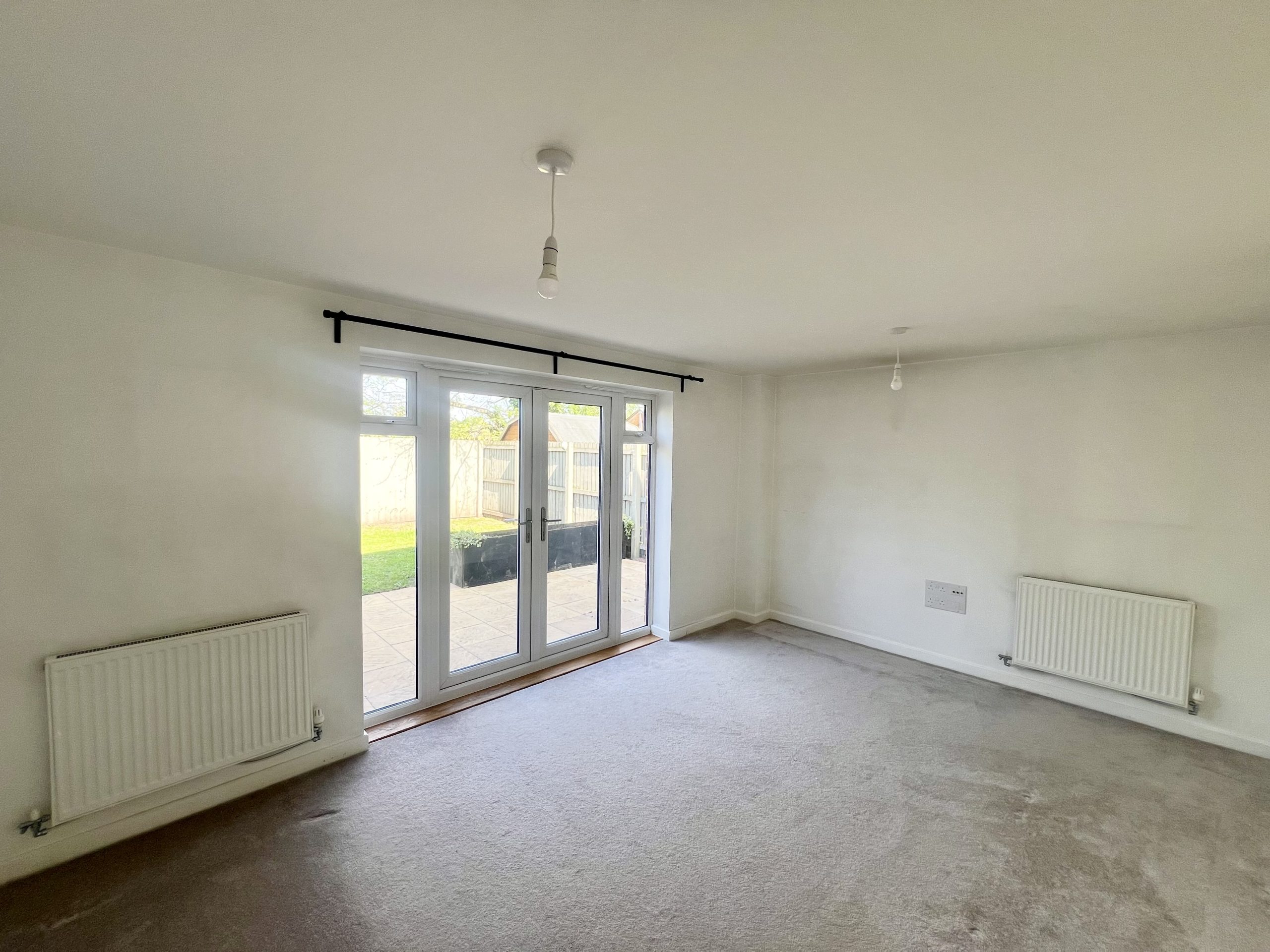 The lounge is situated at the rear of the property, the lounge benefits from French doors opening onto the patio and enclosed rear garden, enhancing natural light and providing a pleasant outlook. The room is finished with fitted carpeting, a radiator, and two pendant light fittings, creating a comfortable and well-presented space ideal for relaxation and everyday living.